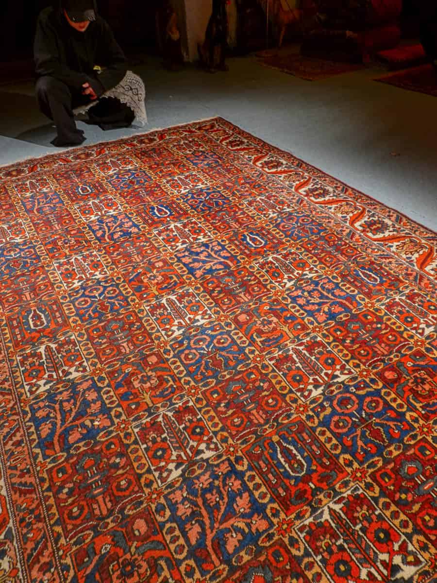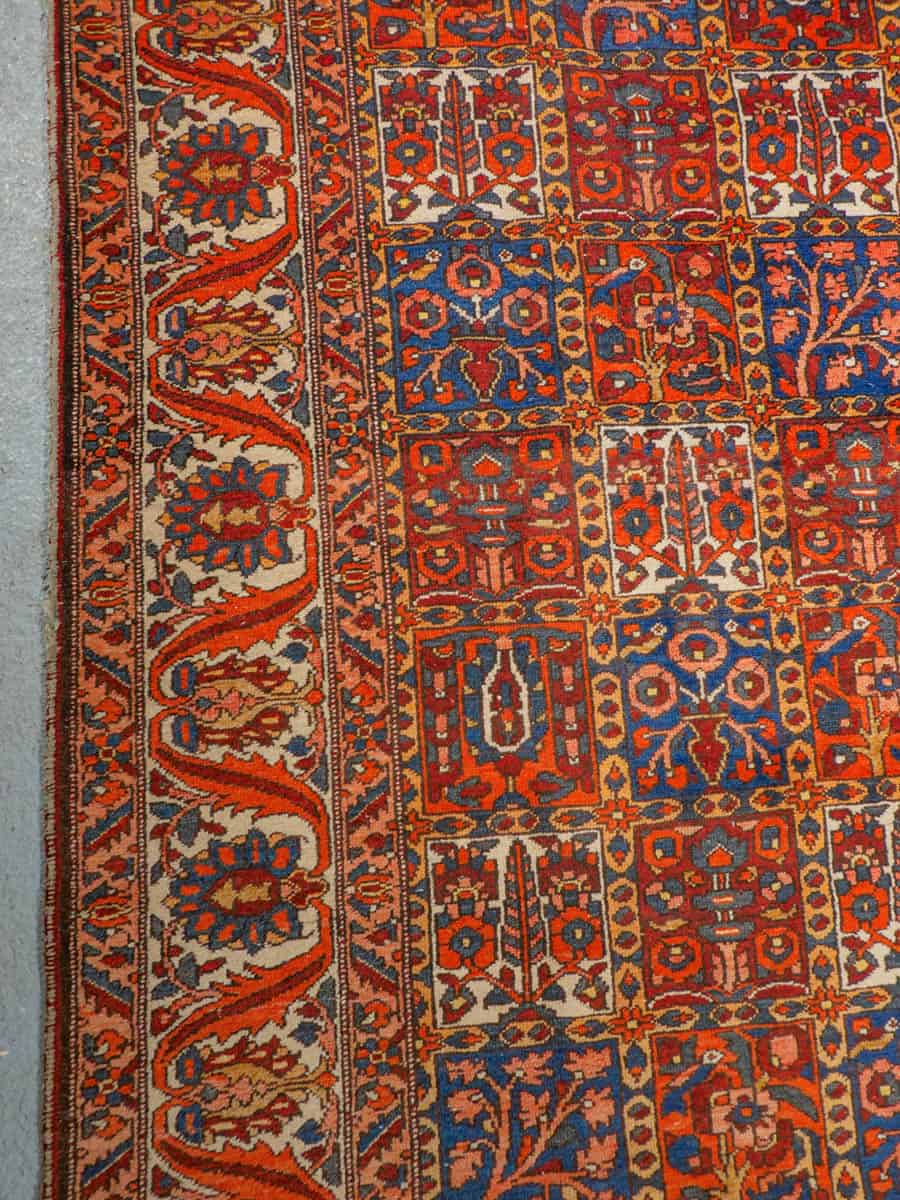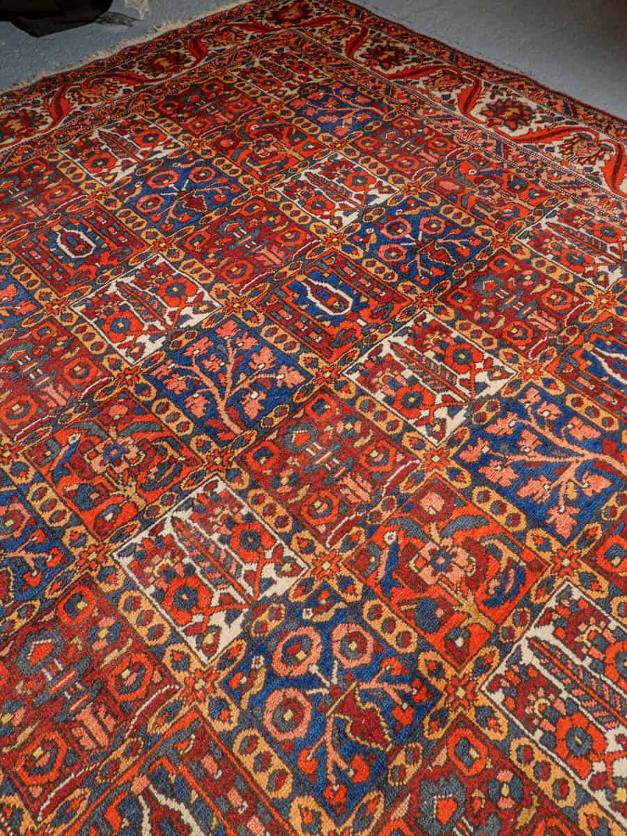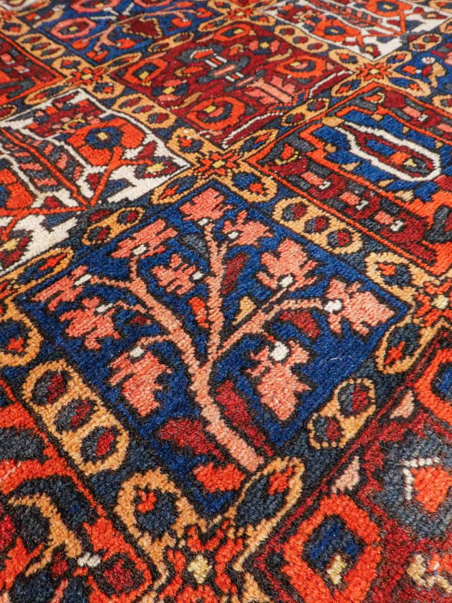 Näyttävän koristeellinen Bahtijaari kauniin rauhallisella värimaailmalla ja tyylikkään perinteisellä kuvioinnilla. Käsinsolmittu villasta.