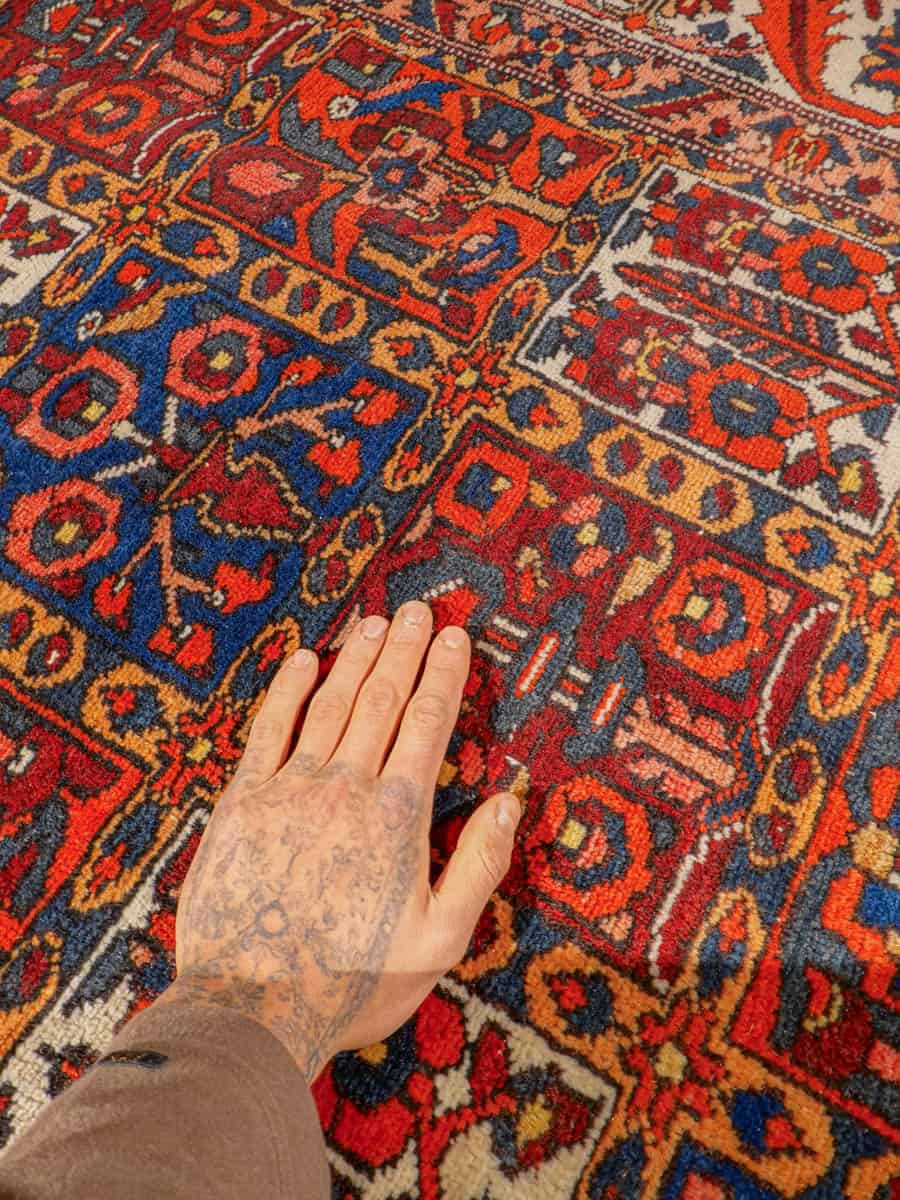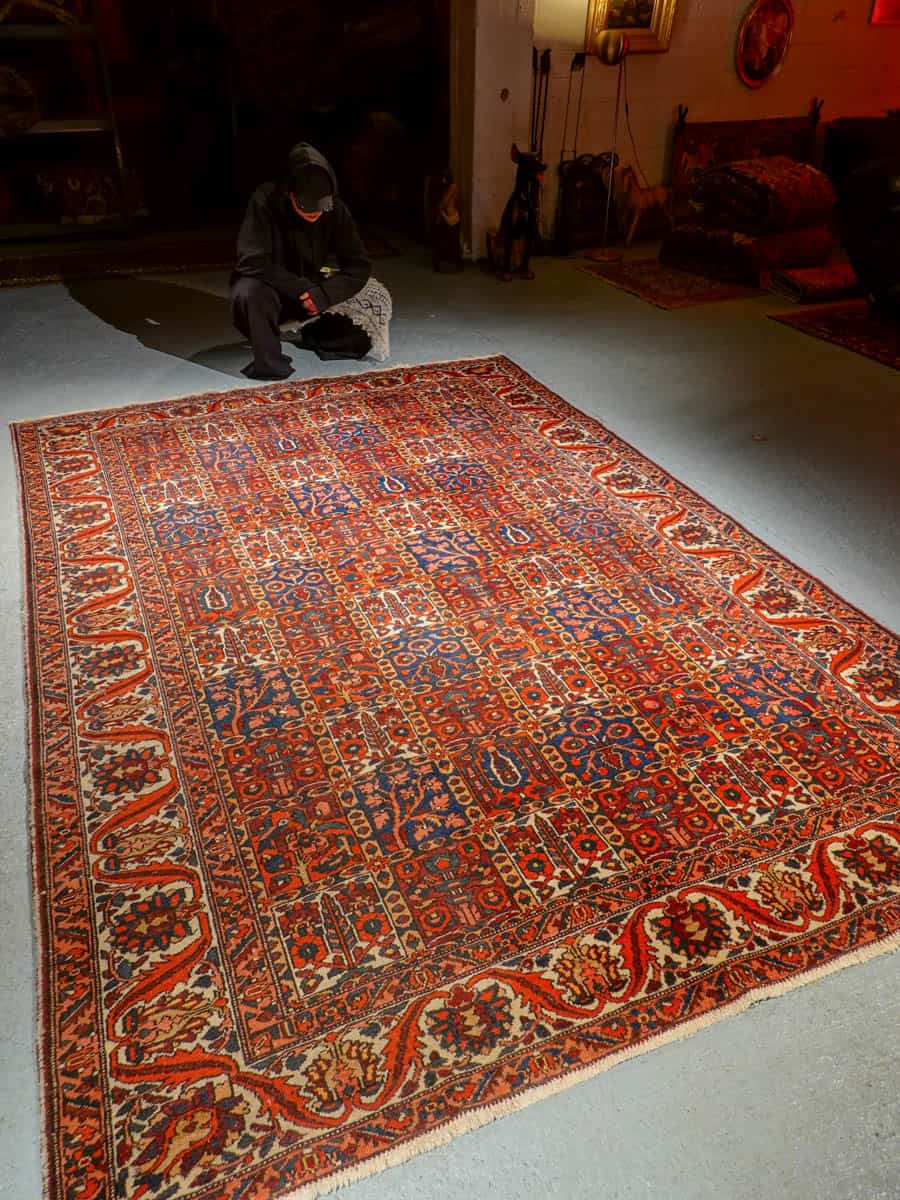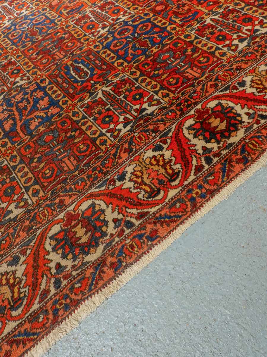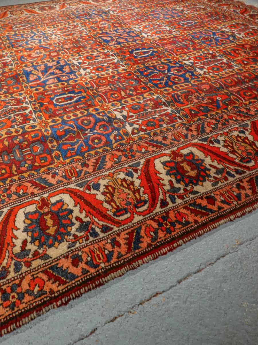 Näyttävän koristeellinen Bahtijaari kauniin rauhallisella värimaailmalla ja tyylikkään perinteisellä kuvioinnilla. Käsinsolmittu villasta.