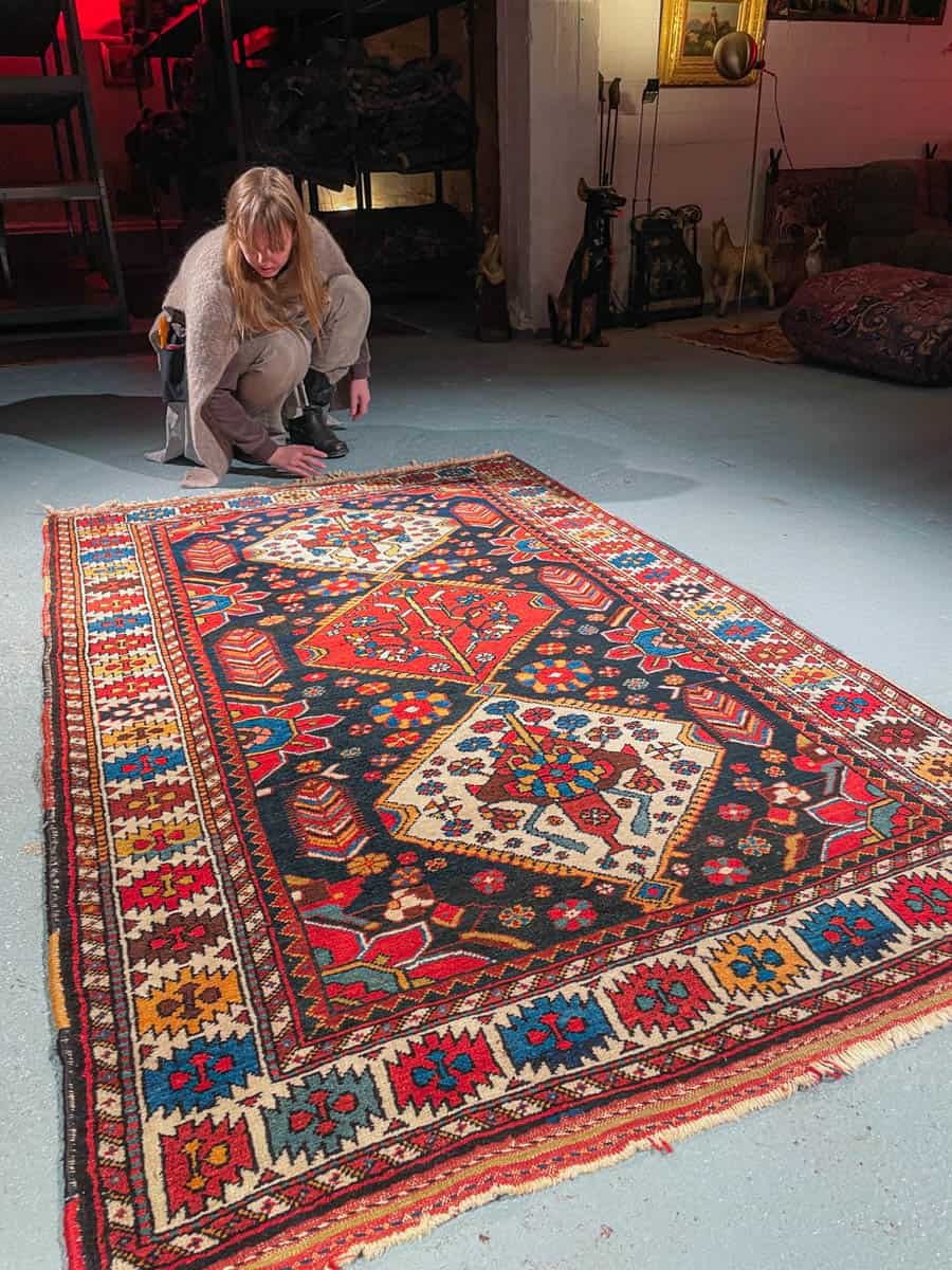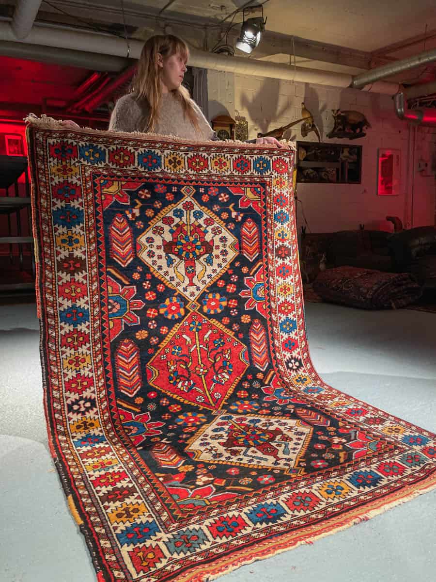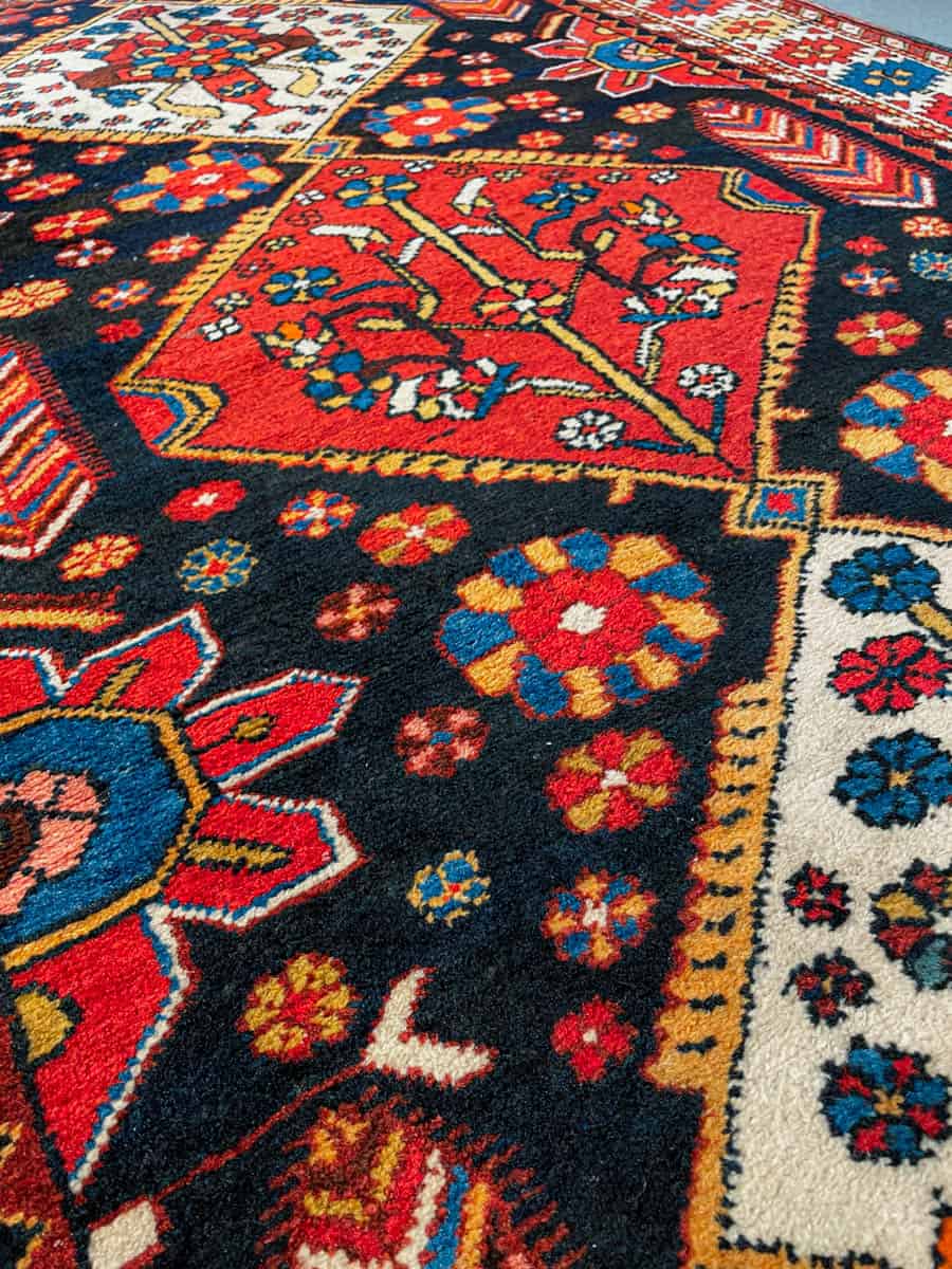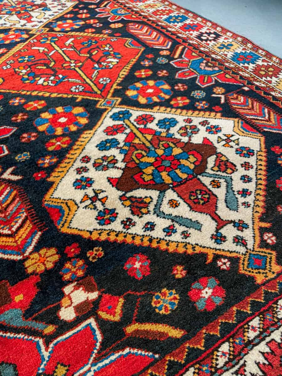 Henkeäsalpaava Bahtijaari, jonka tumma tausta korostaa runsaan monisävyisiä geometrisiä kuvioita, tehden vaikutelmasta lähes kolmiulotteisen. Käsinsolmittu villasta n. 40-50 vuotta sitten.