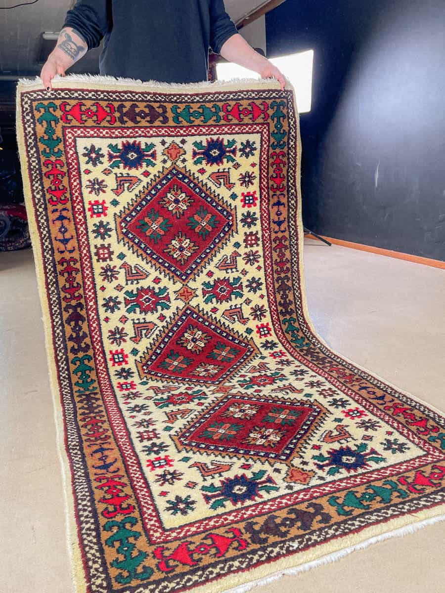 Kotoisa Gasghai geometrisella kuvioinnilla ja perinteisillä väreillä. Käsinsolmittu villasta.