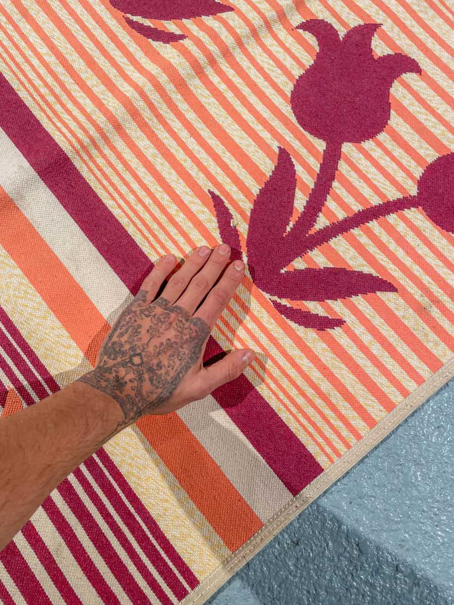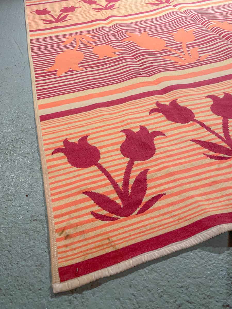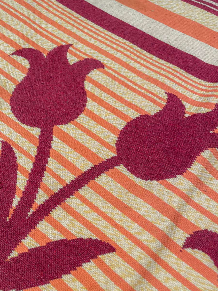 Kotoisa Kelim kukkais- ja raitakuvioinnilla. Käsinkudottu villasta.
