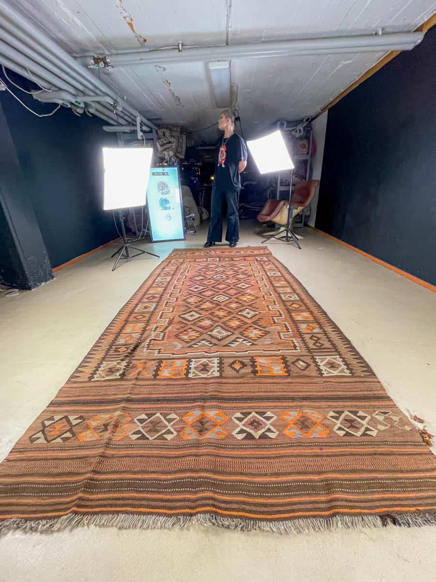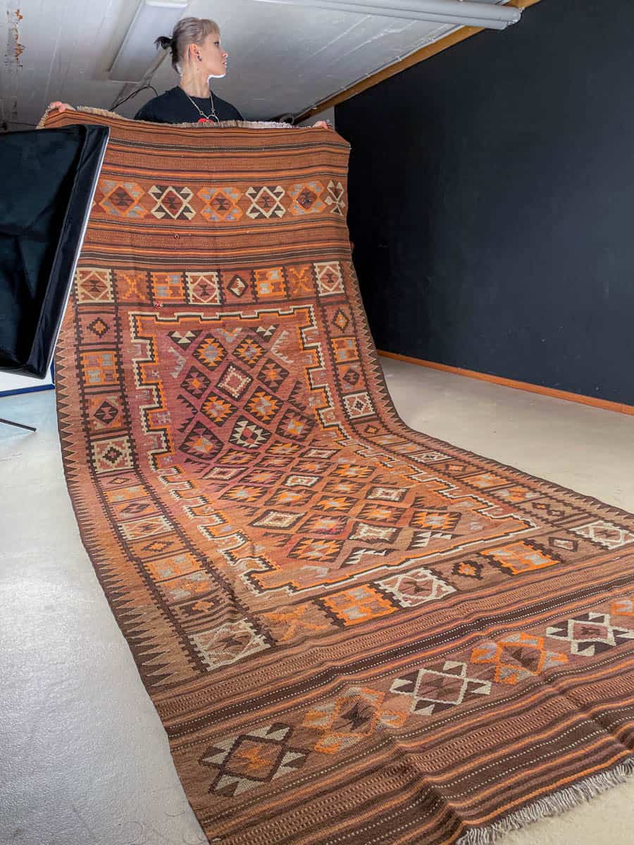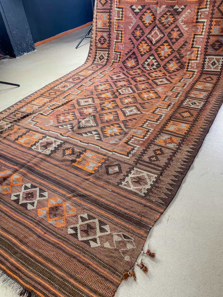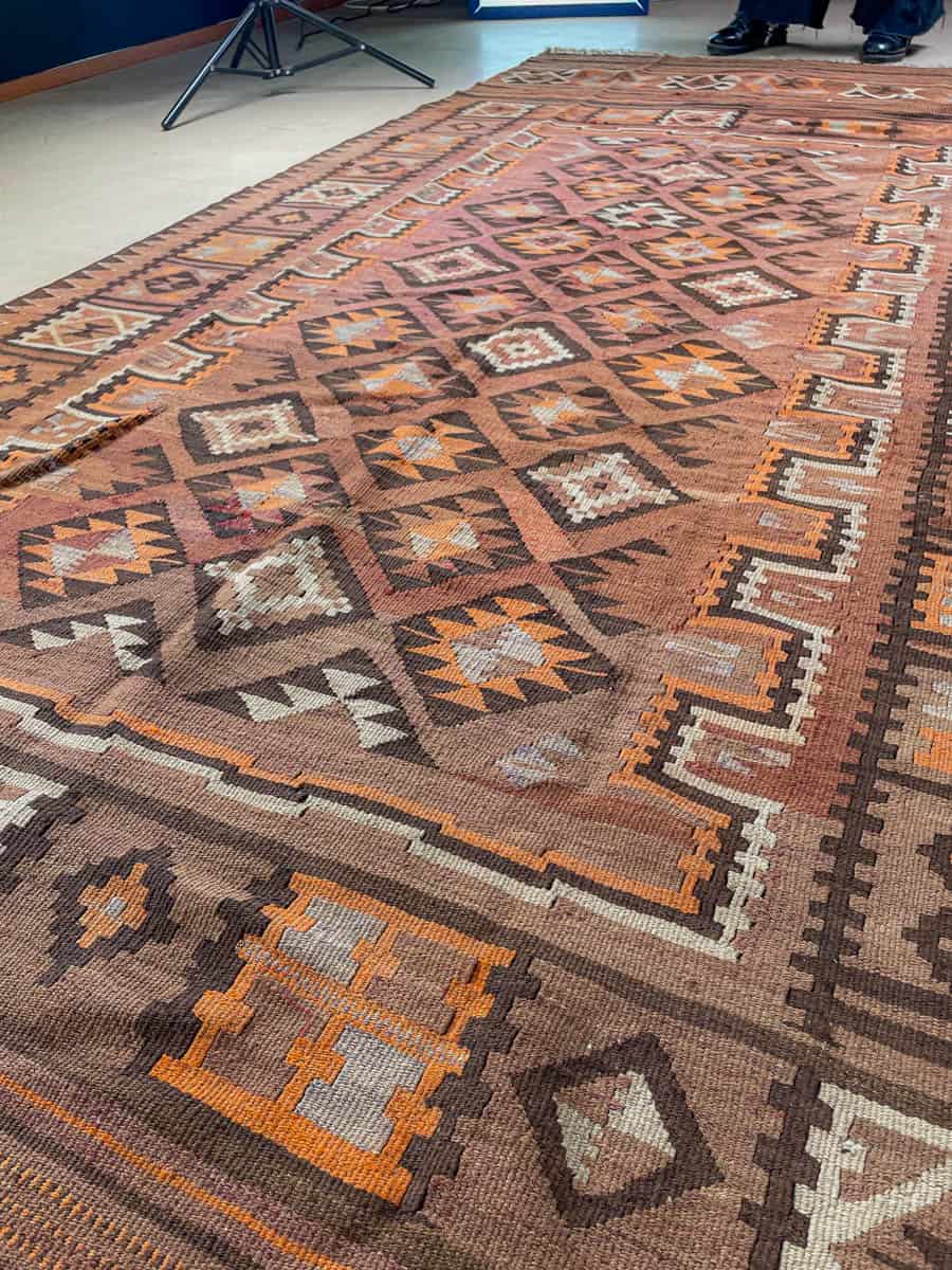 Tämä matto sijaitsee Töölön varastollamme – jos haluat tulla katsomaan sitä paikan päälle, sovithan näytön viestitse tai puhelimitse.