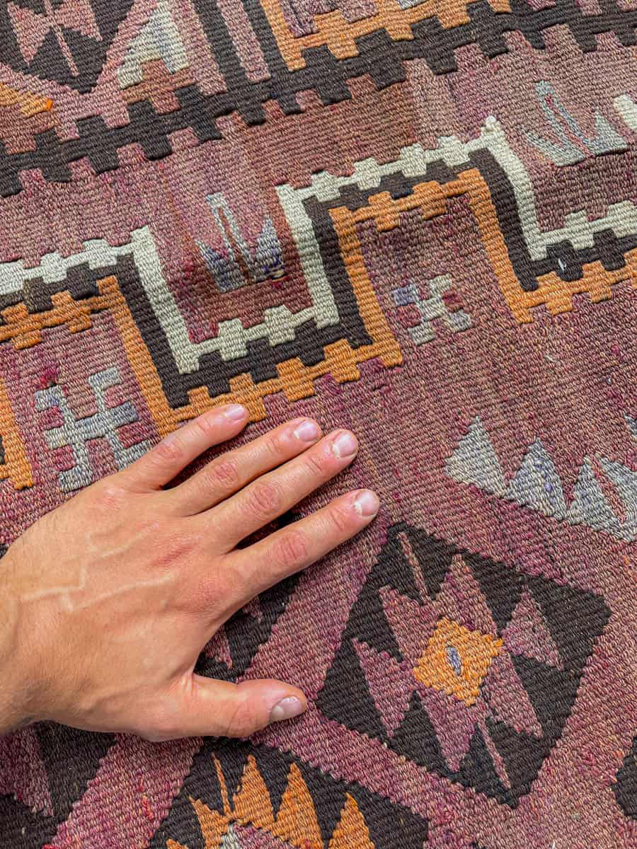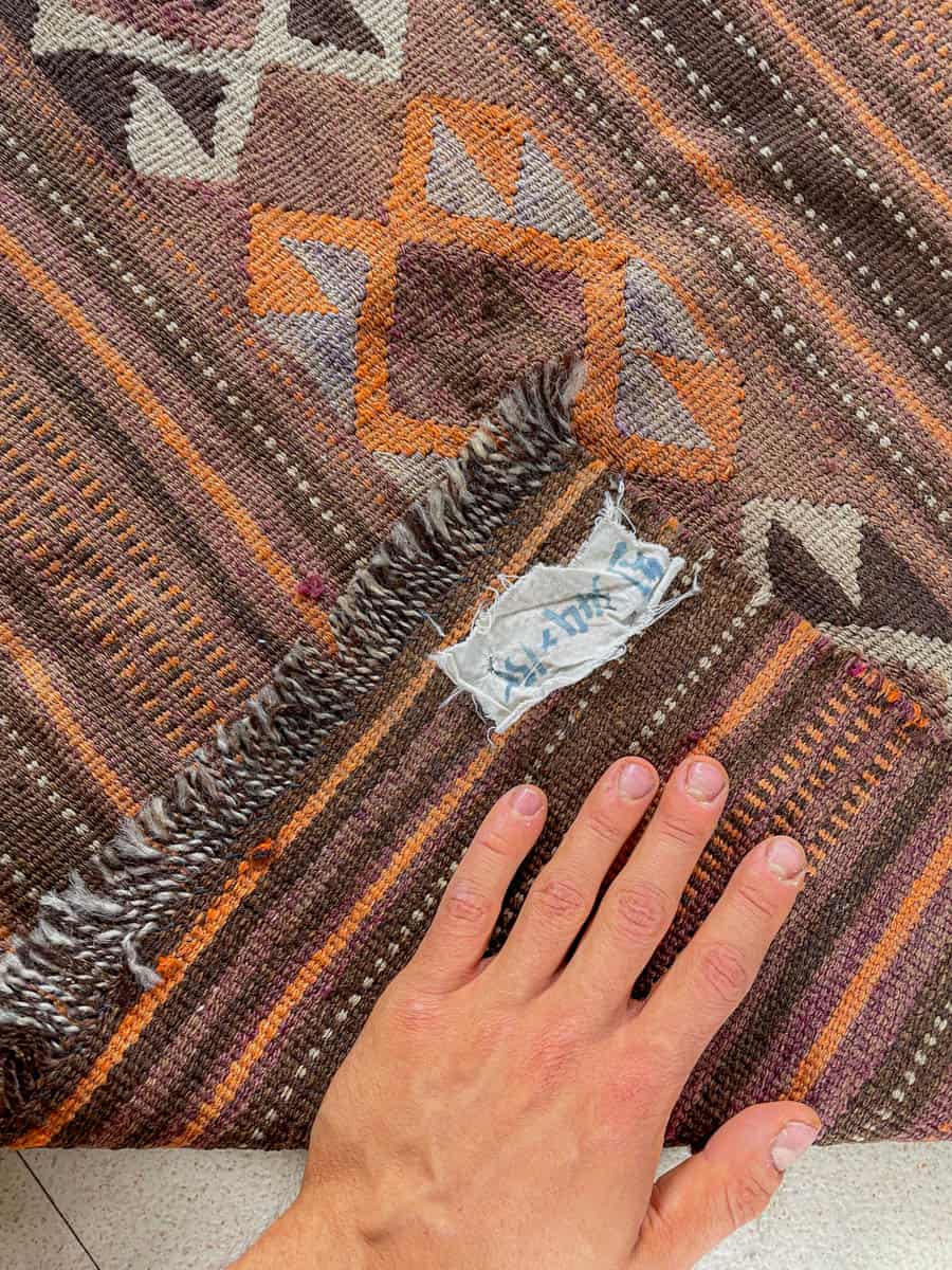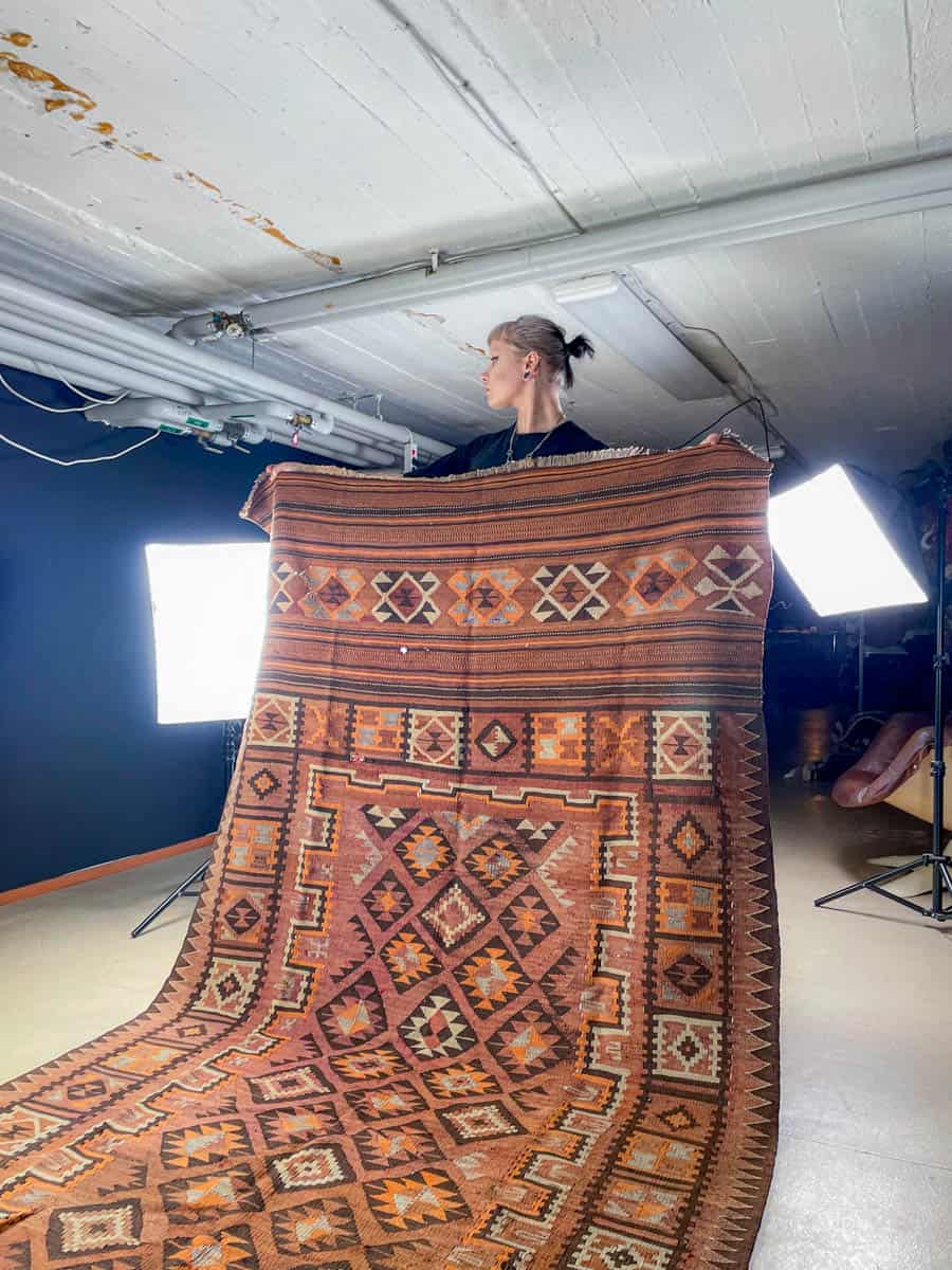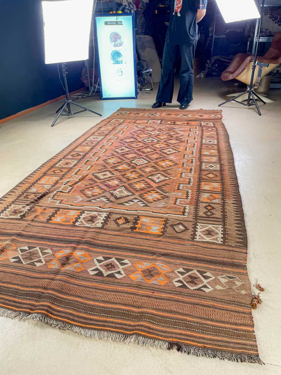 Tämä matto sijaitsee Töölön varastollamme – jos haluat tulla katsomaan sitä paikan päälle, sovithan näytön viestitse tai puhelimitse.