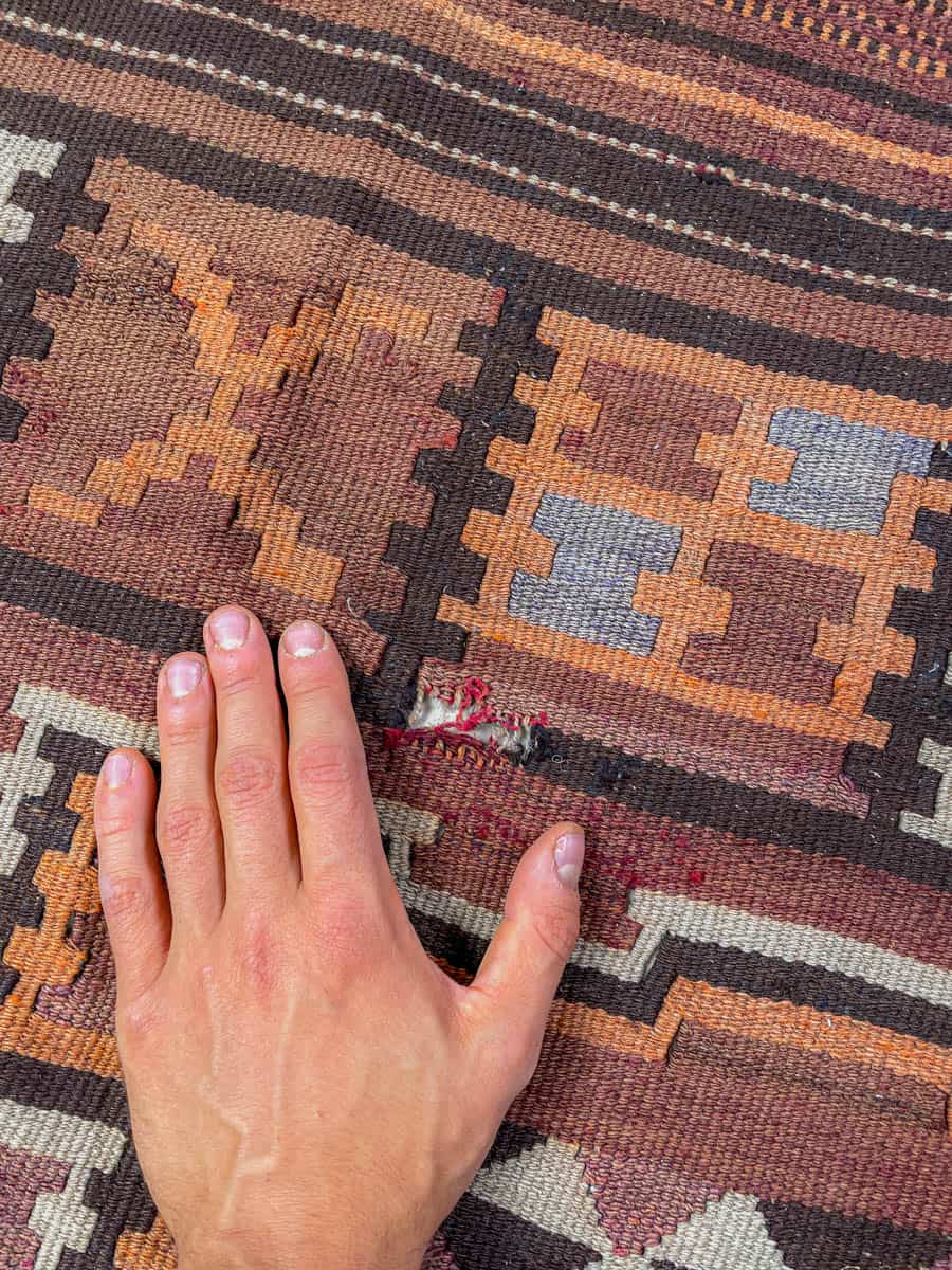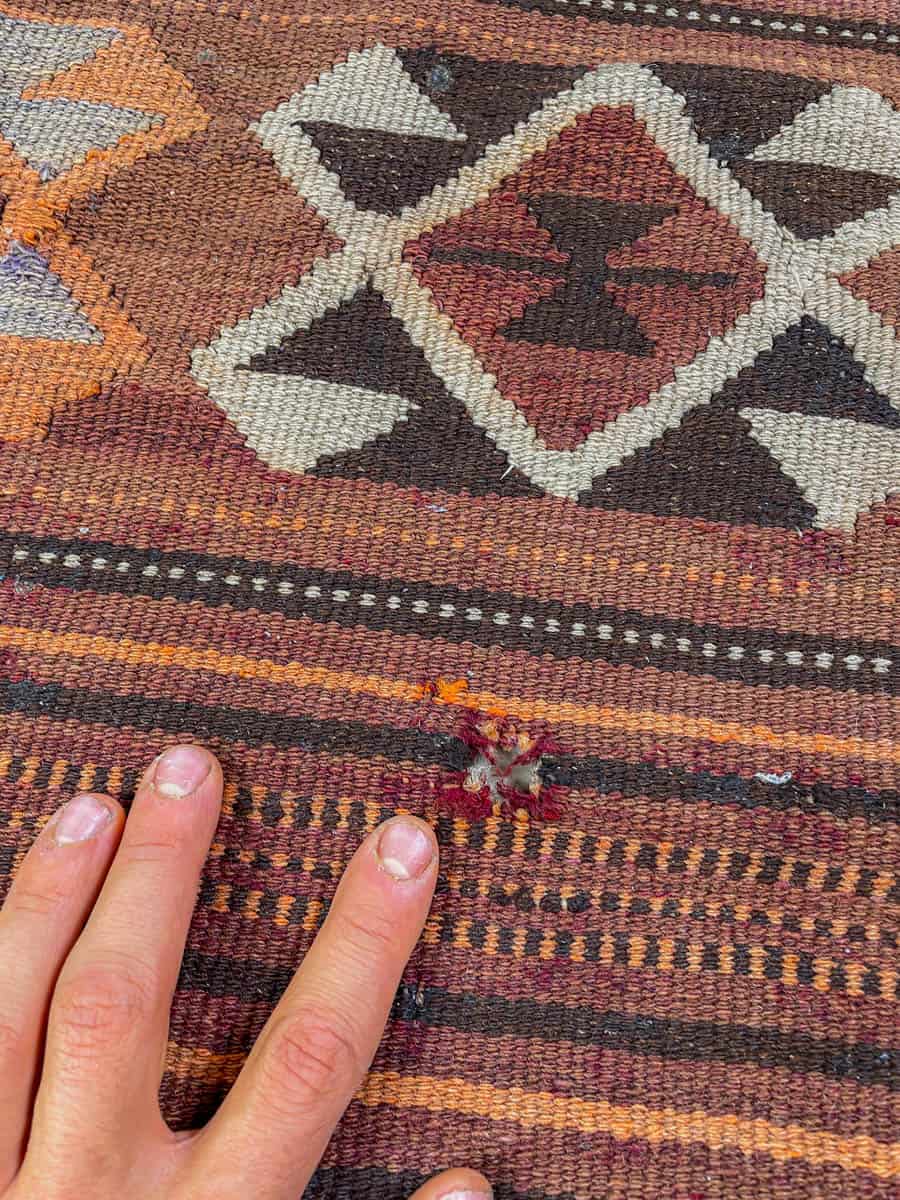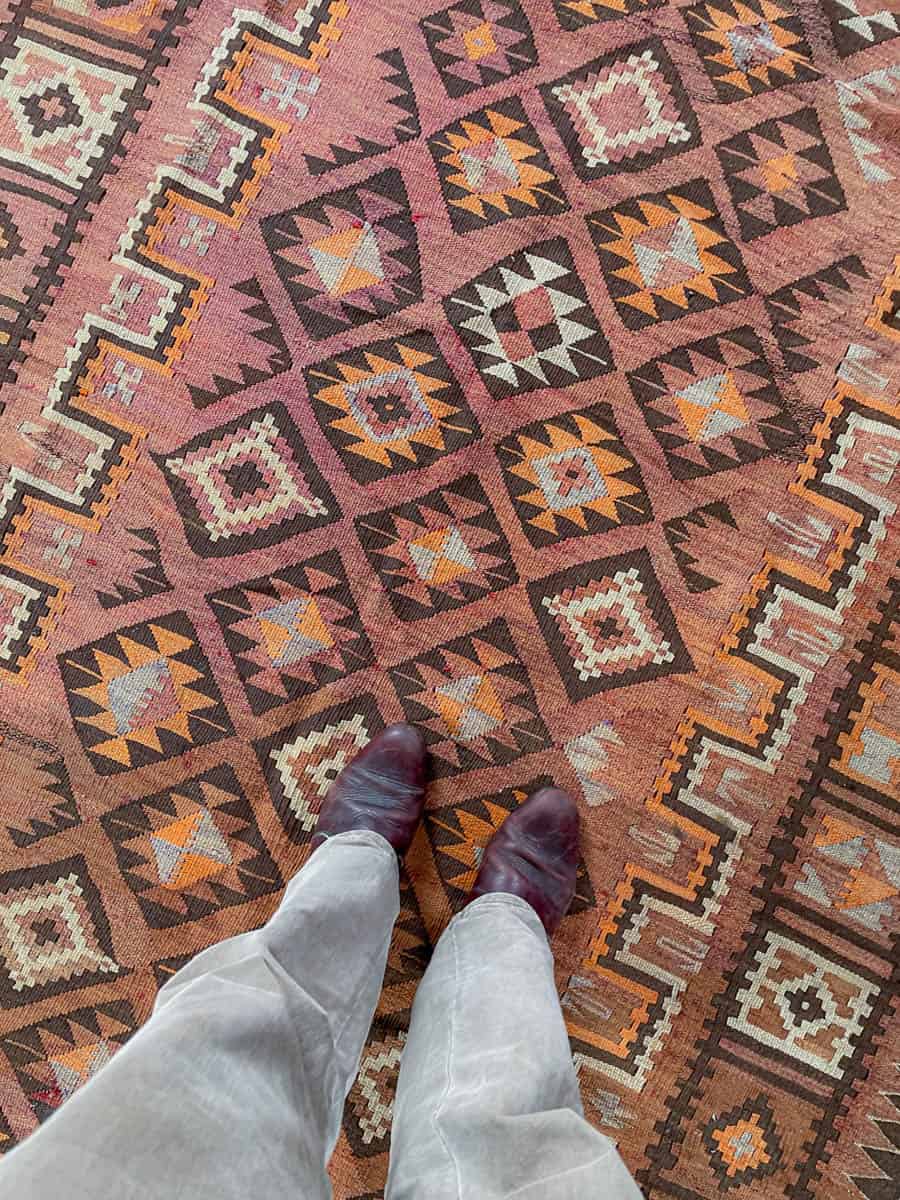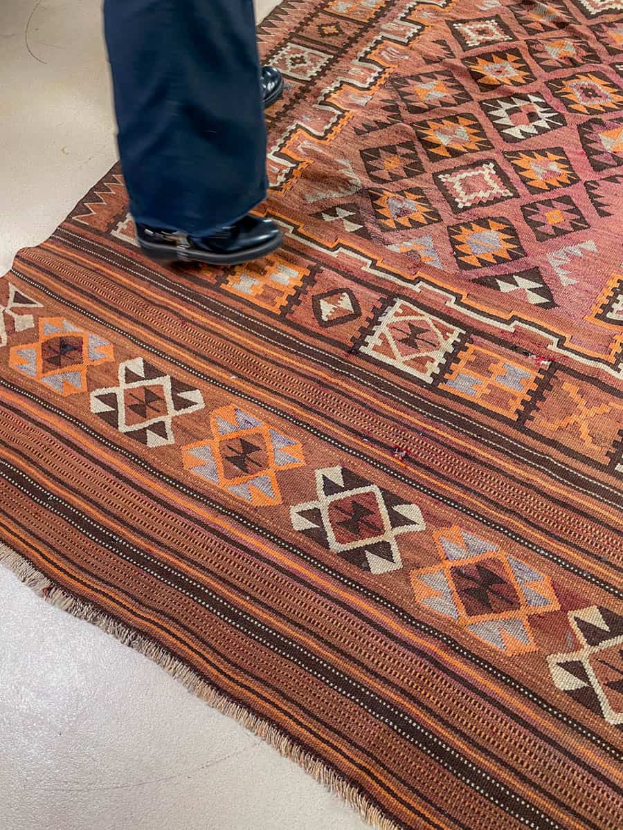 Tämä matto sijaitsee Töölön varastollamme – jos haluat tulla katsomaan sitä paikan päälle, sovithan näytön viestitse tai puhelimitse.