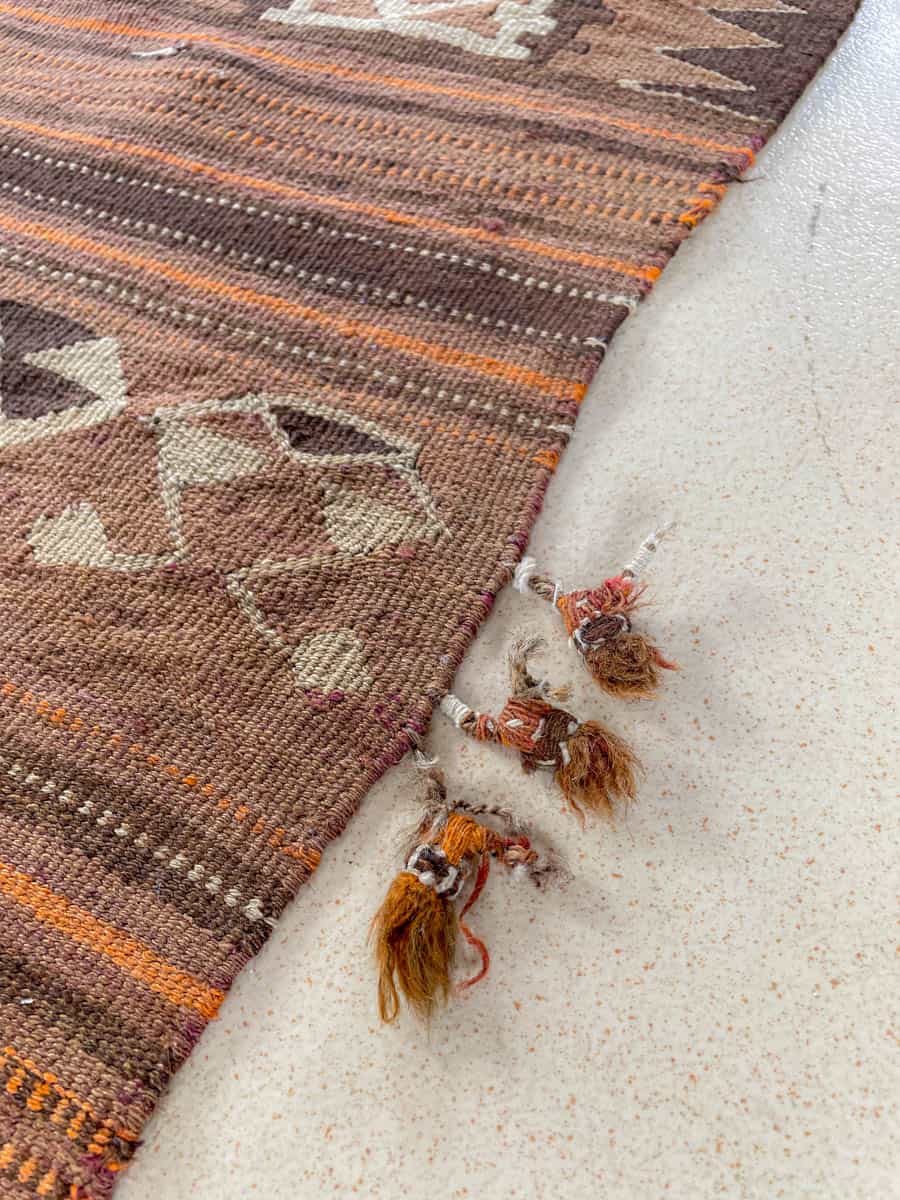 Kotoisa Kelim rauhoittavan harmonisella väriteemalla. Käsinkudottu villasta.