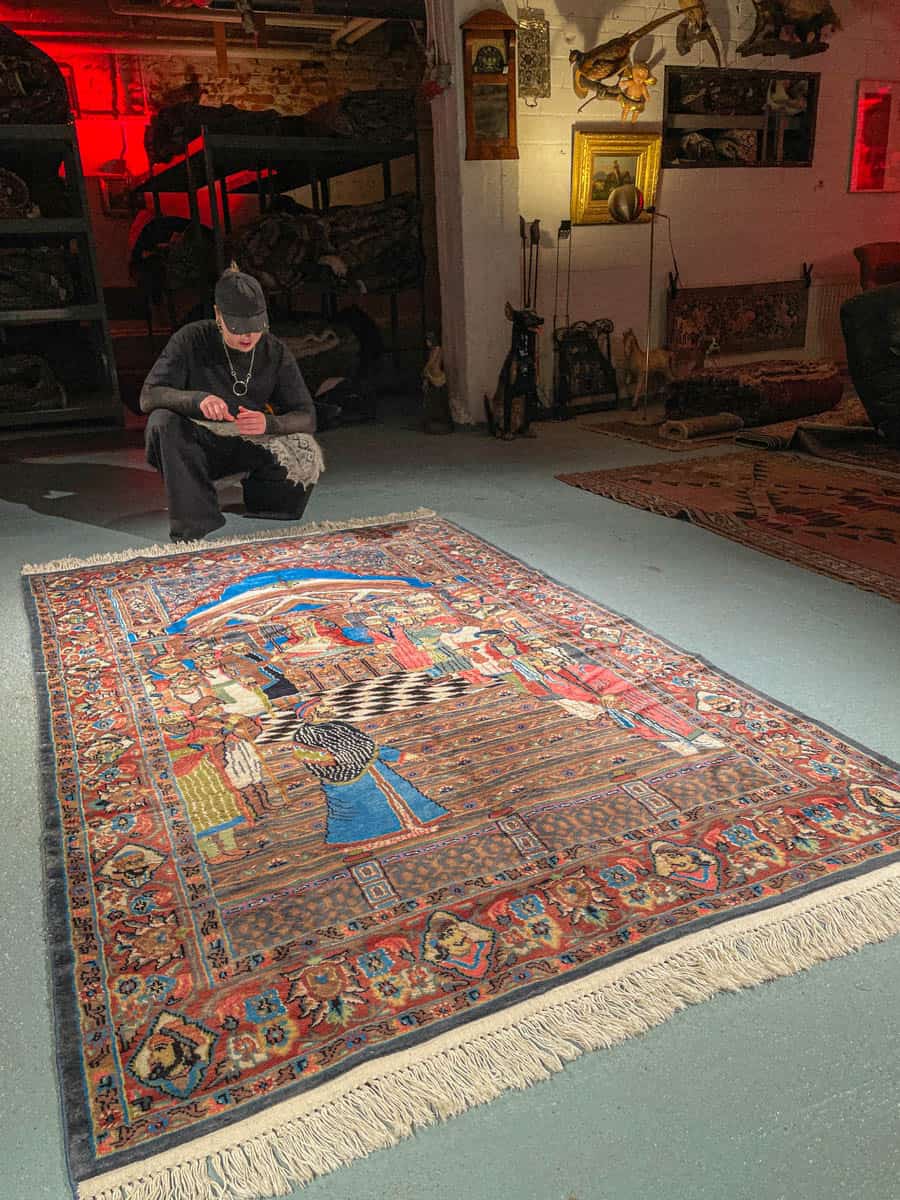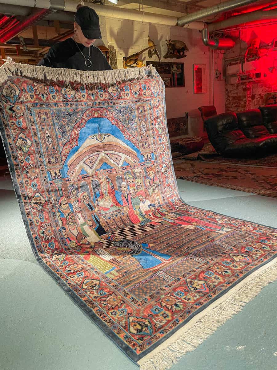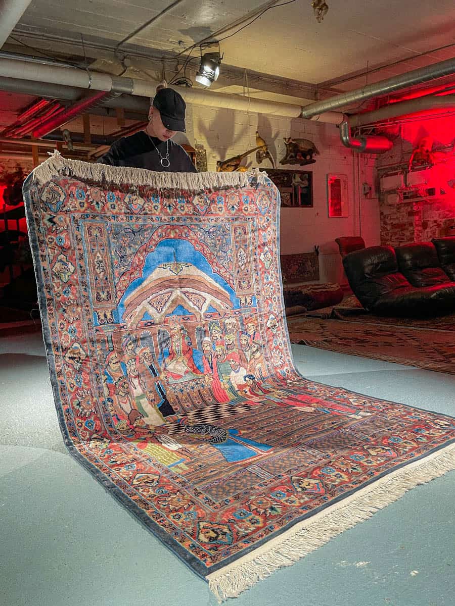 Tämä matto sijaitsee Töölön varastollamme – jos haluat tulla katsomaan sitä paikan päälle, sovithan näytön viestitse tai puhelimitse (Instagram @galleriamhelsinki, galleria@galleriam.fi, 0504394400).
