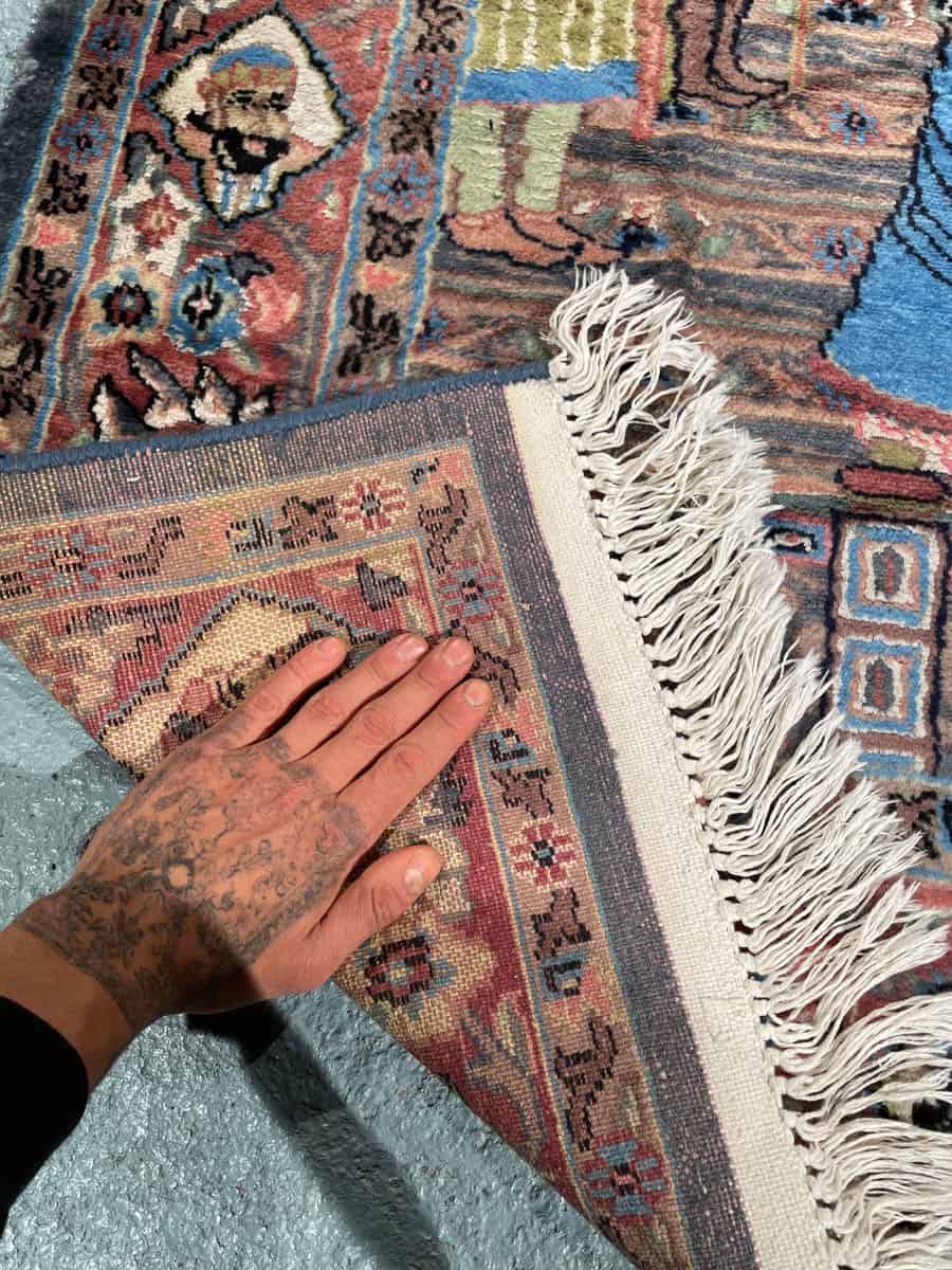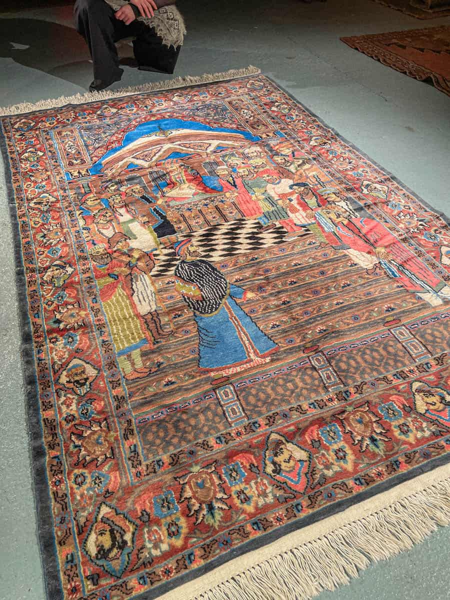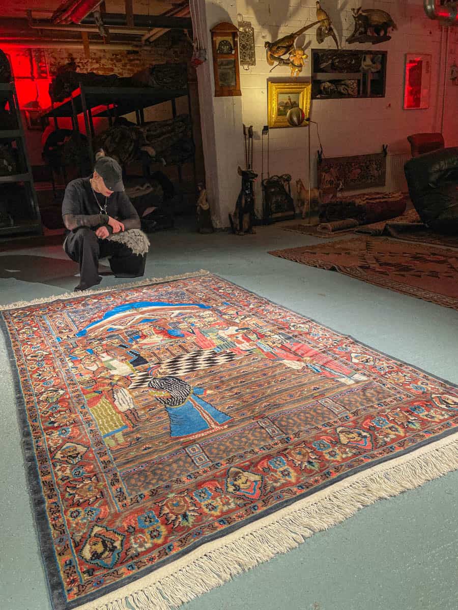 Tämä matto sijaitsee Töölön varastollamme – jos haluat tulla katsomaan sitä paikan päälle, sovithan näytön viestitse tai puhelimitse (Instagram @galleriamhelsinki, galleria@galleriam.fi, 0504394400).
