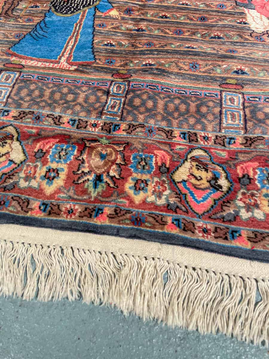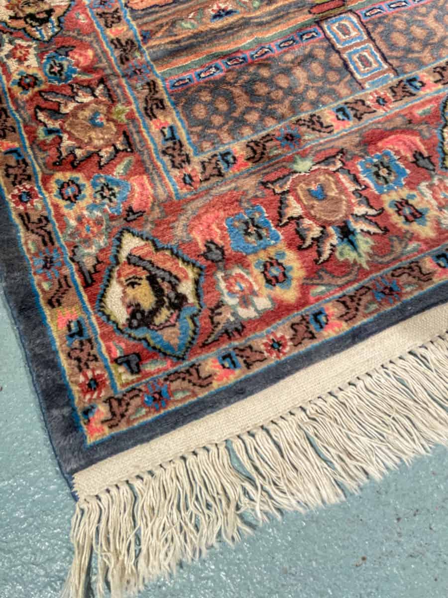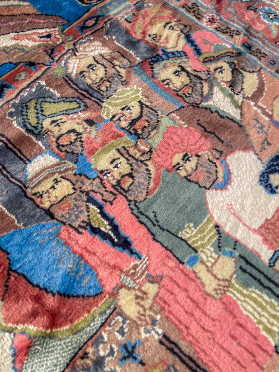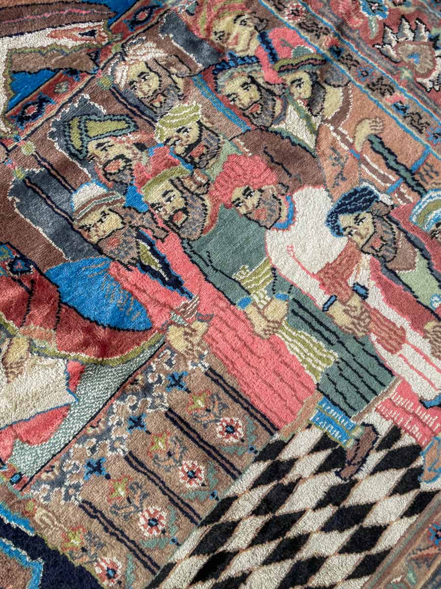 Valmistettu hienosta silkki–villa-sekoitteesta, joka tuo pinnalle ylellisen kiillon ja poikkeuksellisen pehmeän tuntuman. Matto on teknisesti ja kuvallisesti vaativa, ja tällaista tarinallista, figuuripainotteista kudontaa esiintyy harvemmin. Kunto on erinomainen.
