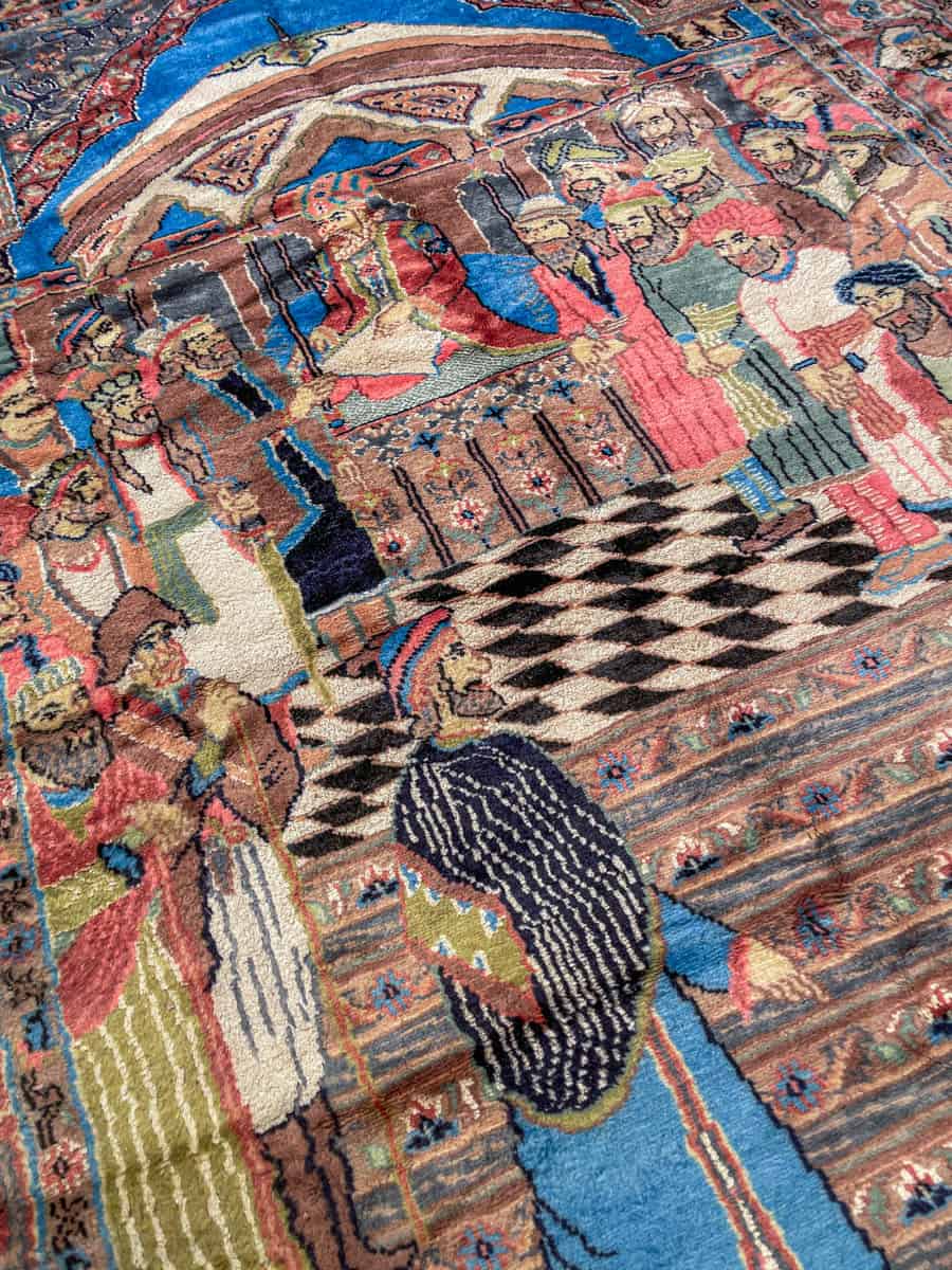 Erittäin yksityiskohtainen villasta ja silkistä käsinsolmittu upean ylellinen taideteos, jossa on esitetty seremoniallinen kohtaus kuninkaallisessa salissa.