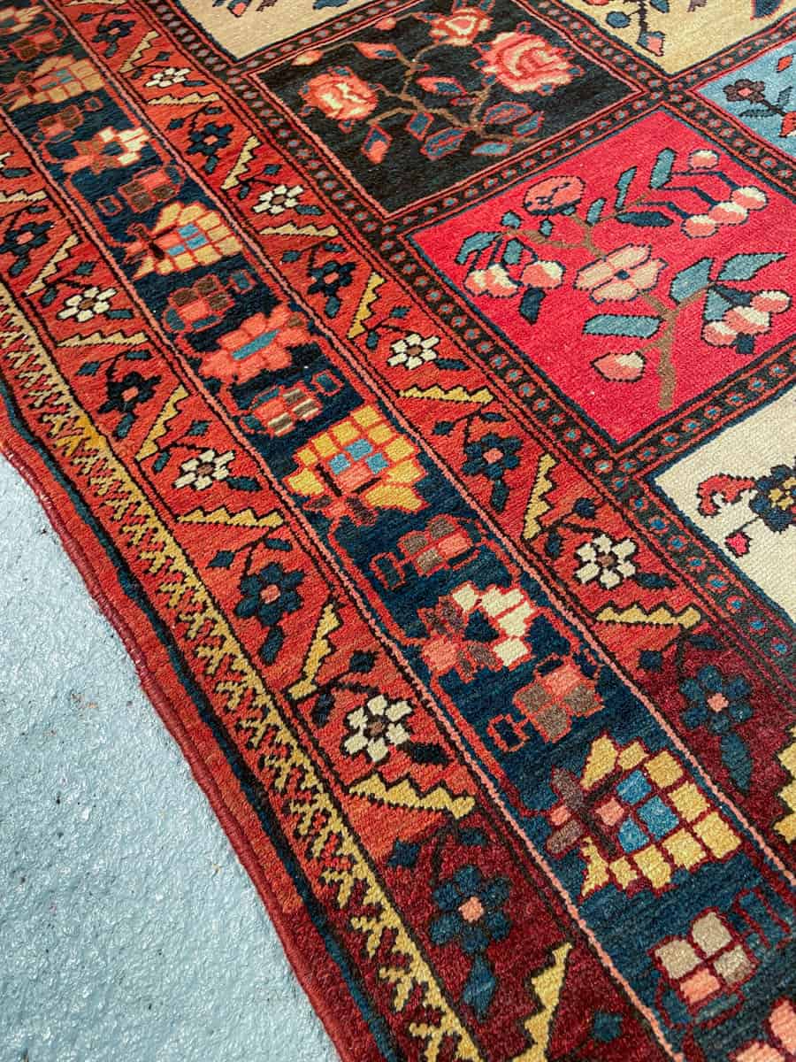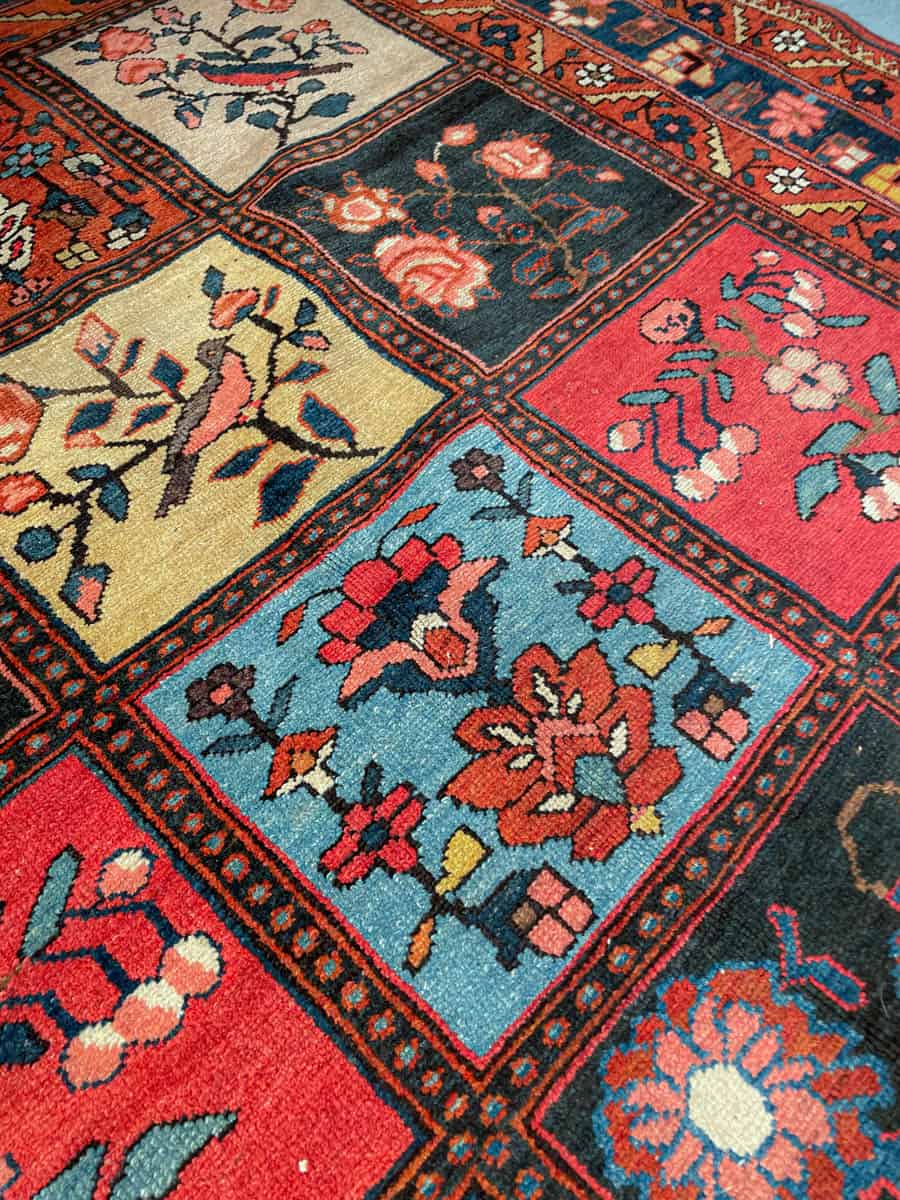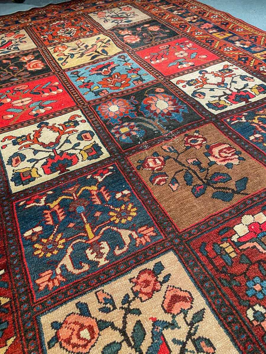 Hurmaava lämminsävyinen Bahtijaari ihanalla perinteisellä puutarhakuvioinnilla. Käsinsolmittu villasta n. 50-60 vuotta sitten.