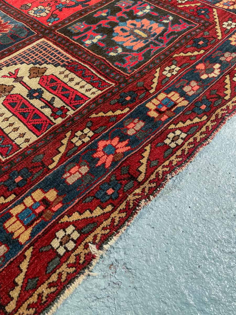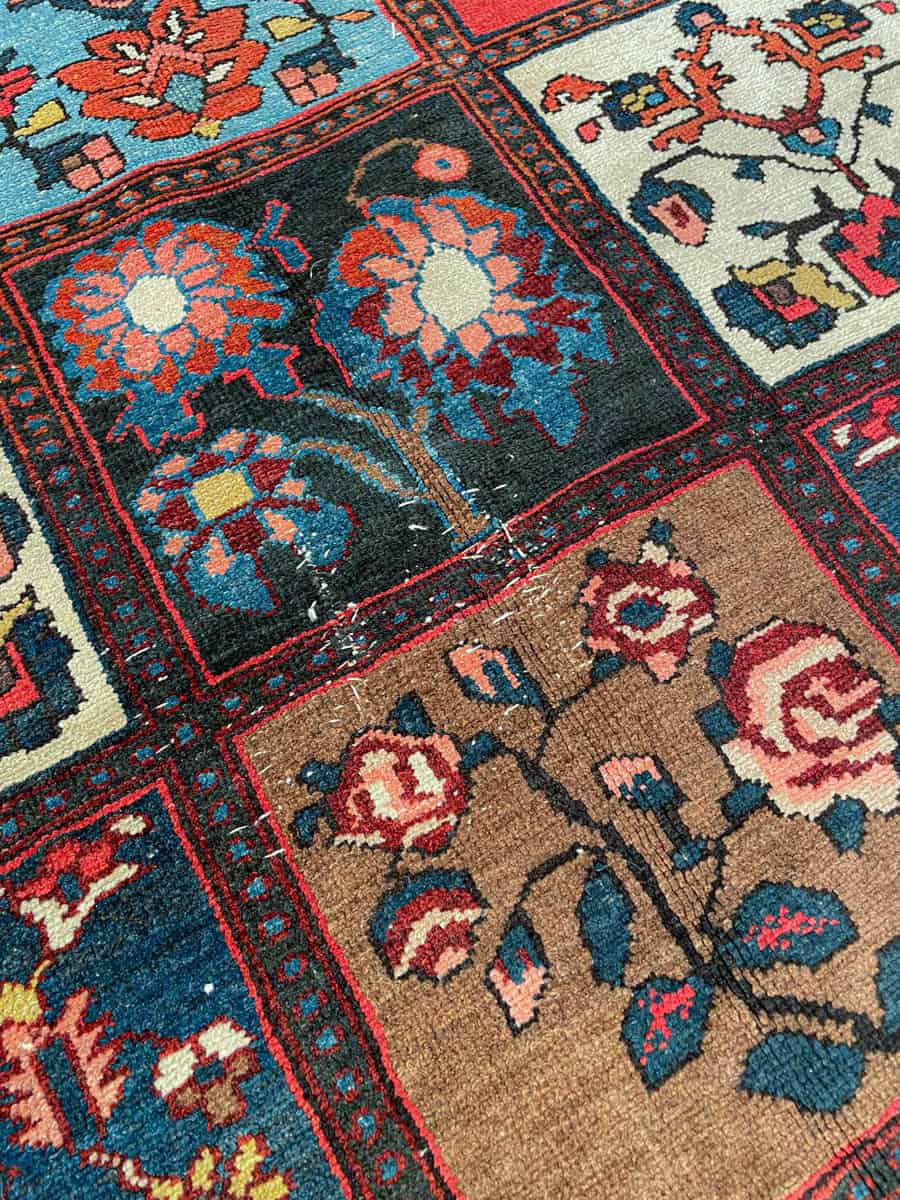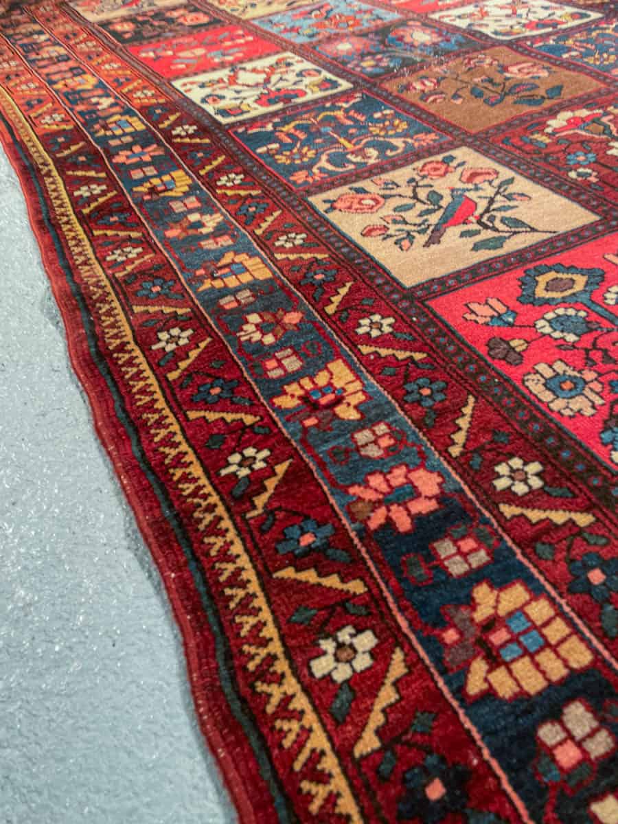 Hurmaava lämminsävyinen Bahtijaari ihanalla perinteisellä puutarhakuvioinnilla. Käsinsolmittu villasta n. 50-60 vuotta sitten.