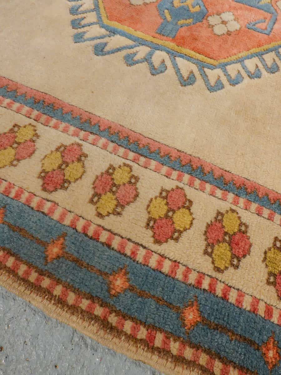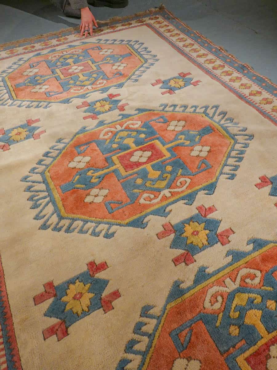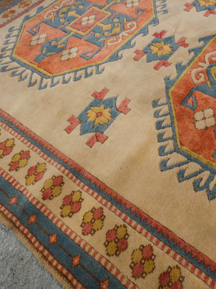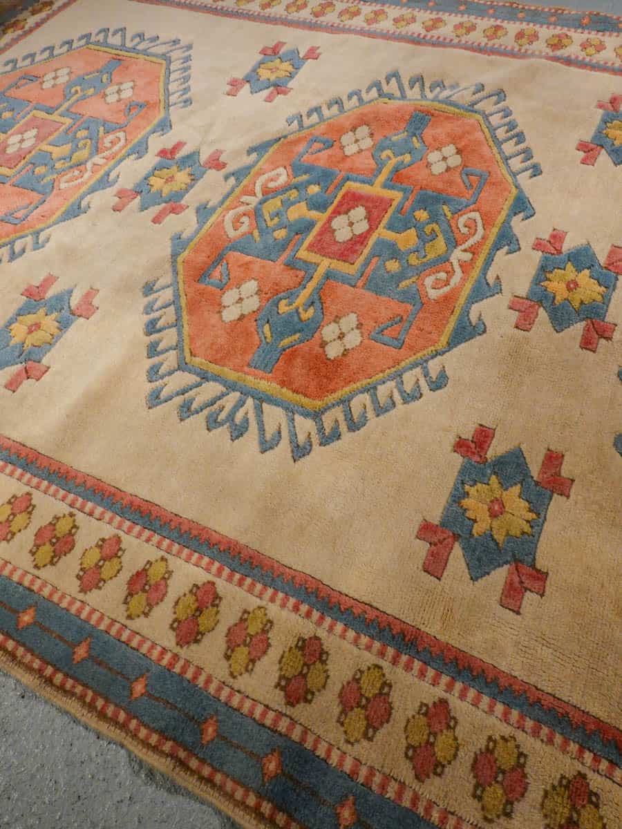 Kodikas kazakkimatto lempeän vaalealla värimaailmalla ja geometrisella kuvioinnilla. Käsinsolmittu villasta.
