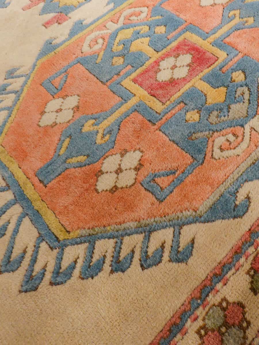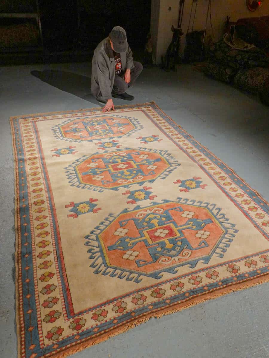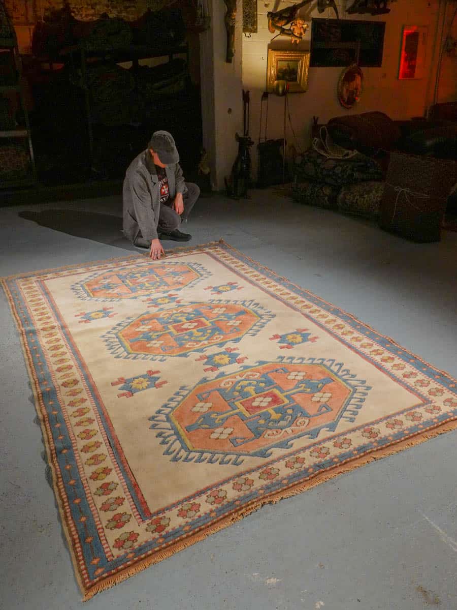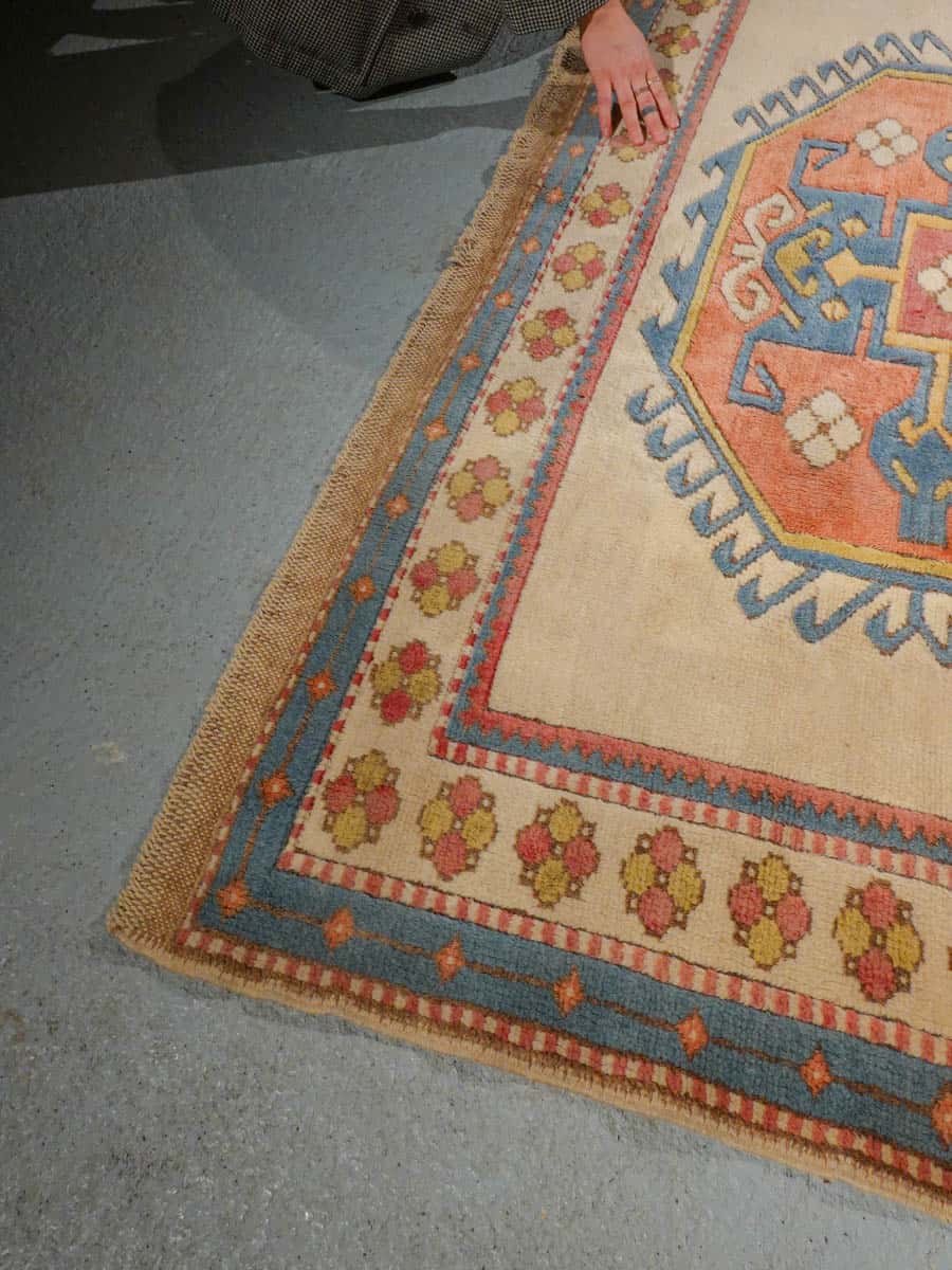 Kodikas kazakkimatto lempeän vaalealla värimaailmalla ja geometrisella kuvioinnilla. Käsinsolmittu villasta.