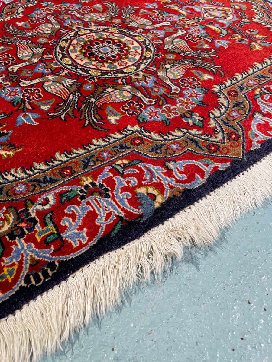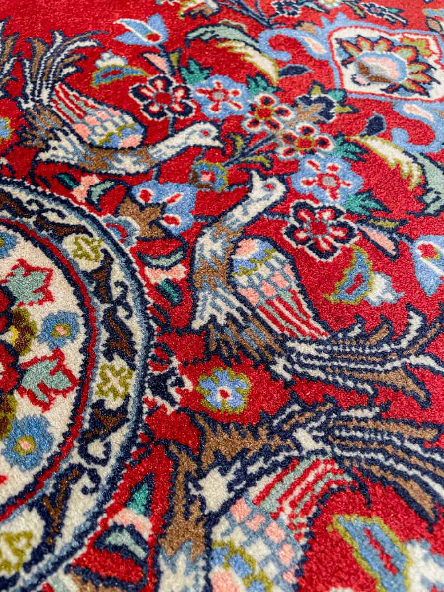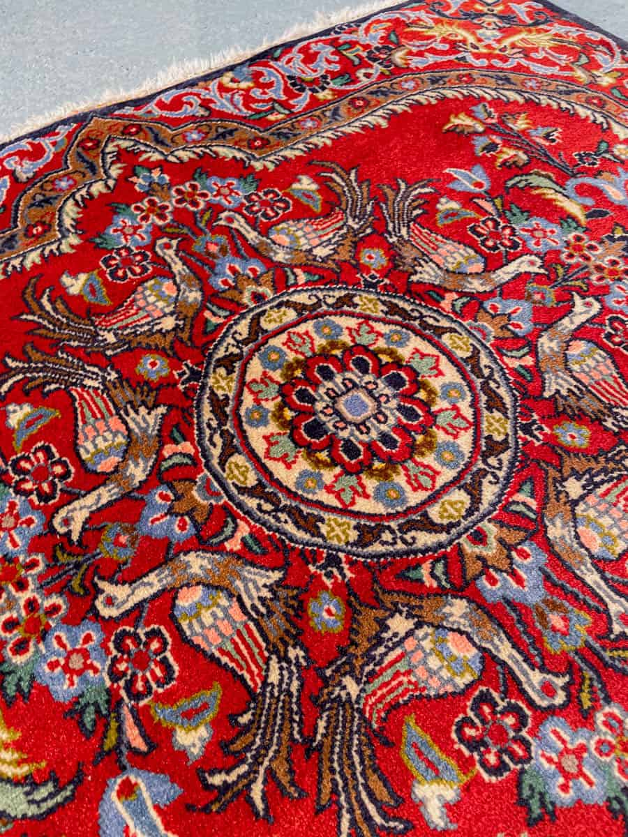 Ainutlaatuinen Keshan upeasti säilyneillä väreillä ja kauniin yksityiskohtainen lintuaiheinen kuviointi. Käsinsolmittu villasta.