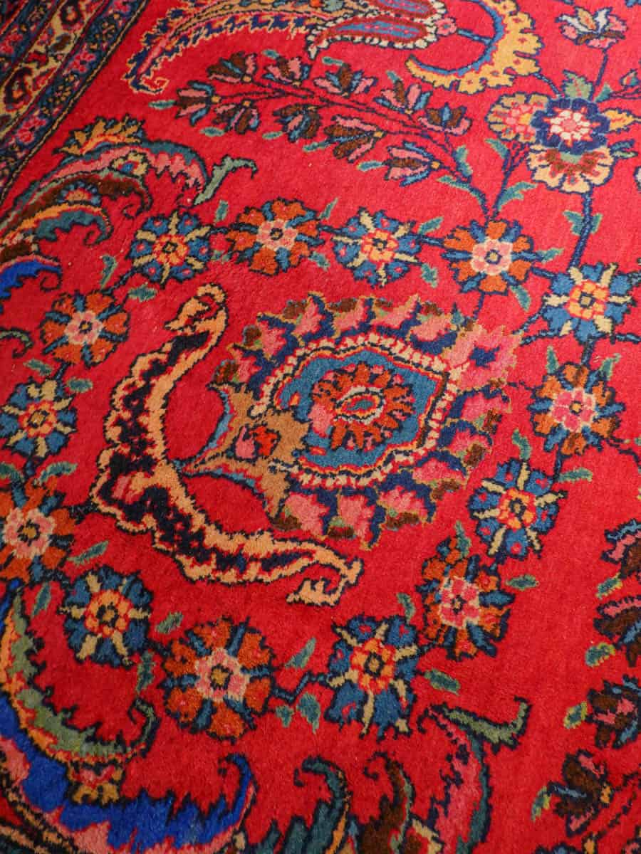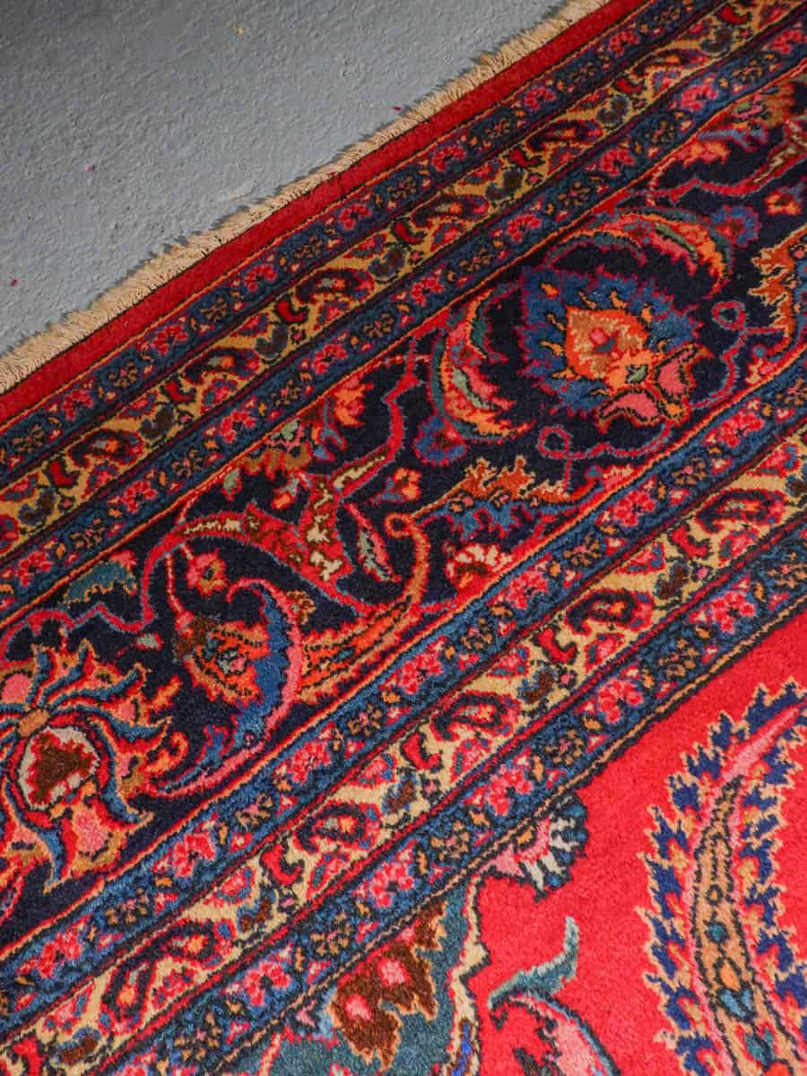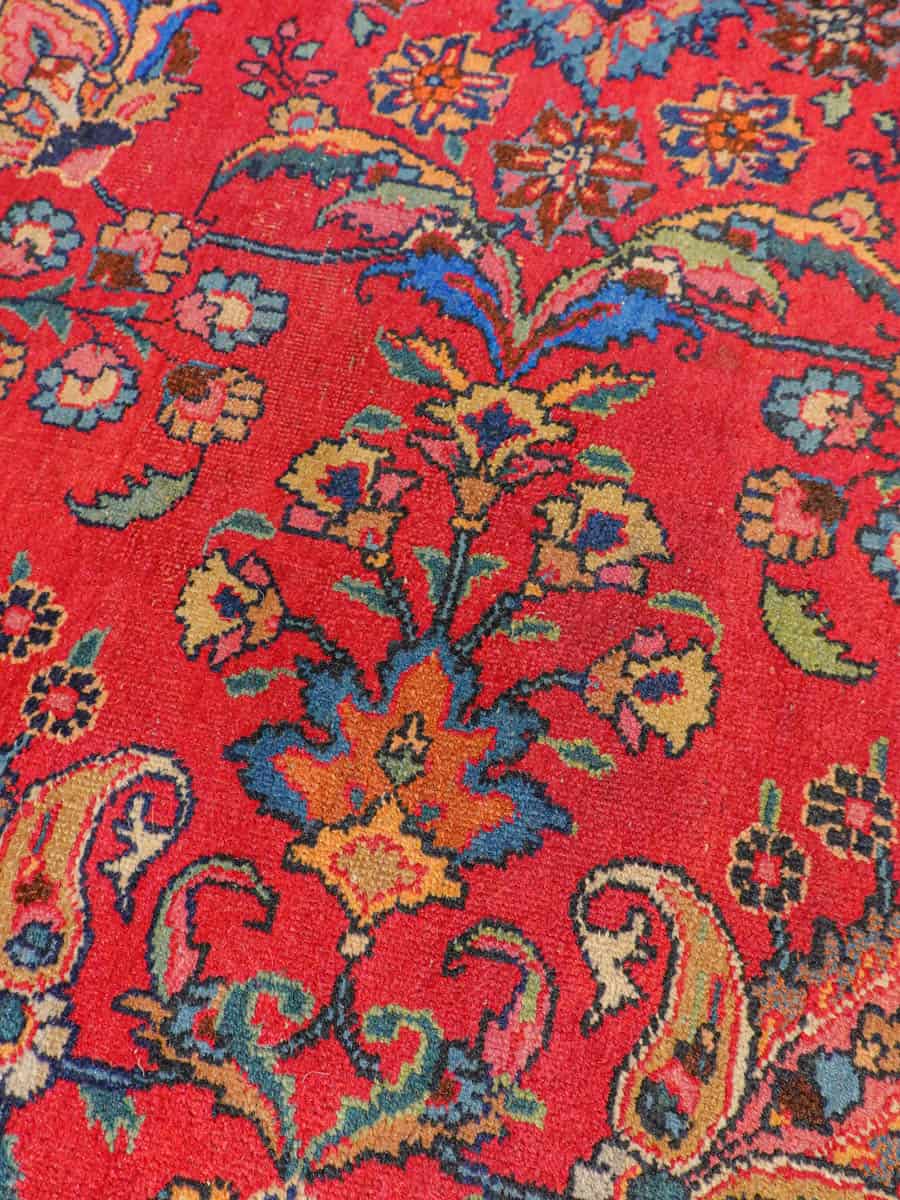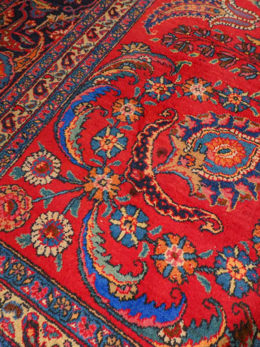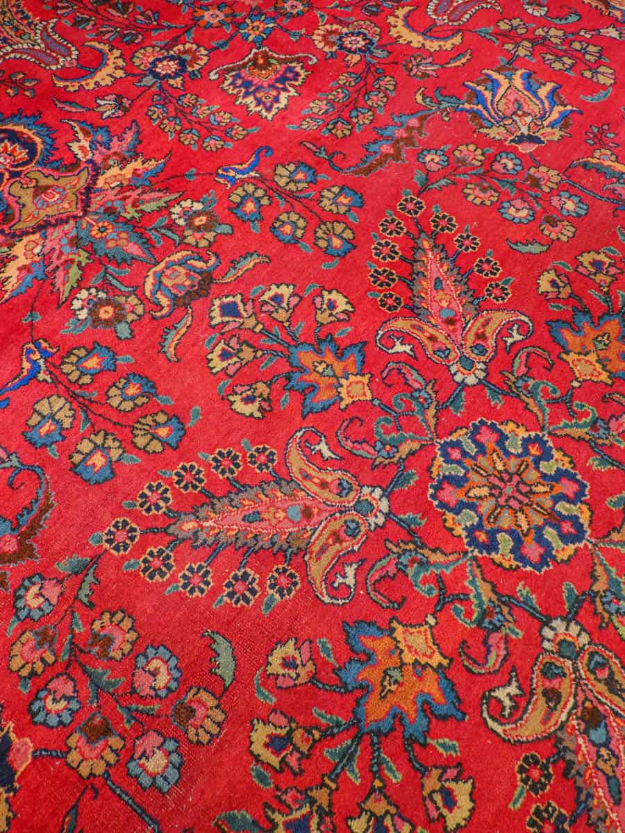 Loistokkaan koristeellinen punainen Meshed erityisen näyttävillä kukkaisaiheisilla kuvioinneilla ja kirkkaana säilyneillä väreillä. Erityispiirteenä on maton leveä mittasuhde.
