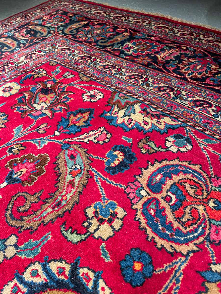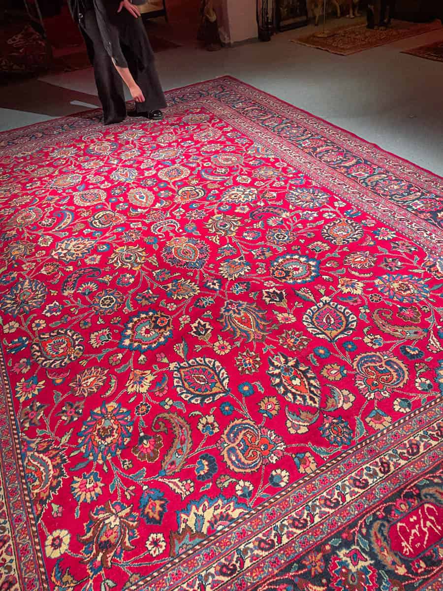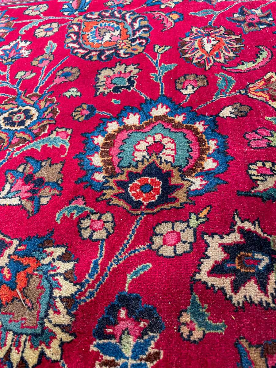 Loistokkaan punainen Meshed, jonka väreissä kilpailevat keskenään lukemattomat sävyt. Hämmästyttävän yksityiskohtaiset kuvioinnit ja kirkkaat värit.