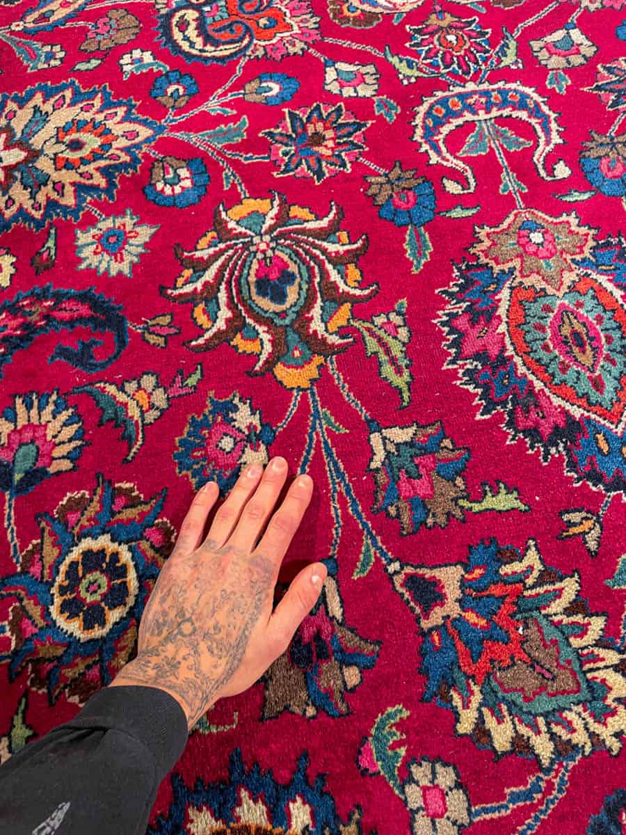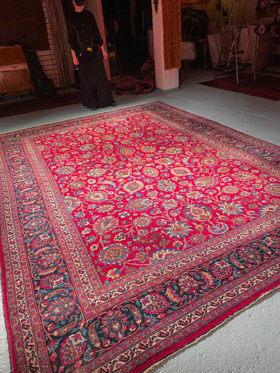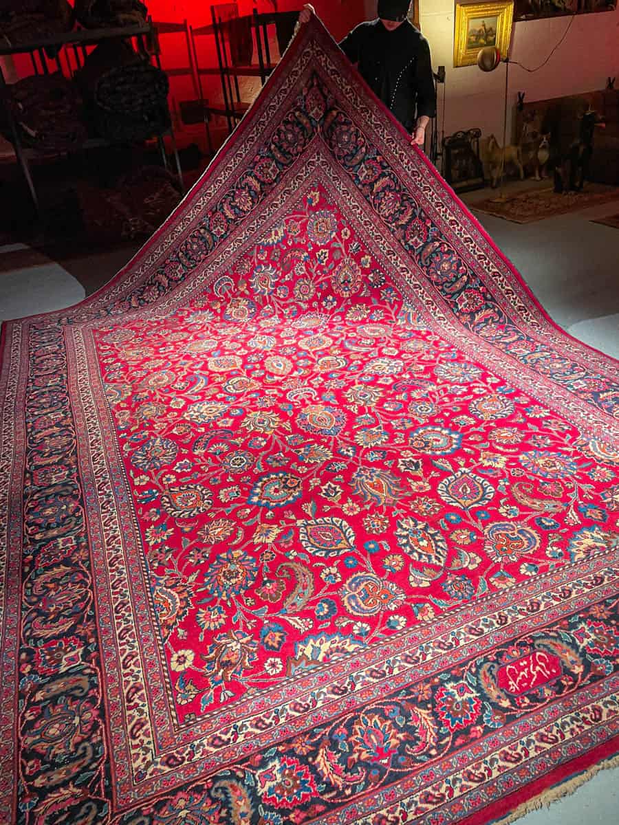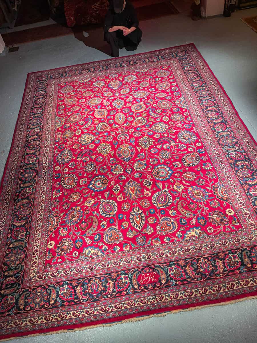 Loistokkaan punainen Meshed, jonka väreissä kilpailevat keskenään lukemattomat sävyt. Hämmästyttävän yksityiskohtaiset kuvioinnit ja kirkkaat värit.