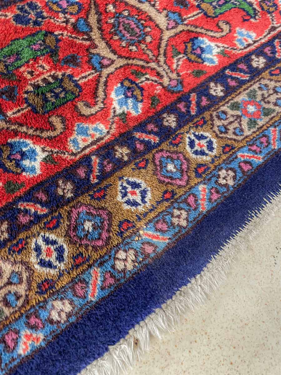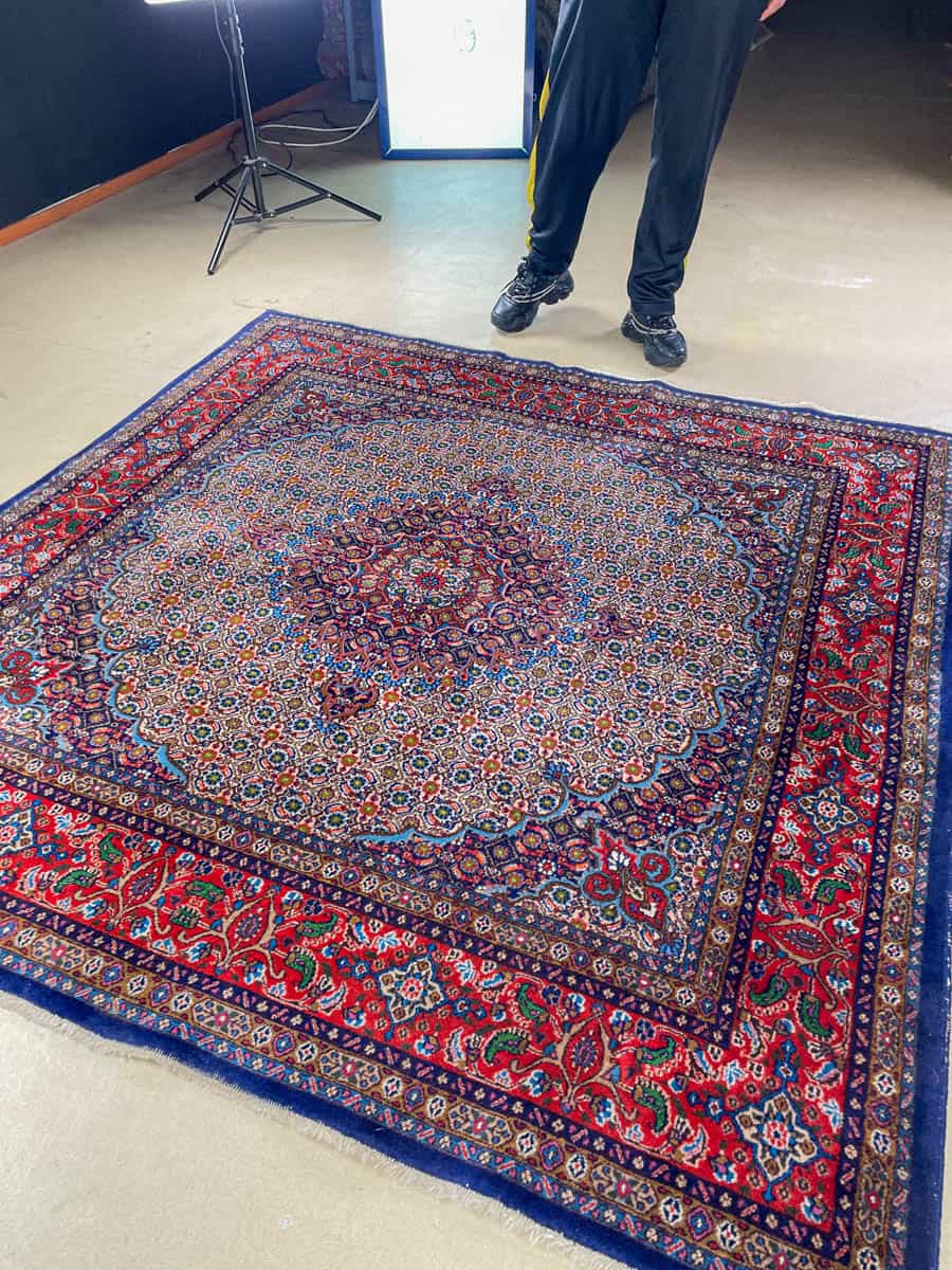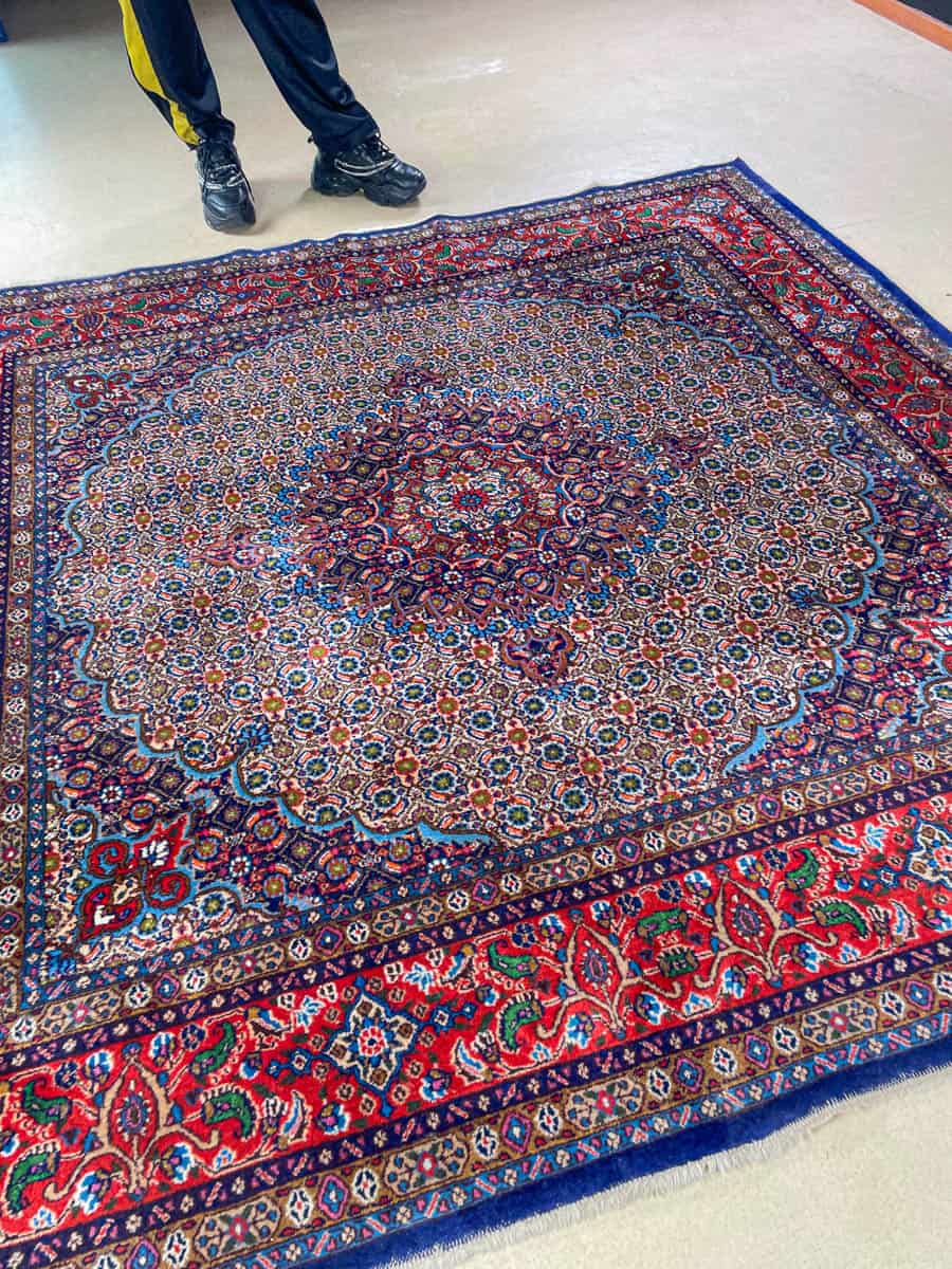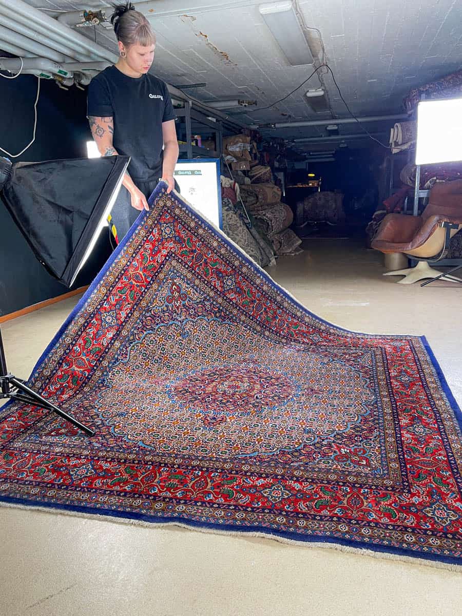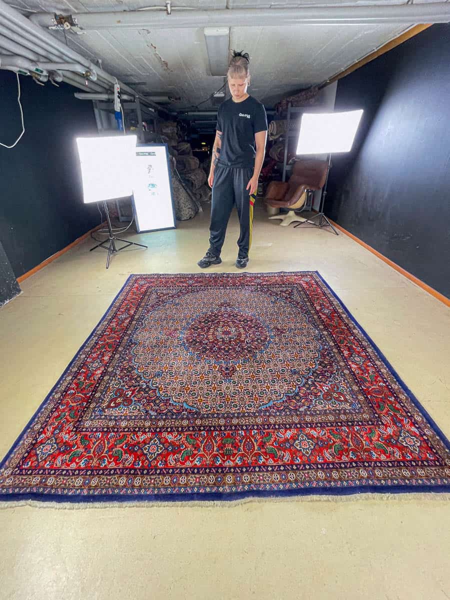 Tämä matto sijaitsee Töölön varastollamme – jos haluat tulla katsomaan sitä paikan päälle, sovithan näytön viestitse tai puhelimitse.