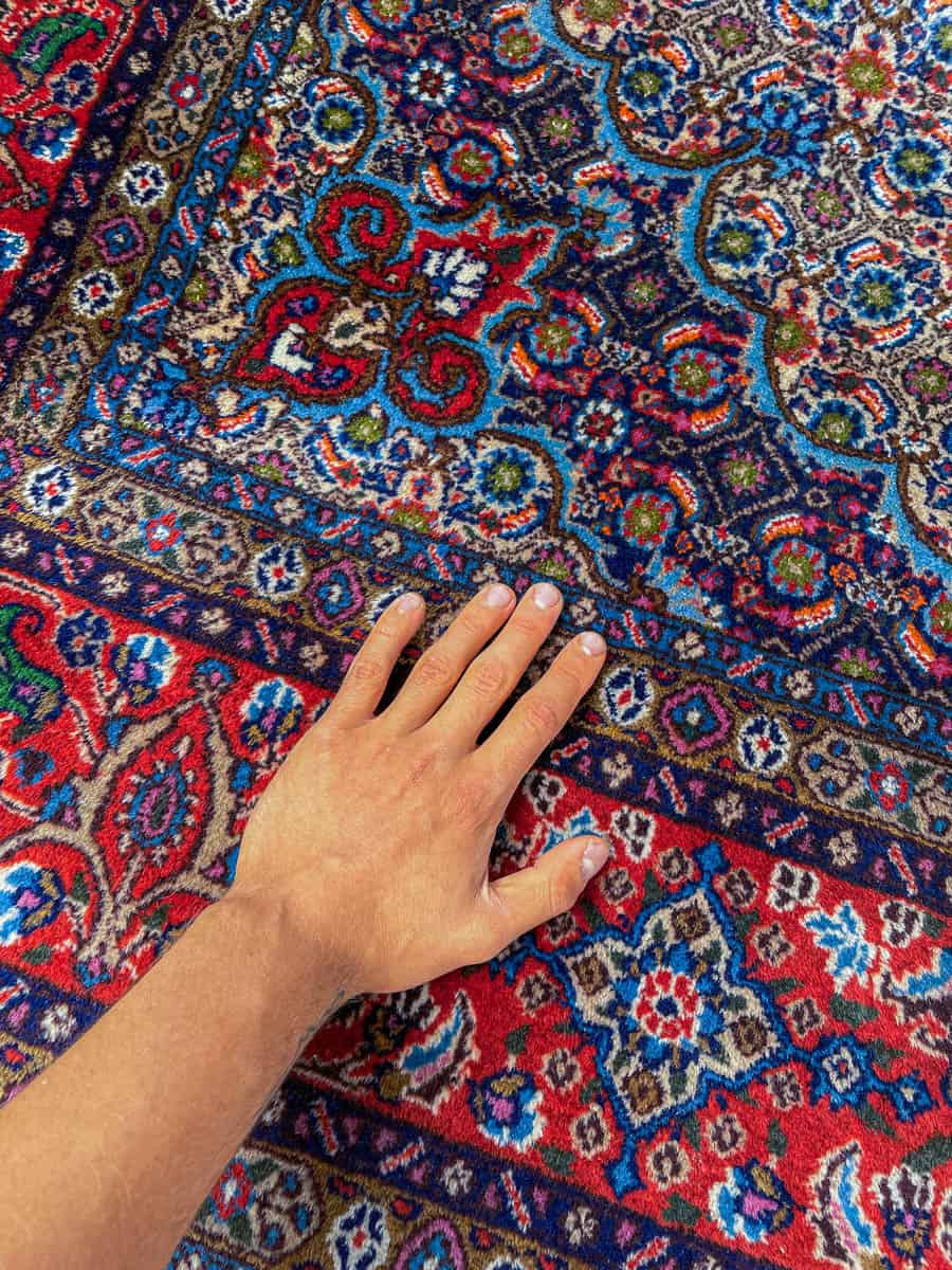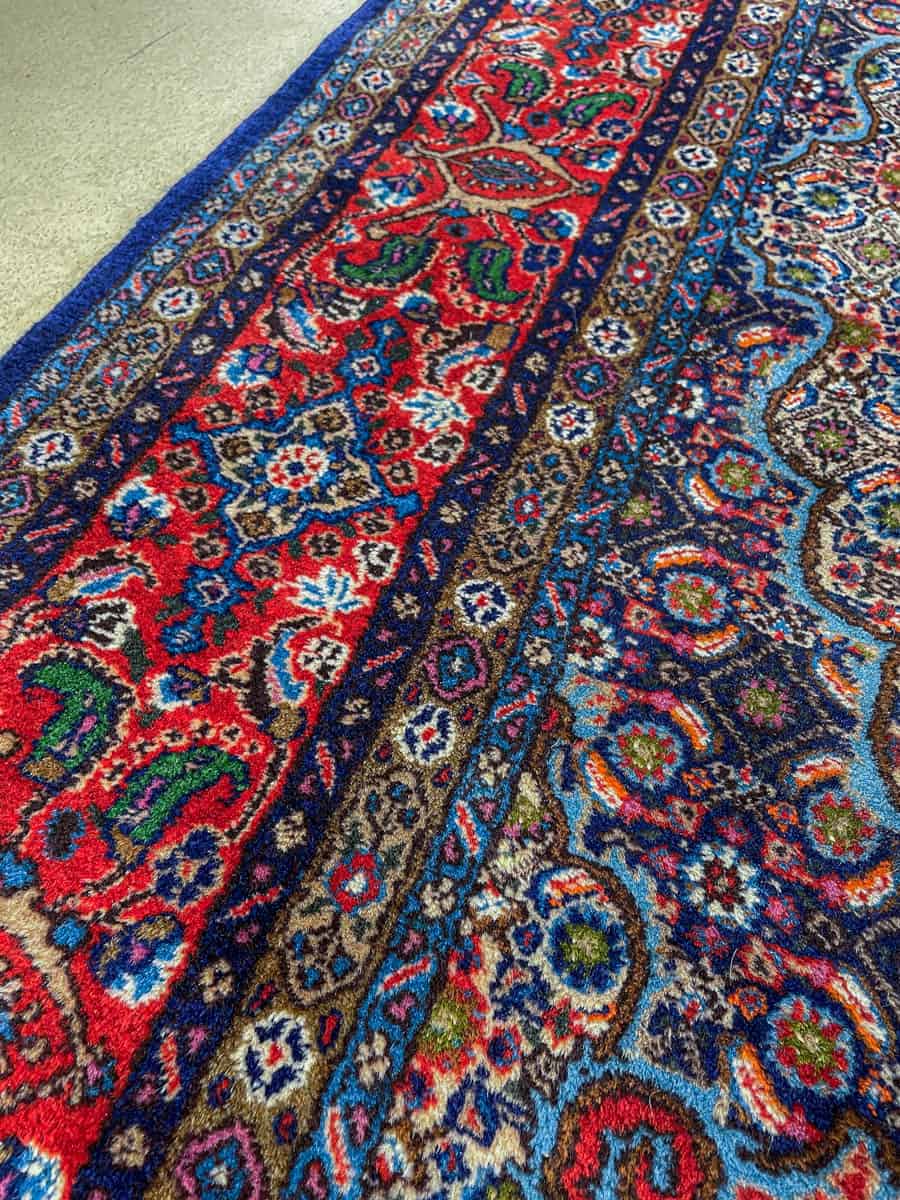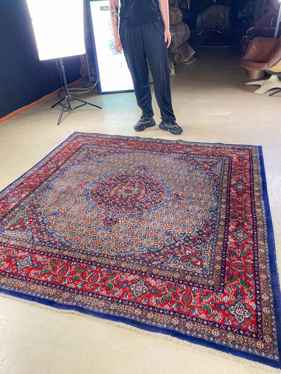 Katseenvangitseva Moud-kuviointi pyöräellä keskimedaljongilla. Upean värikäs sinipunainen väritys. Harvinainen neliönmallinen muoto ja siisti nukka. Käsinsolmittu villasta.