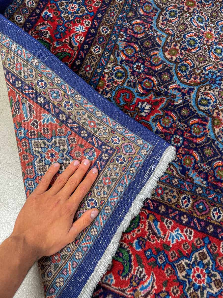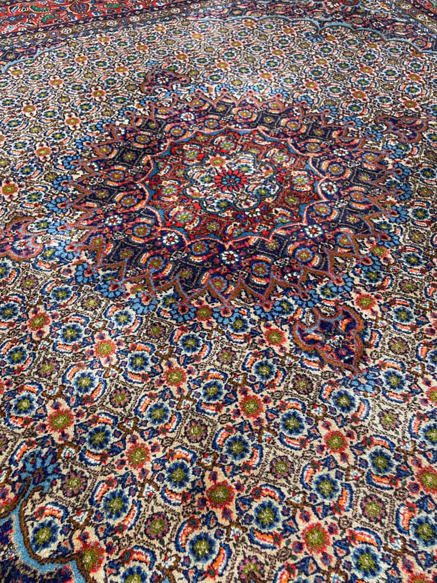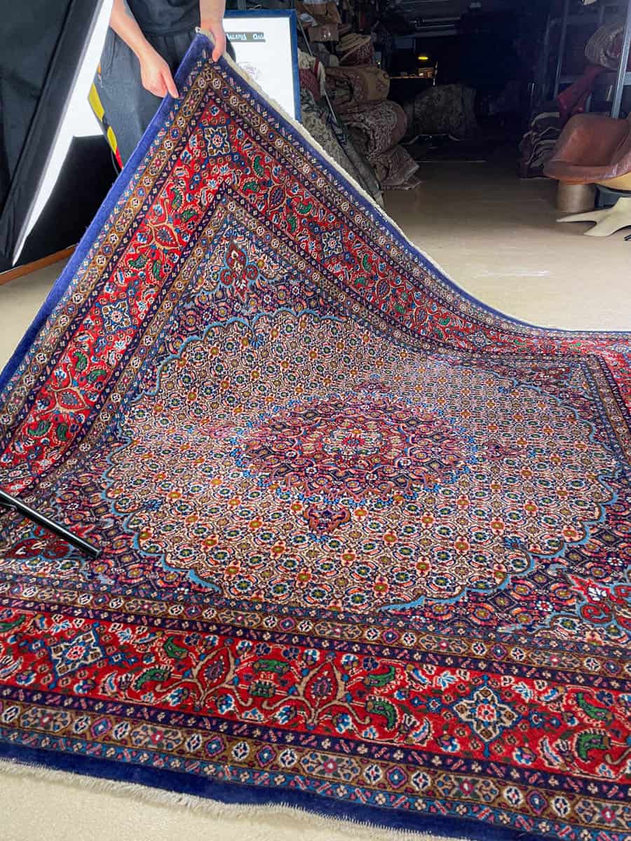 Katseenvangitseva Moud-kuviointi pyöräellä keskimedaljongilla. Upean värikäs sinipunainen väritys. Harvinainen neliönmallinen muoto ja siisti nukka. Käsinsolmittu villasta.