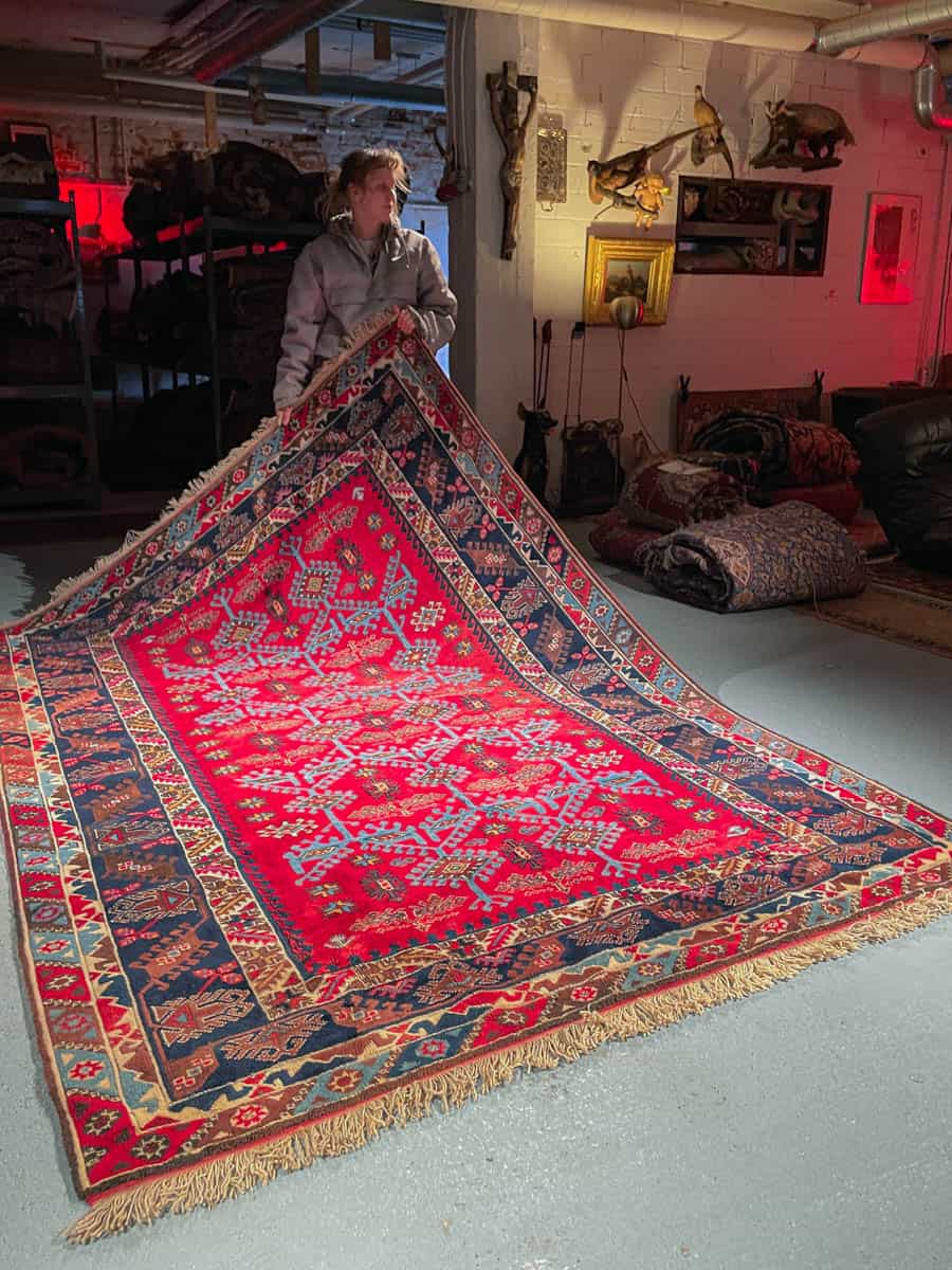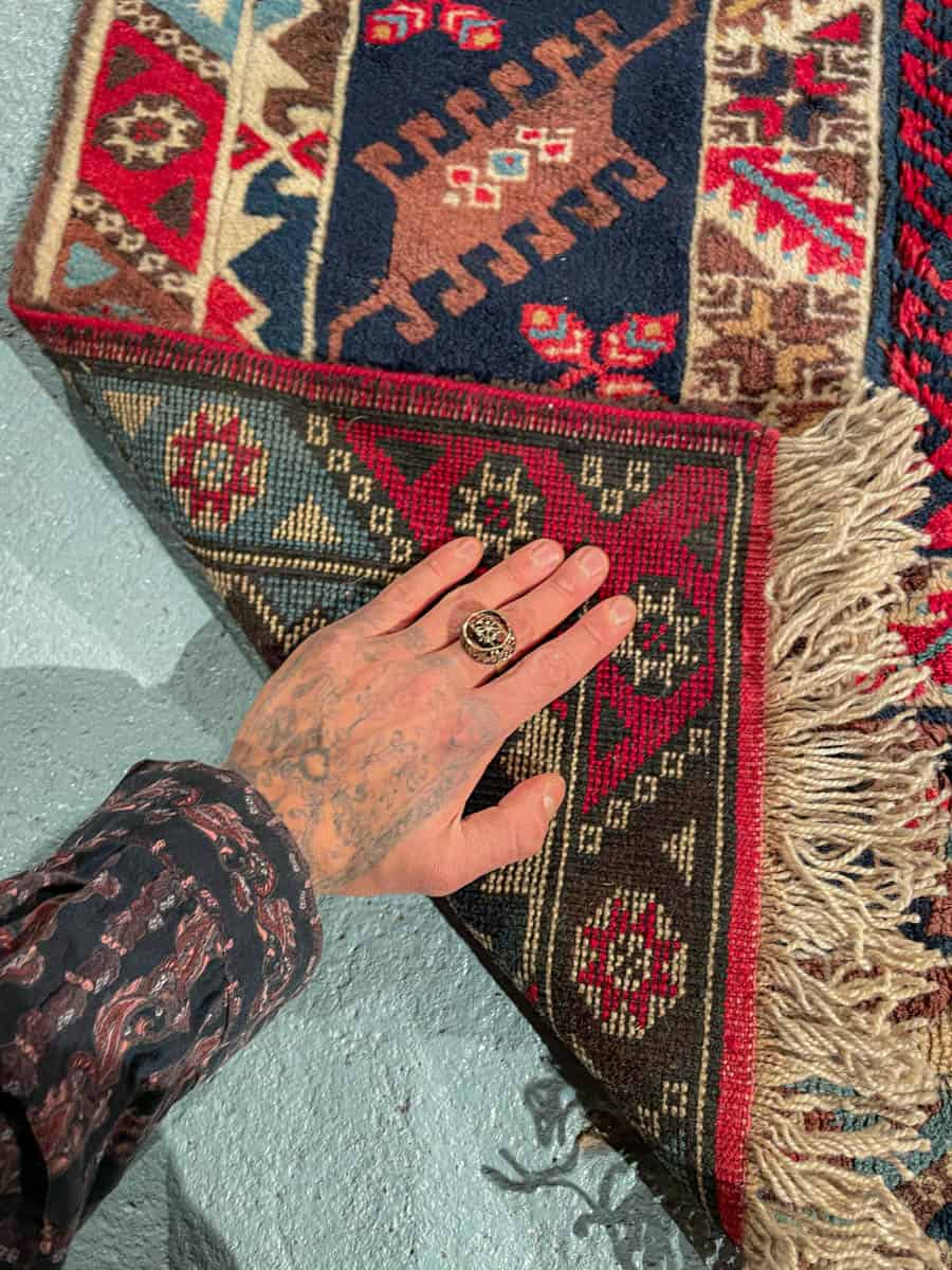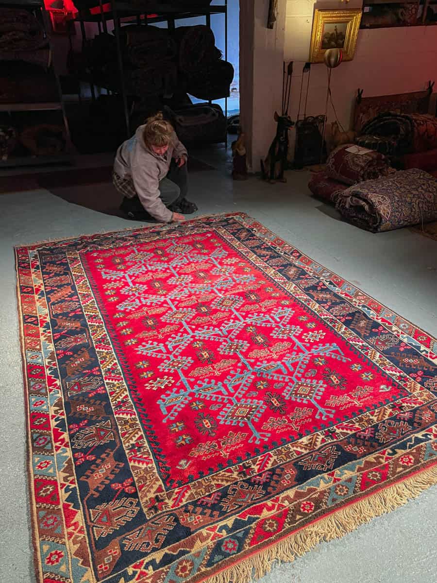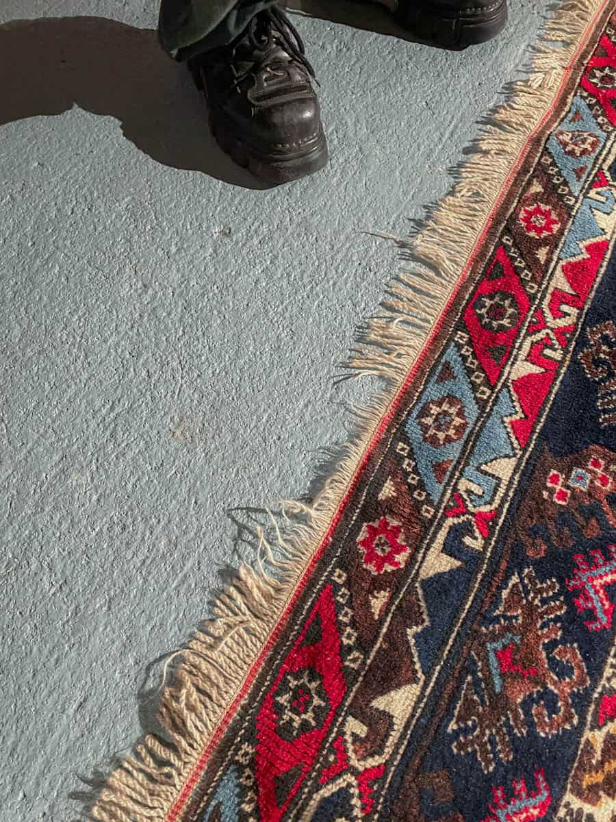 Tämä matto sijaitsee Galleriallamme osoitteessa Kankurinkatu 7, Punavuori – jos haluat tulla katsomaan sitä paikan päälle, sovithan näytön viestitse tai puhelimitse.