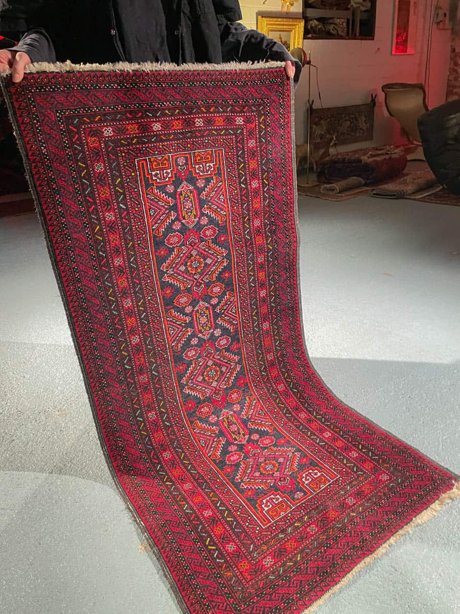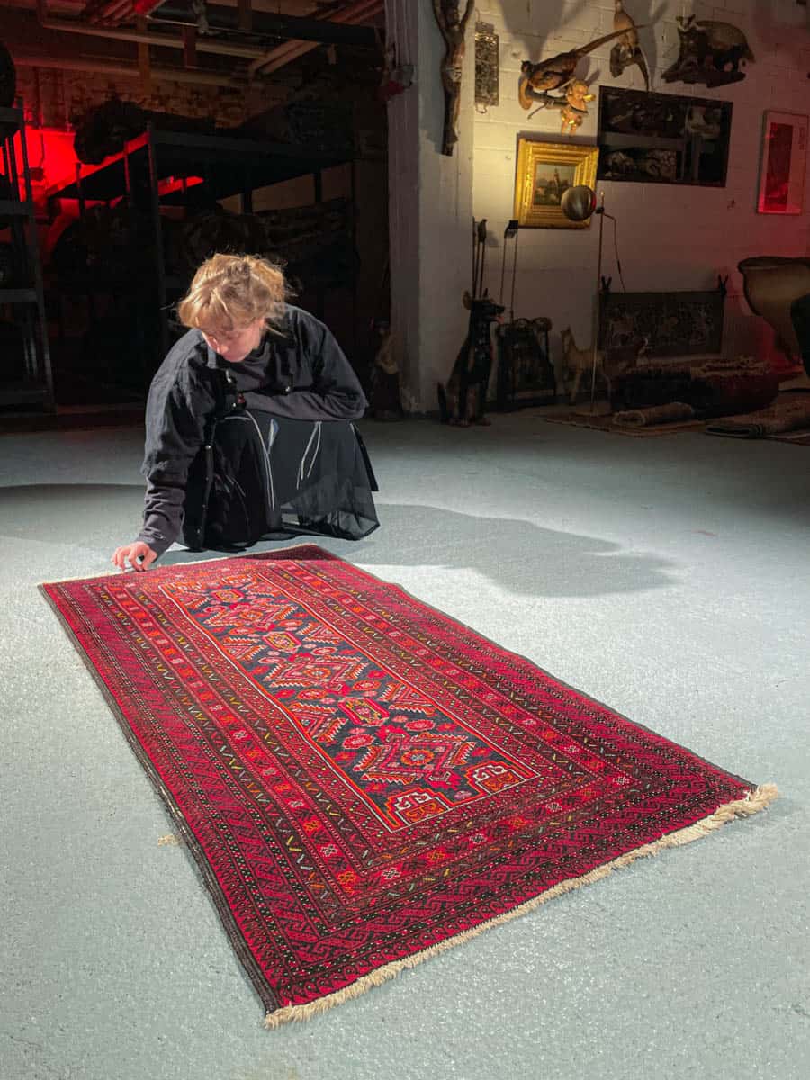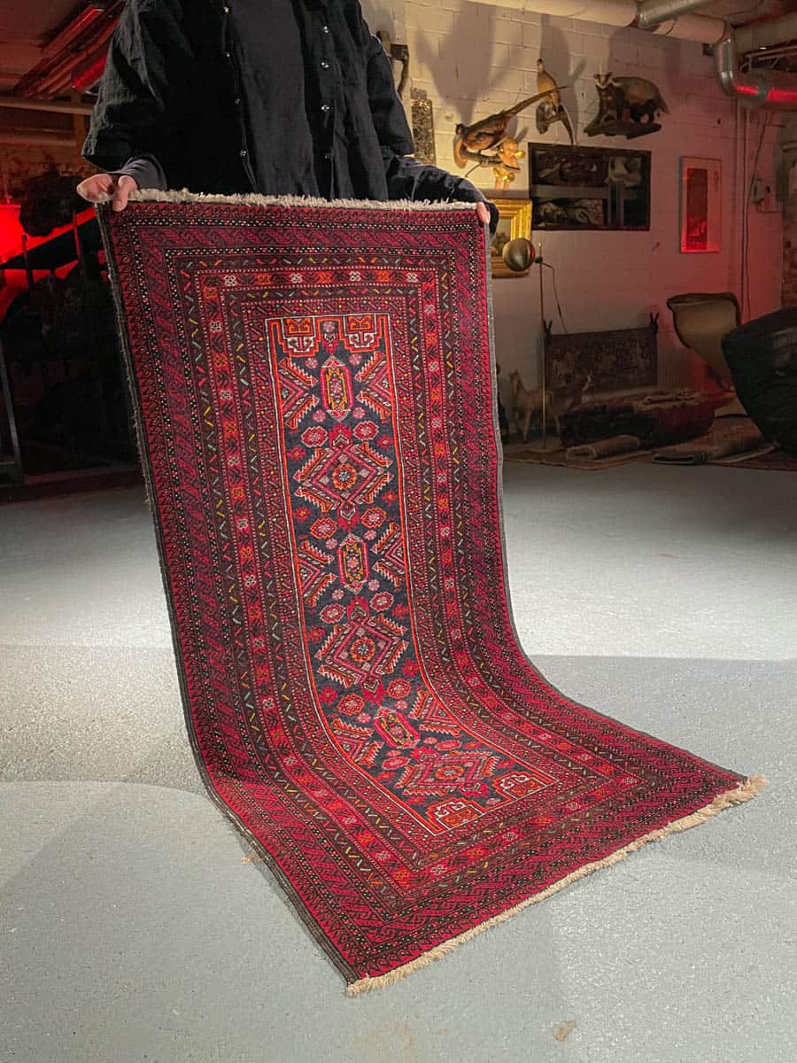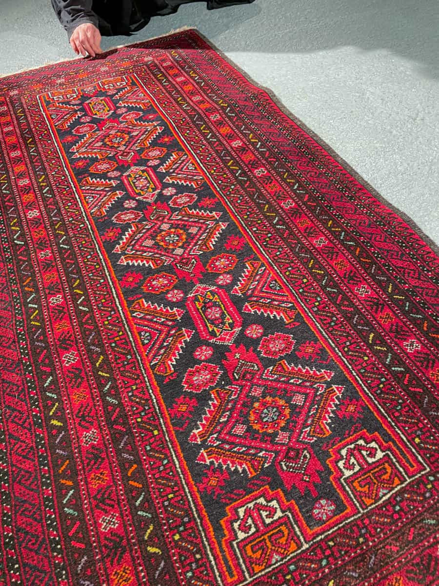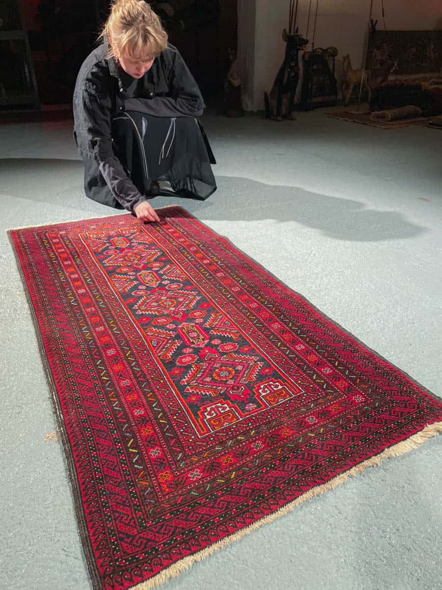 Maagisen kaunis Balutsi kauniin punaisella värityksellä ja geometrisilla yksityiskohdilla. Käsinsolmittu villasta.