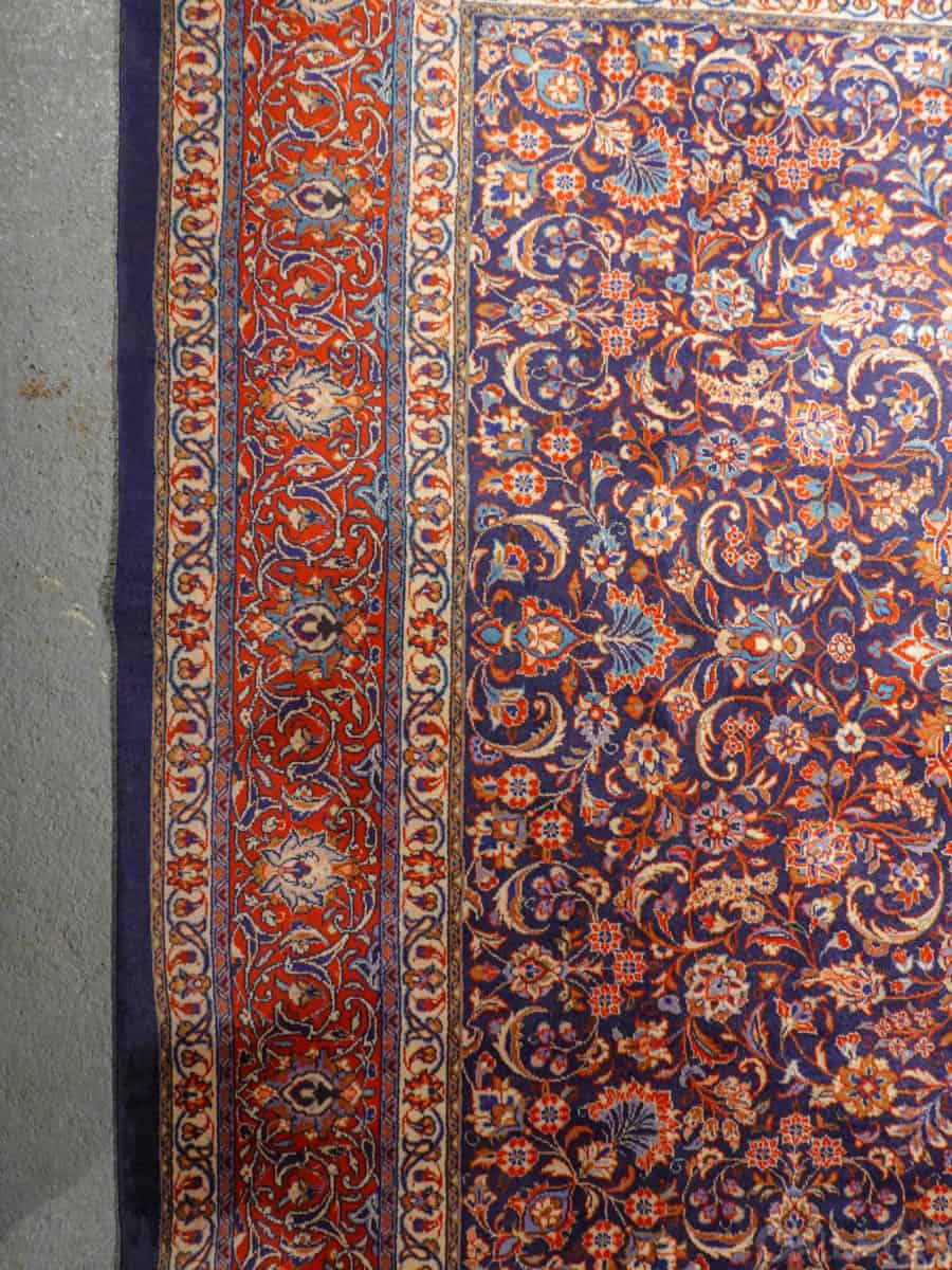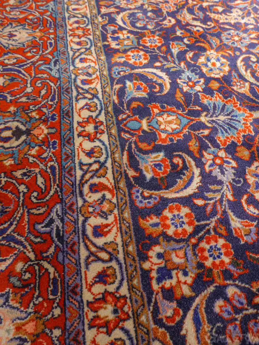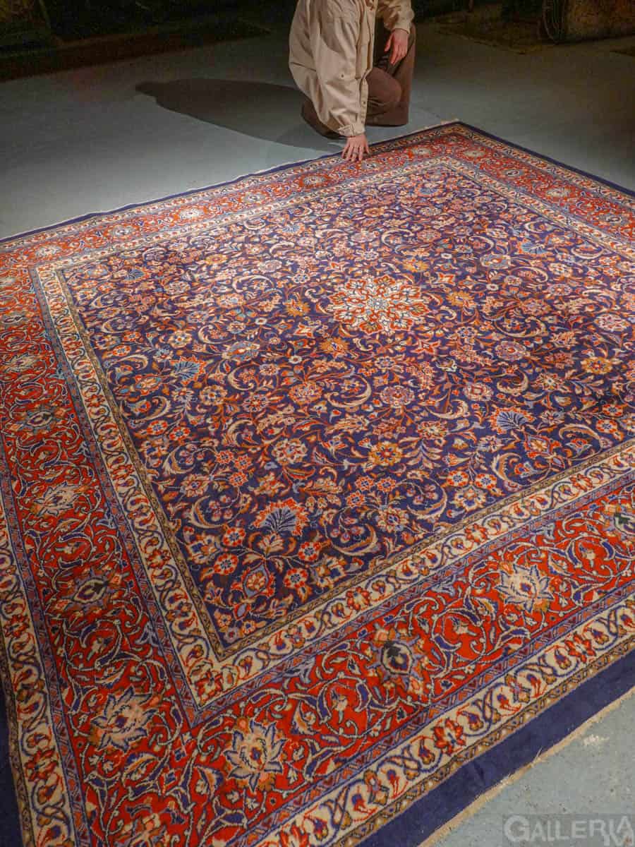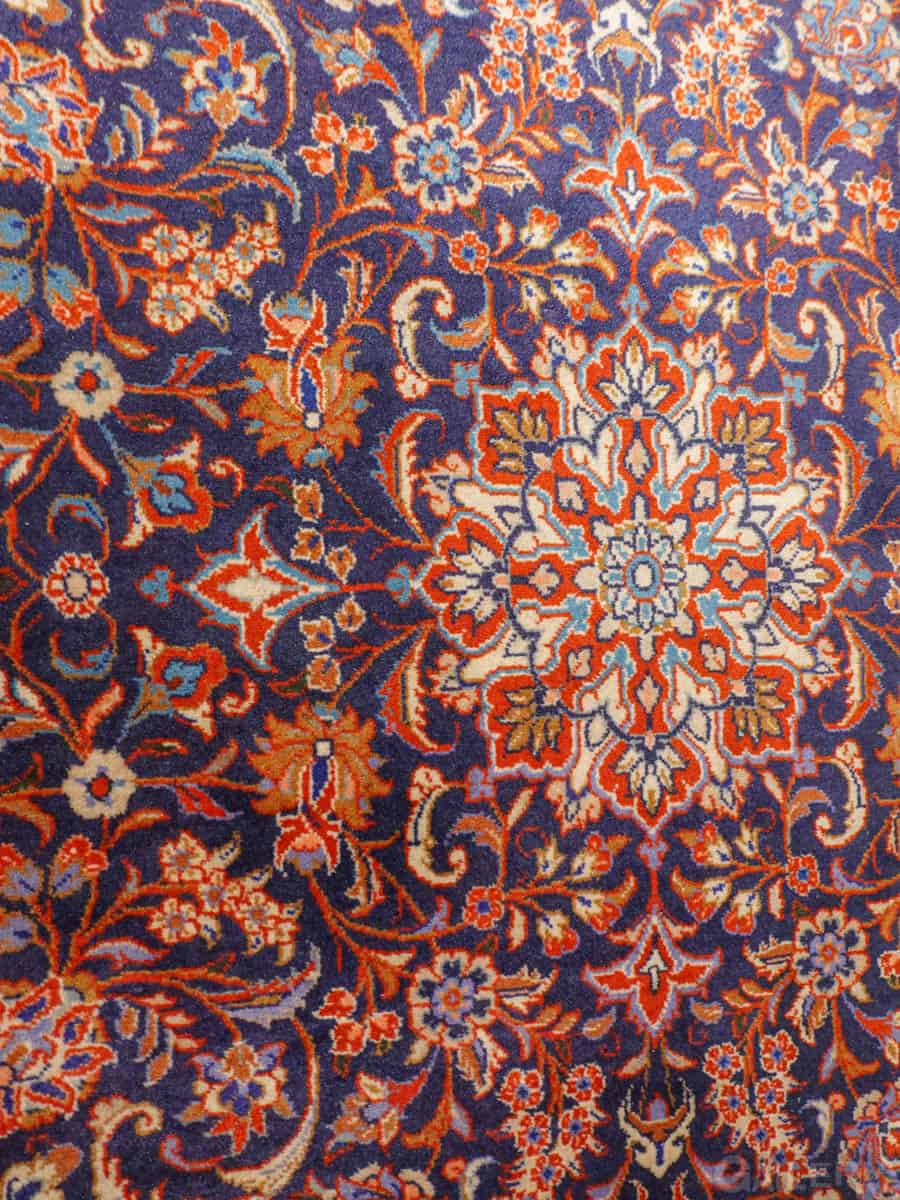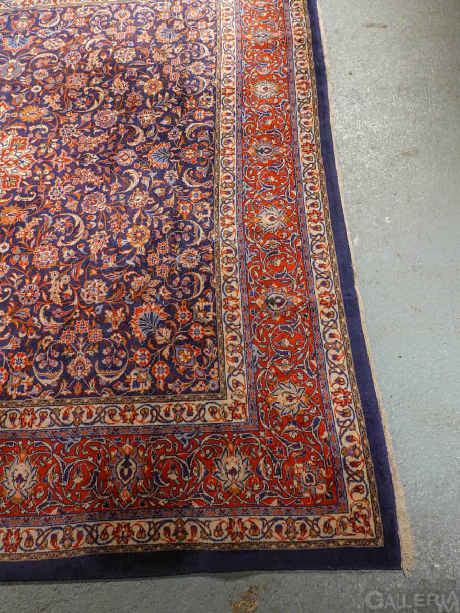 Uskomattoman yksityiskohtainen Sarouk maagisella yönsinisellä taustavärillä. Harvinaiset, neliönomaiset mittasuhteet.