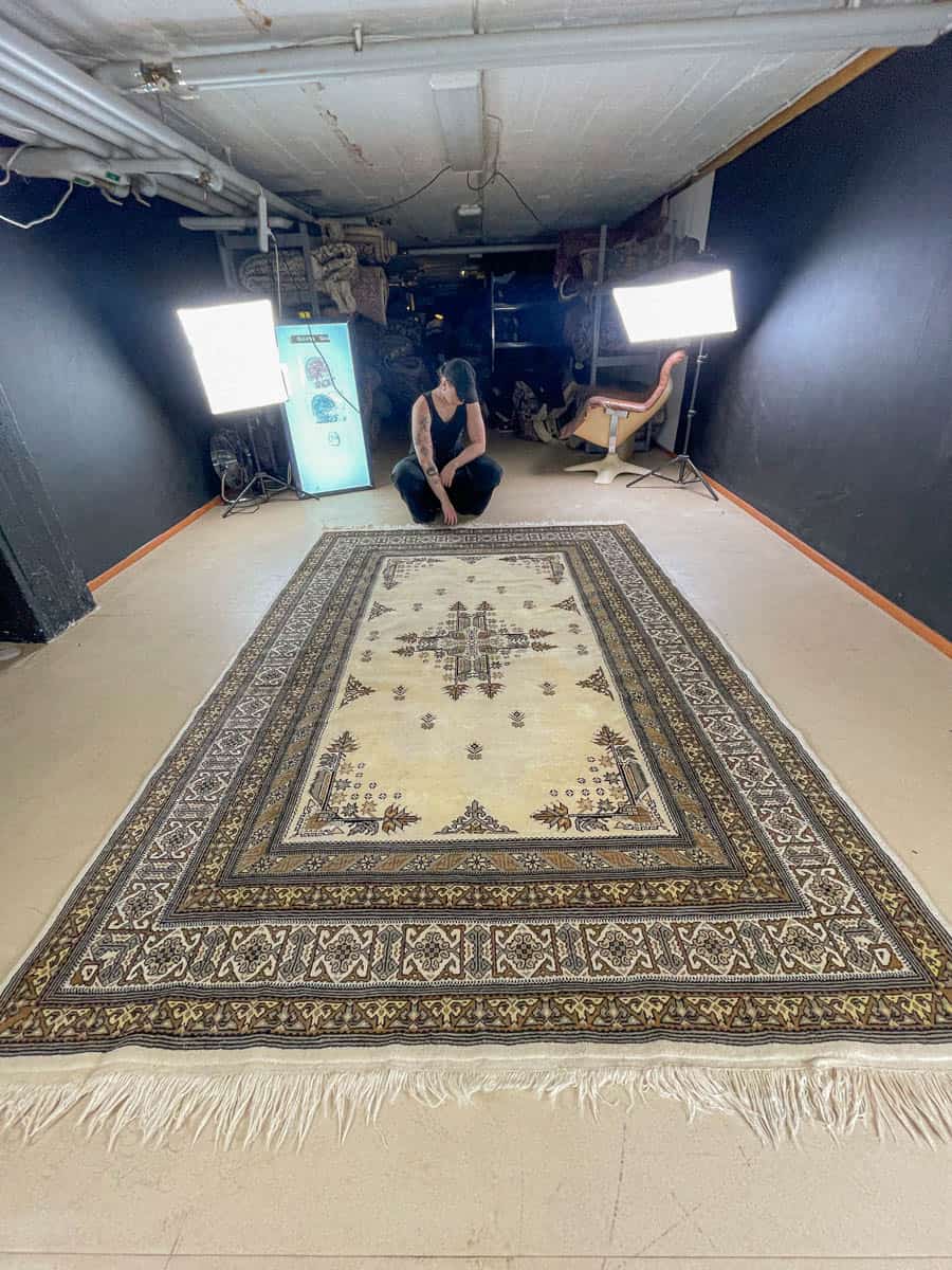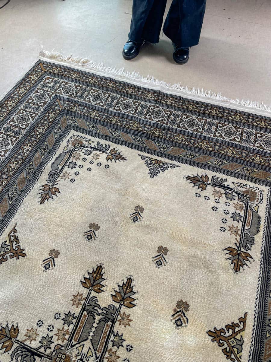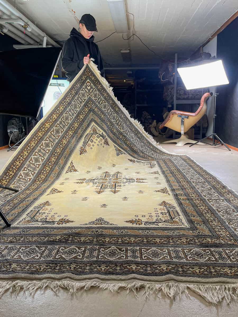 Tämä matto sijaitsee Töölön varastollamme – jos haluat tulla katsomaan sitä paikan päälle, sovithan näytön viestitse tai puhelimitse.