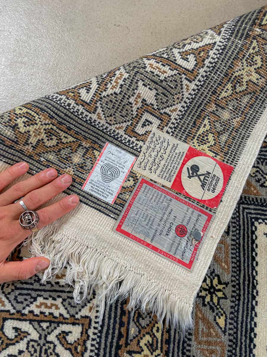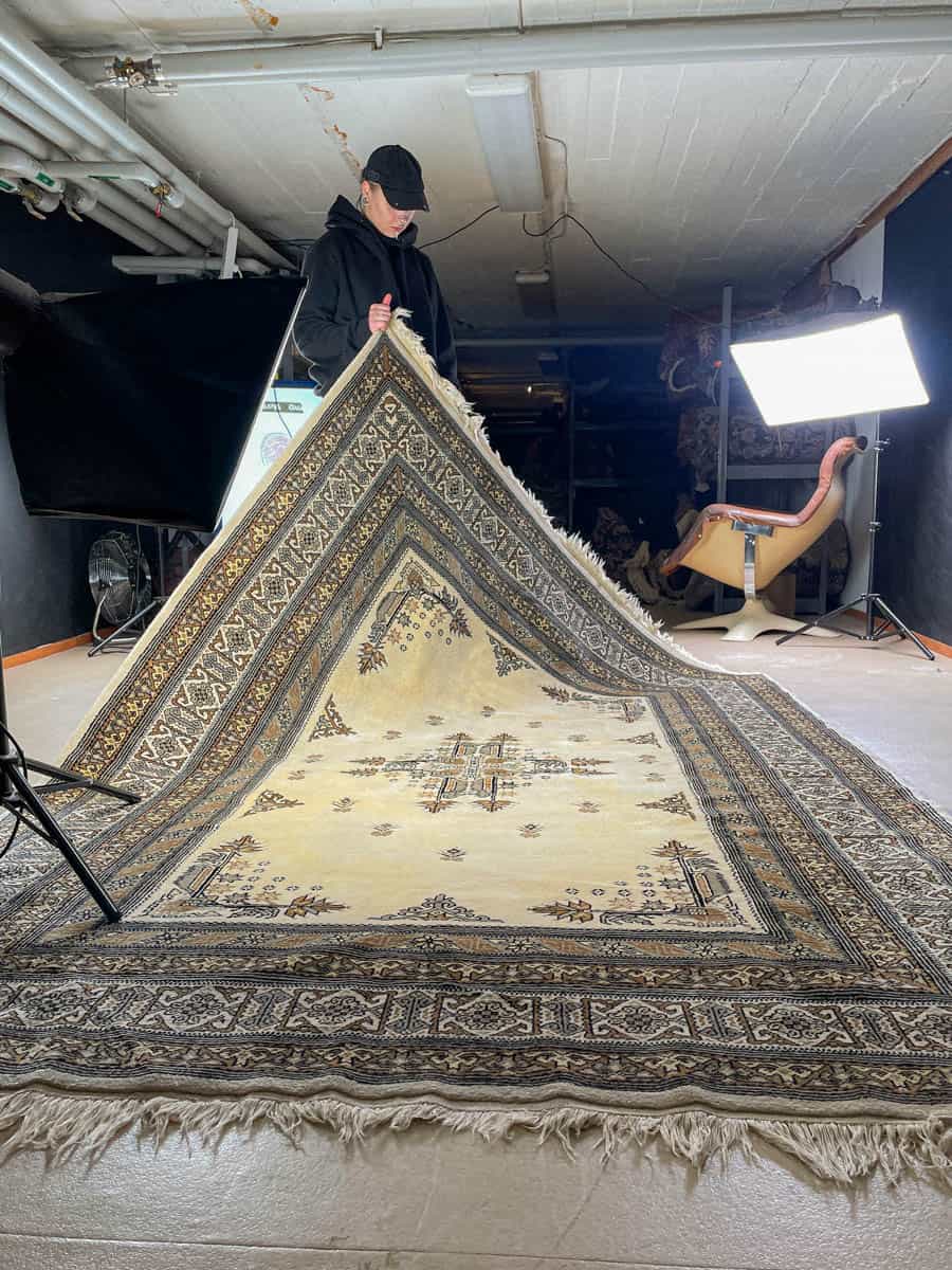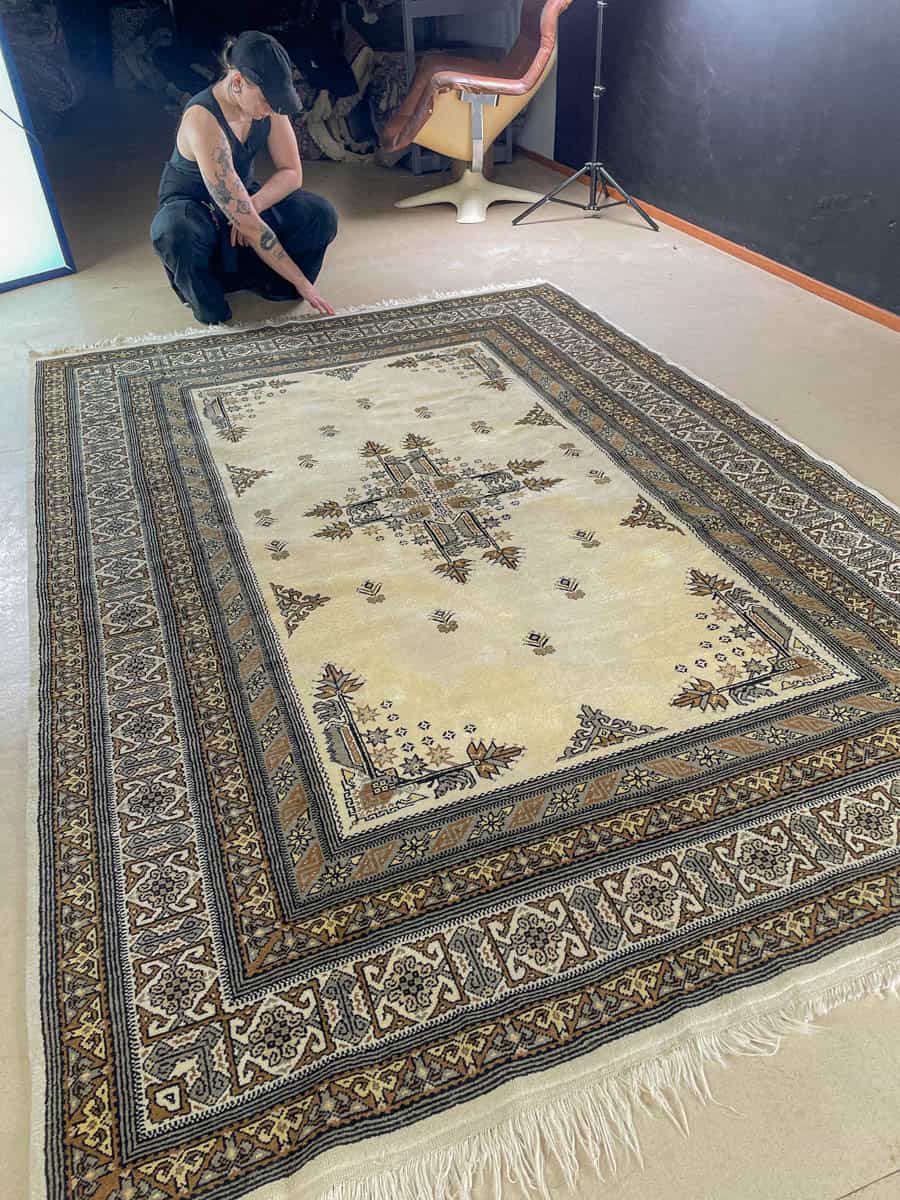 Tämä matto sijaitsee Töölön varastollamme – jos haluat tulla katsomaan sitä paikan päälle, sovithan näytön viestitse tai puhelimitse.