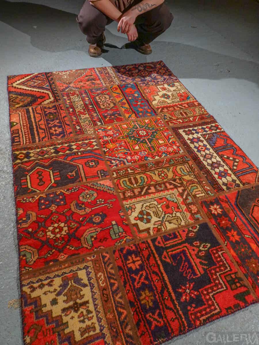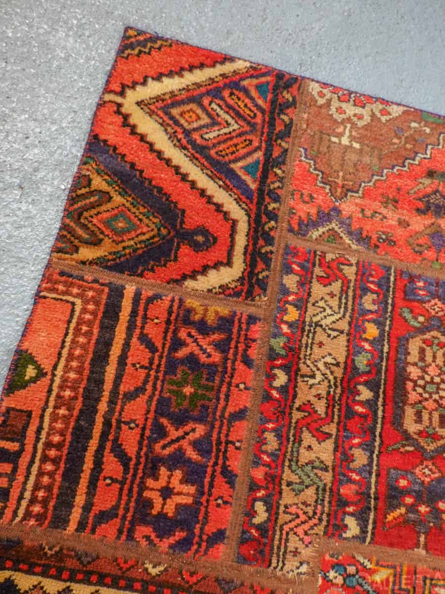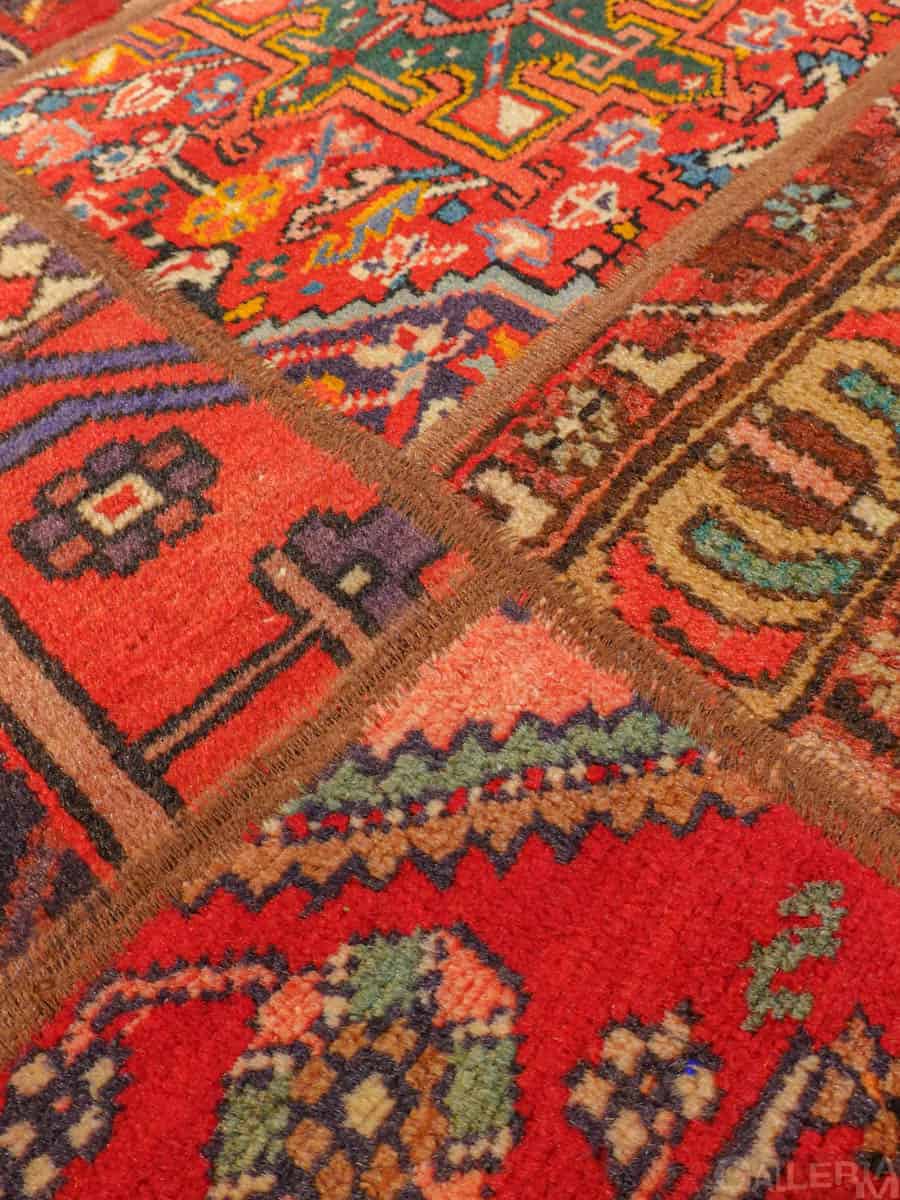 Itämaisten mattojen moninaisuutta näyttävä patchwork-matto, josta voi löytää paloja erilaisista matoista kuten Hamadan ja Bijar.