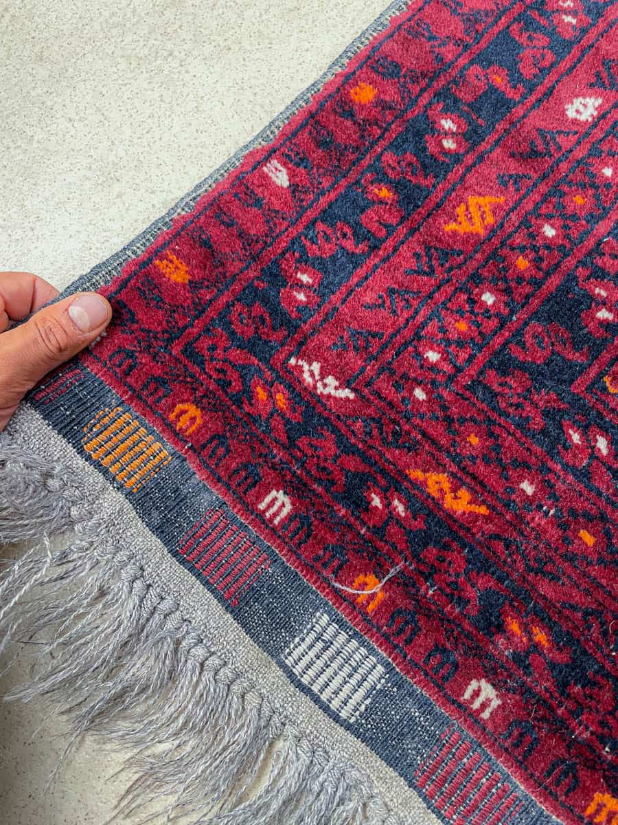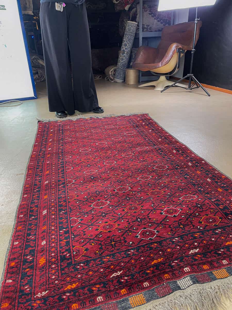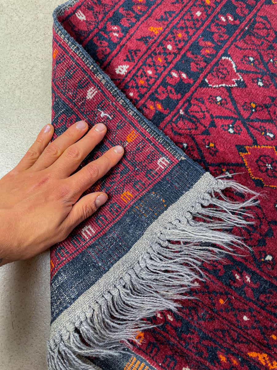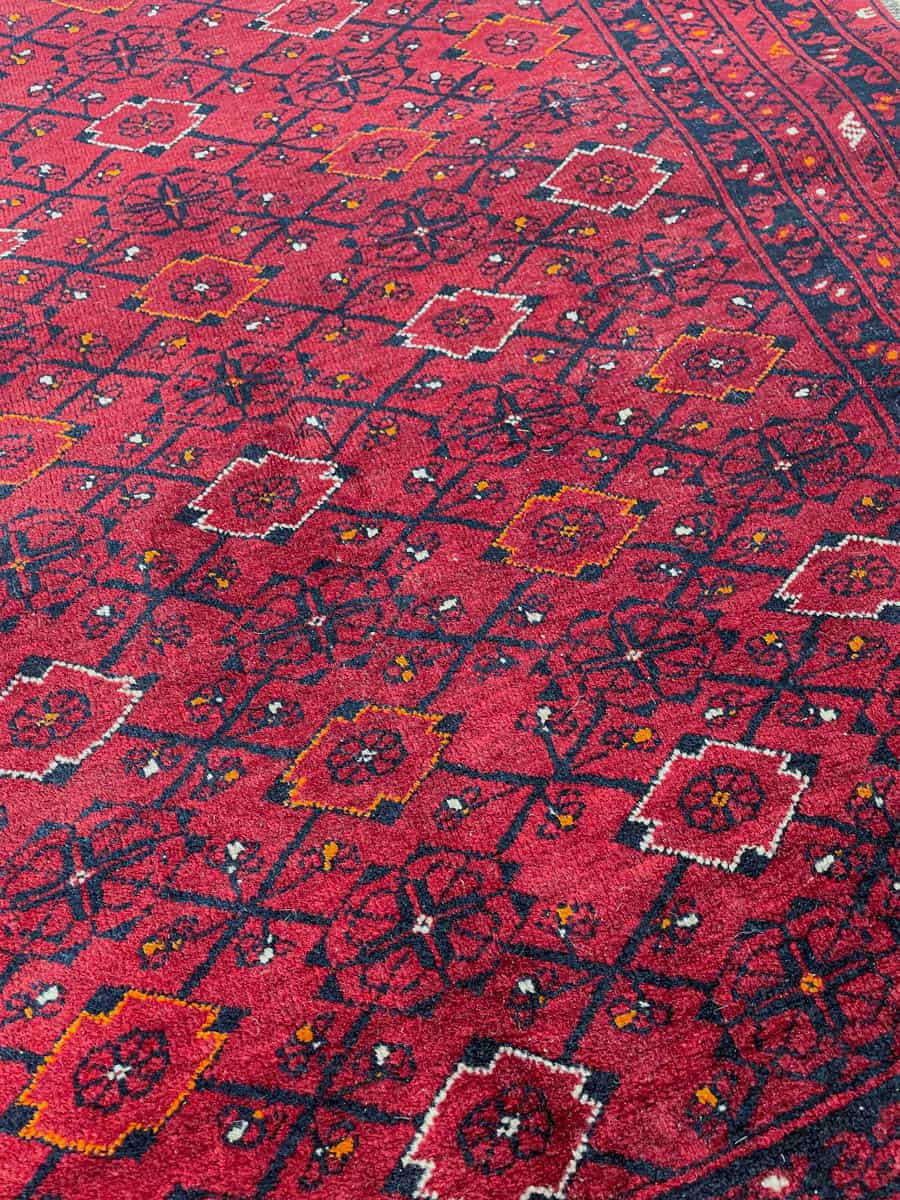 Kauniin yksityiskohtainen afgaanimatto tummilla sävyillä ja ja klassisella kuvioinnilla. Kauniisti laskostuva. Käsinsolmittu villasta villaloimelle.