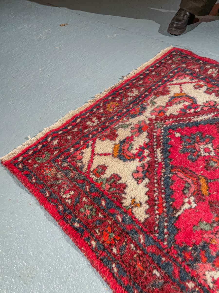 Perinteinen vintage-Hamadan-kylämatto. Klassinen geometrinen kuviointi keskimedaljongilla ja perinteinen väriteema. Käsinsolmittu villasta.