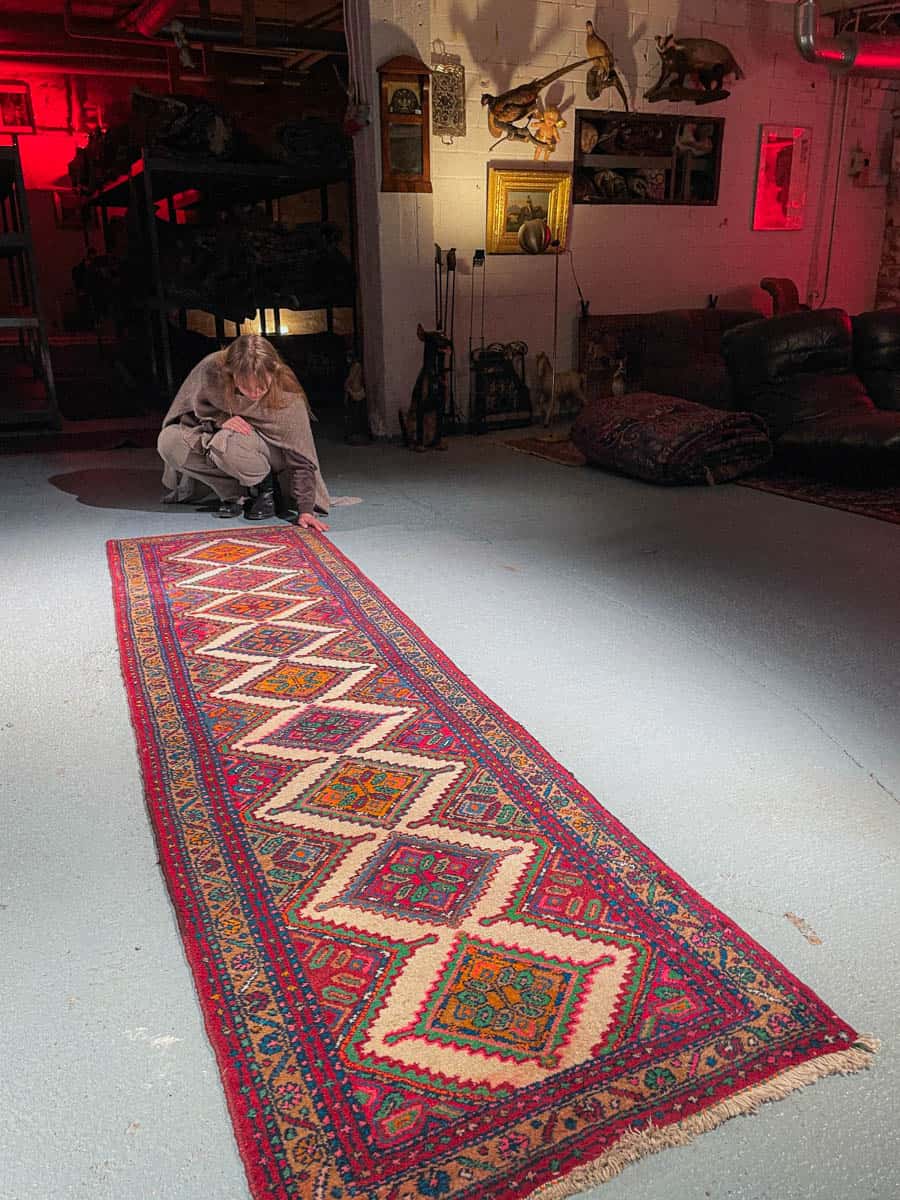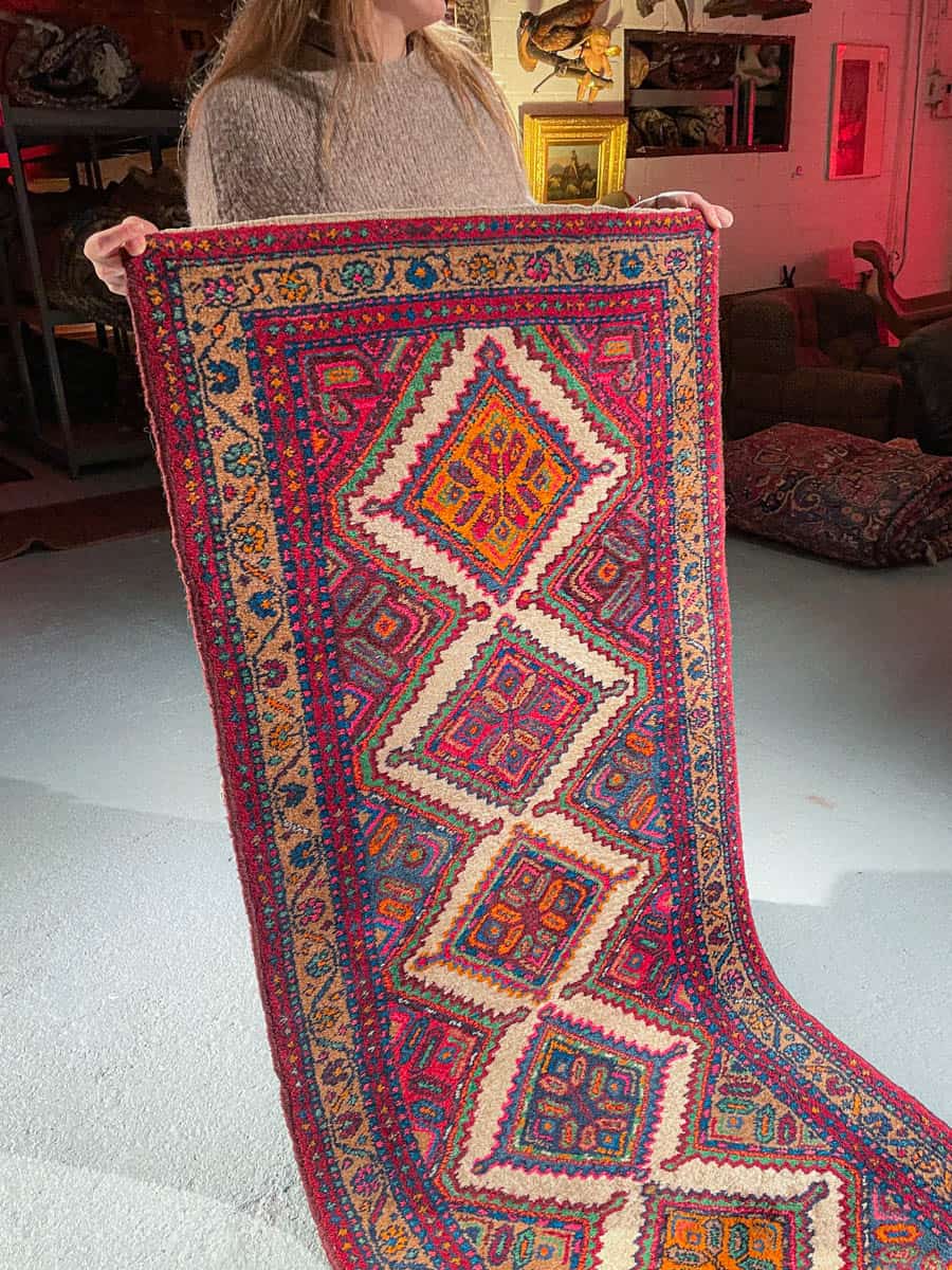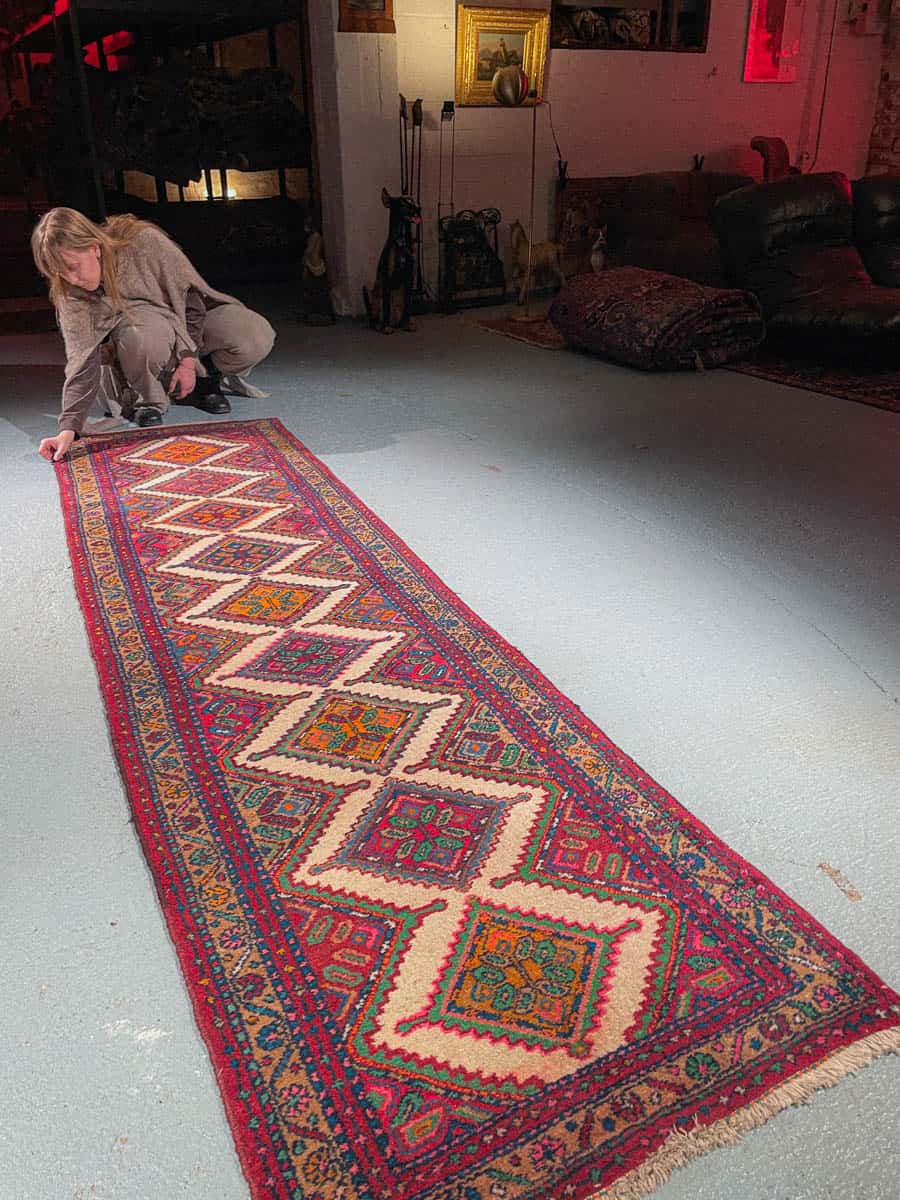Tämä matto sijaitsee Galleriallamme osoitteessa Kankurinkatu 7, Punavuori – jos haluat tulla katsomaan sitä paikan päälle, sovithan näytön viestitse tai puhelimitse.