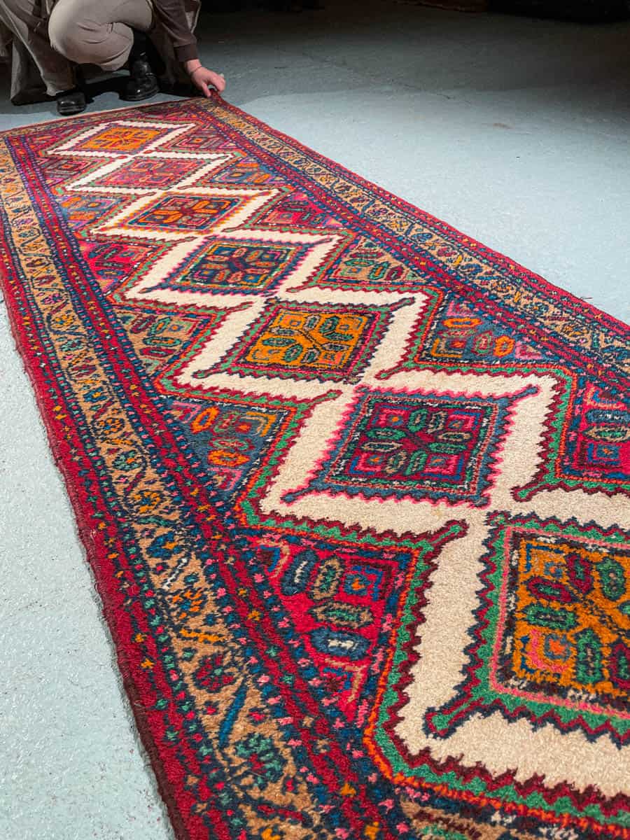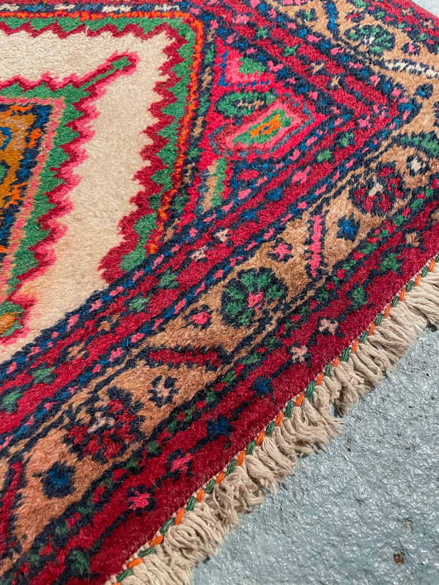 Kauniina säilyneet harvinaiset violettiin tai vaalenpunaiseen taittavat värit ja geometrisen harmoninen persialainen Hamadan-kuviointi.