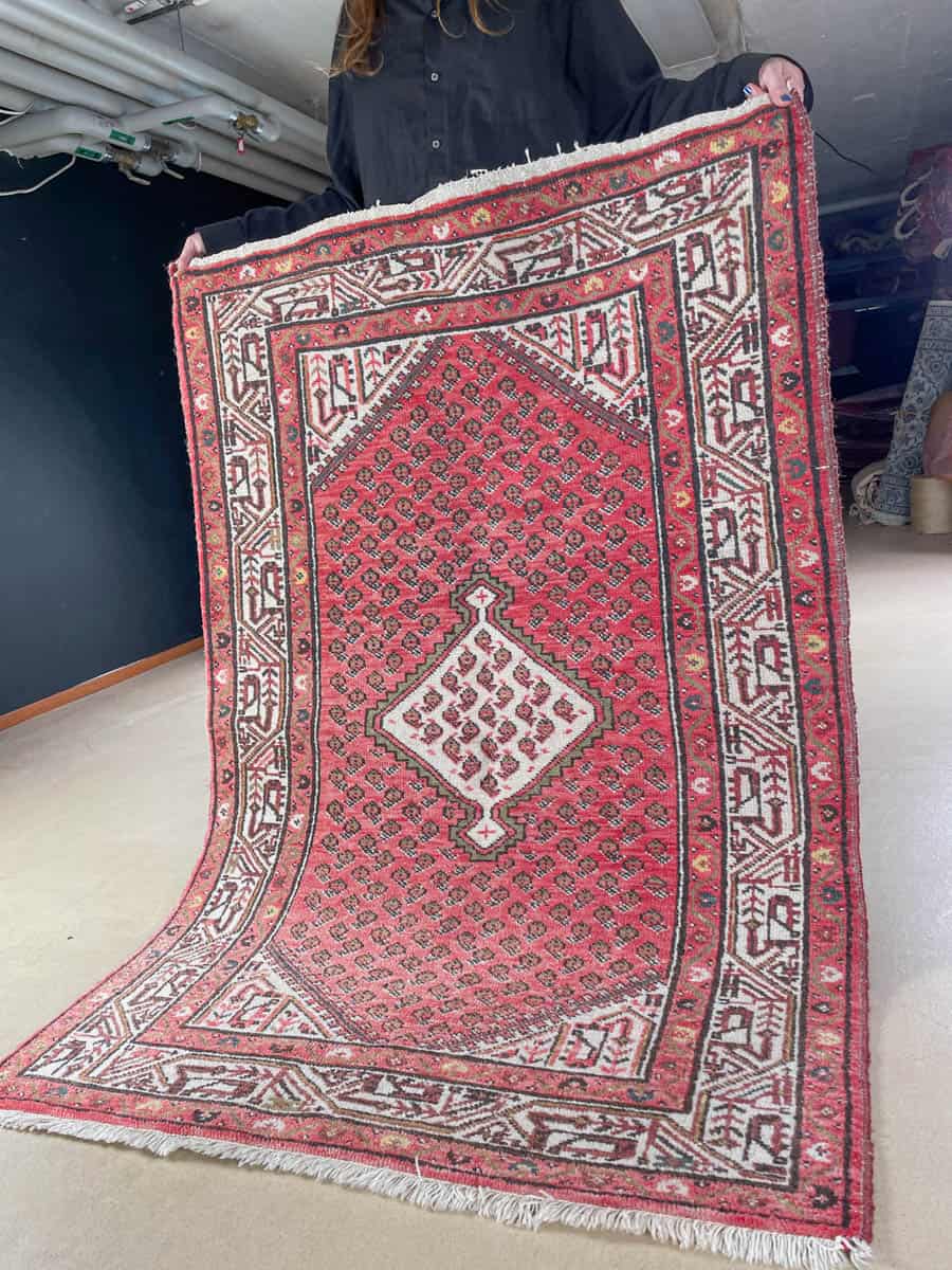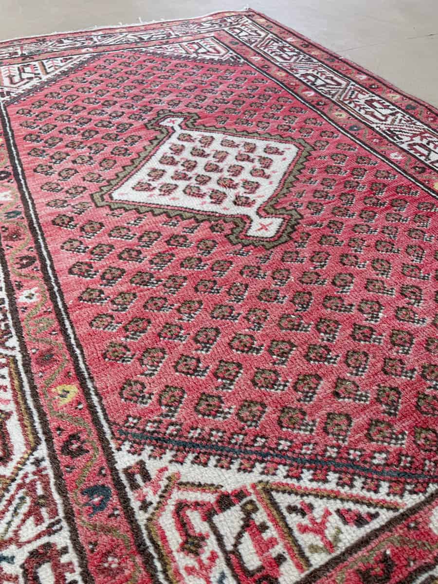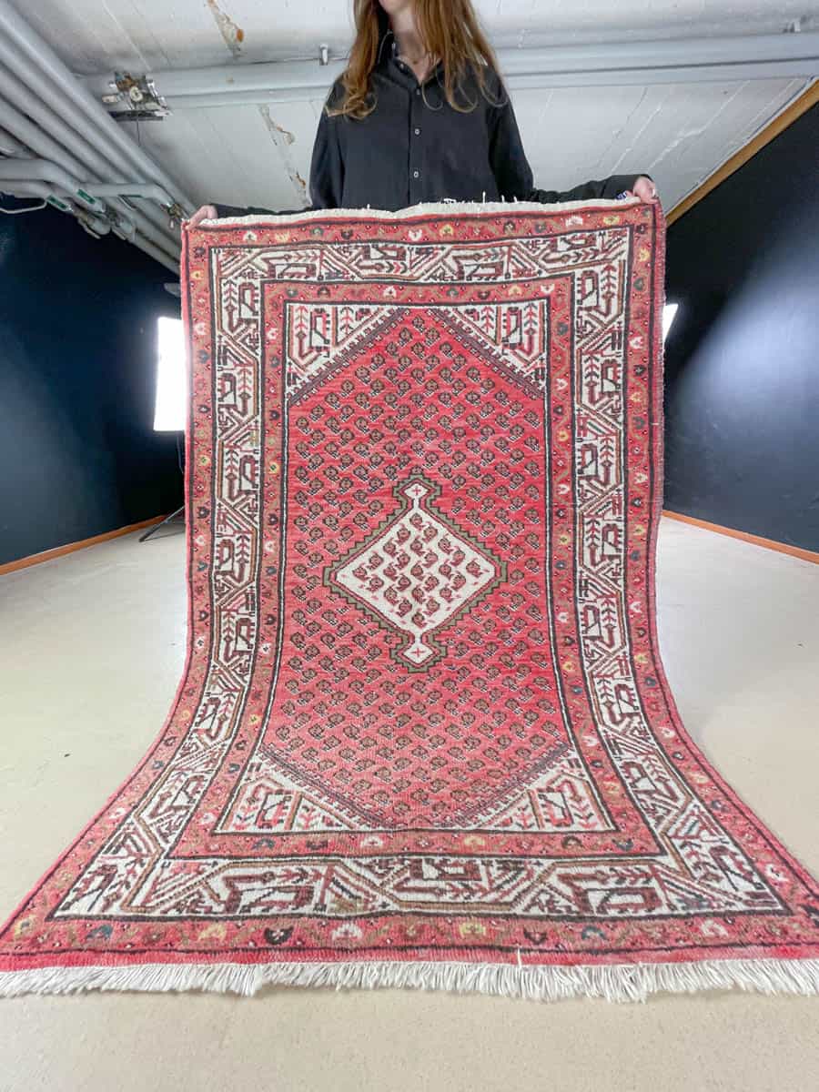 Perinteinen persialainen Sarouk Mir -matto, jossa hillityn punainen pohja ja keskimedaljonki.