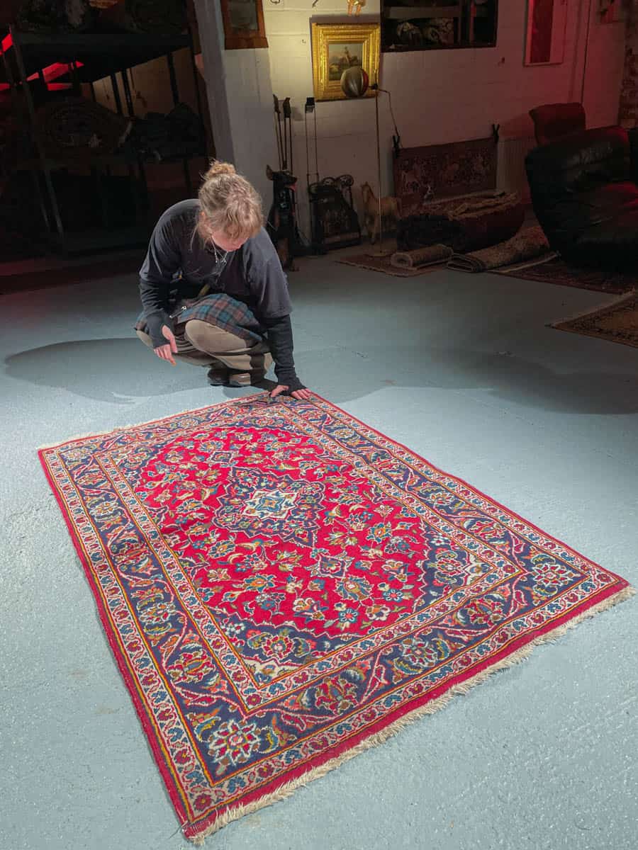 Upea Keshan kirkkaan värisellä pohjalla ja yksityiskohtaisilla kuvioinneilla. Käsinsolmittu villasta.