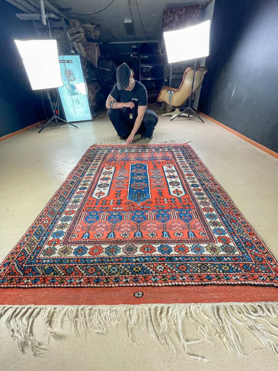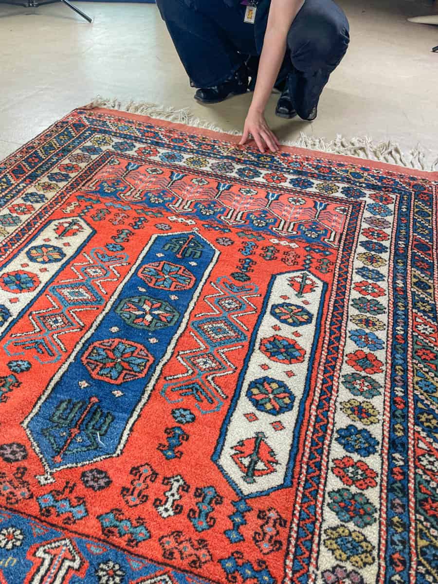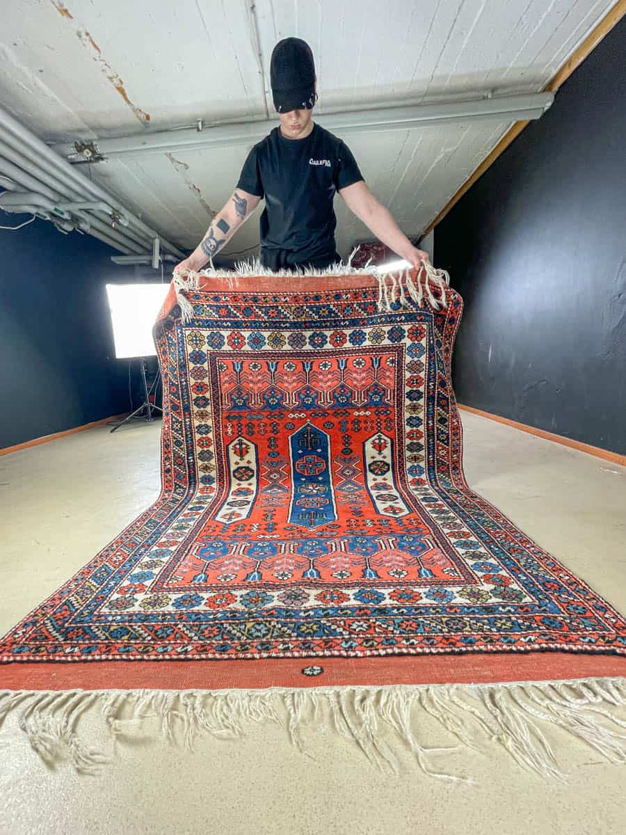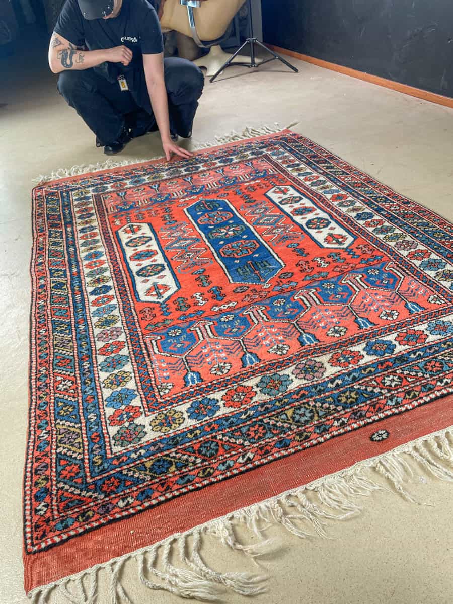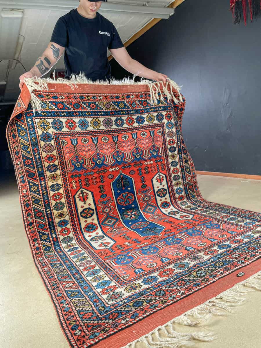 Tämä matto sijaitsee Galleriallamme osoitteessa Kankurinkatu 7, Punavuori – jos haluat tulla katsomaan sitä paikan päälle, sovithan näytön viestitse tai puhelimitse.