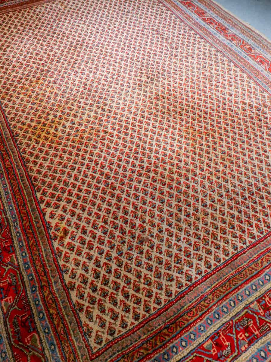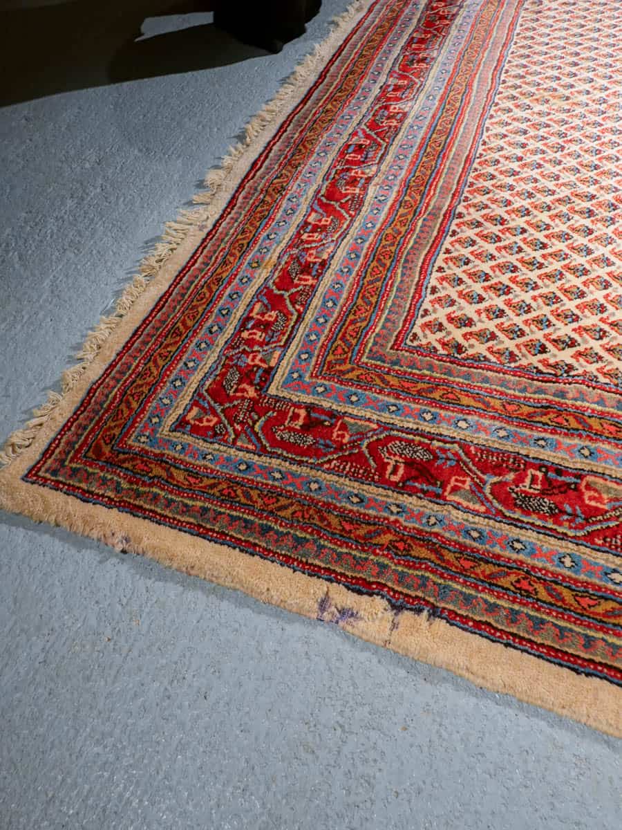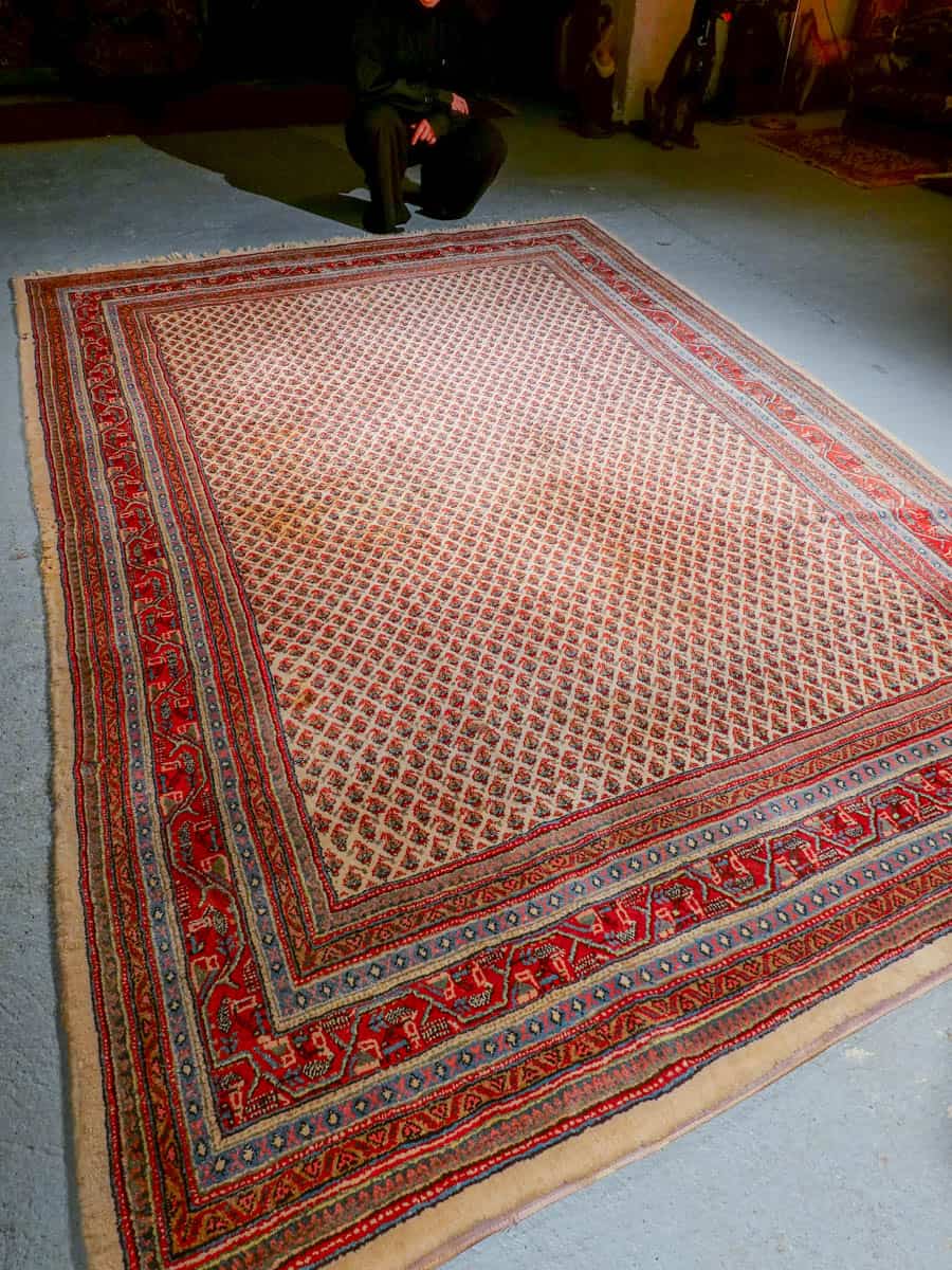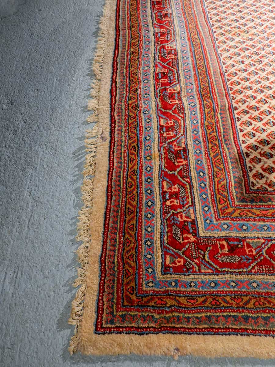 Perinteinen käsinsolmittu persialainen Sarouk Mir -villamatto vaalealla taustavärillä.