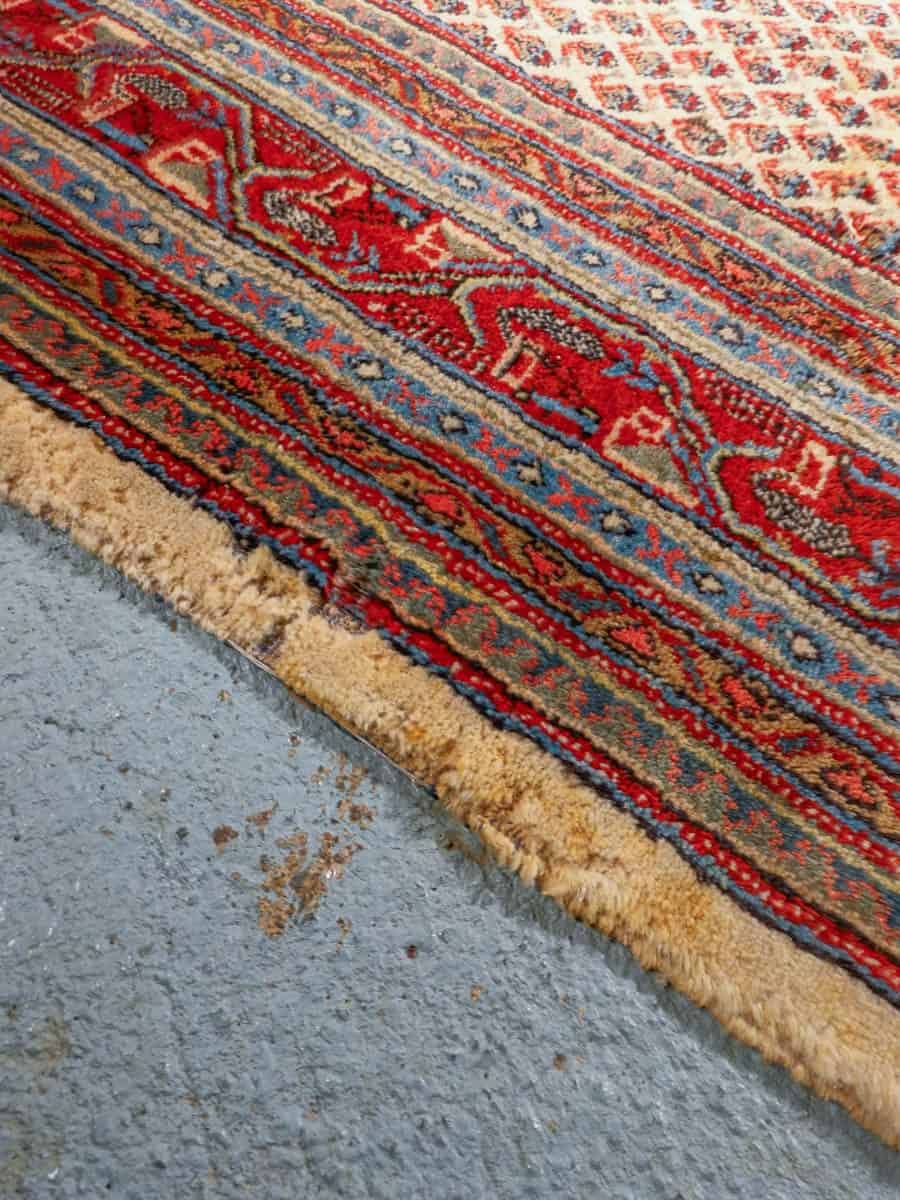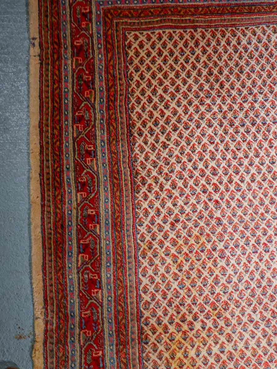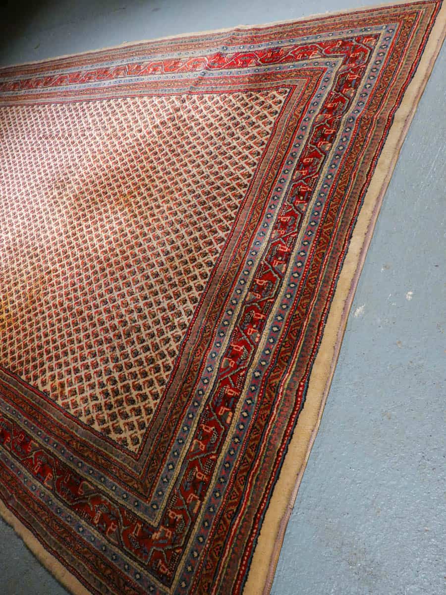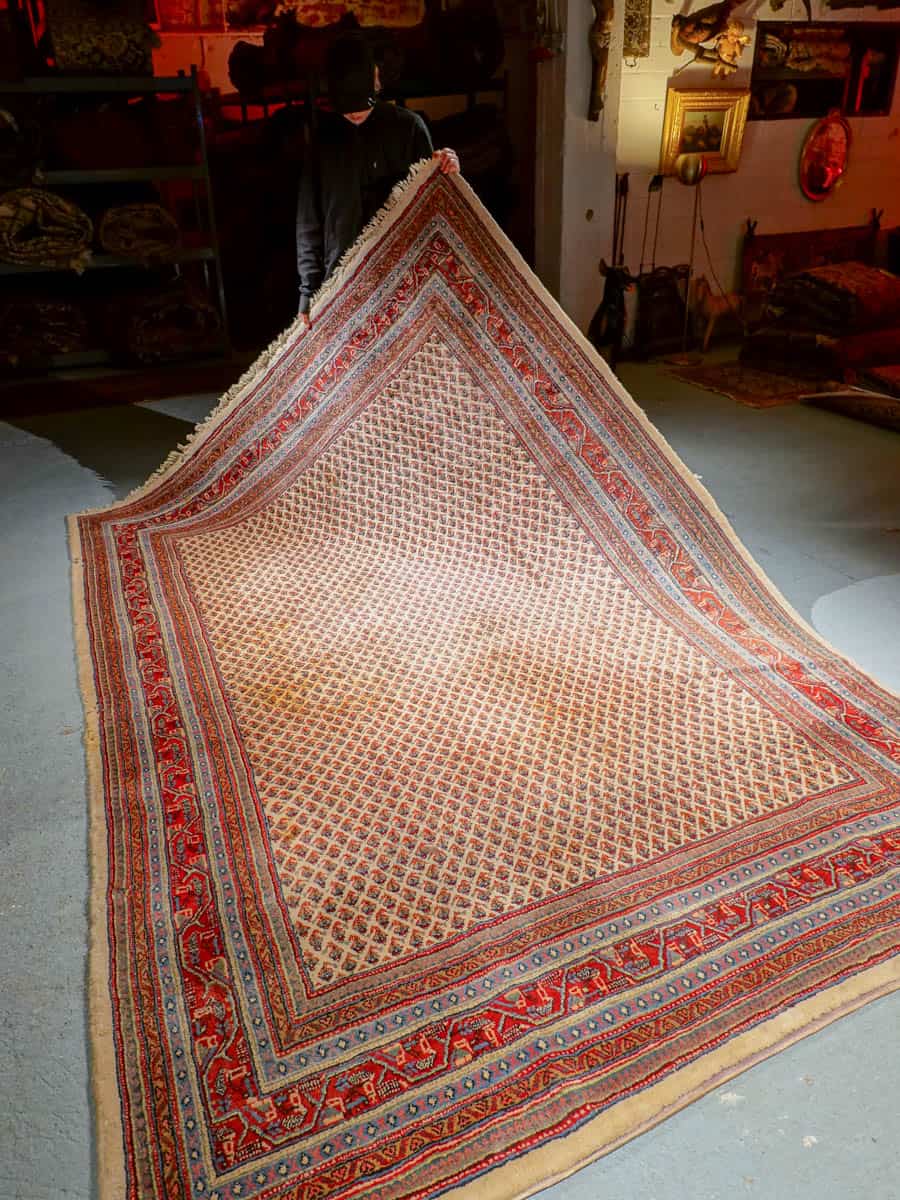 Perinteinen käsinsolmittu persialainen Sarouk Mir -villamatto vaalealla taustavärillä.