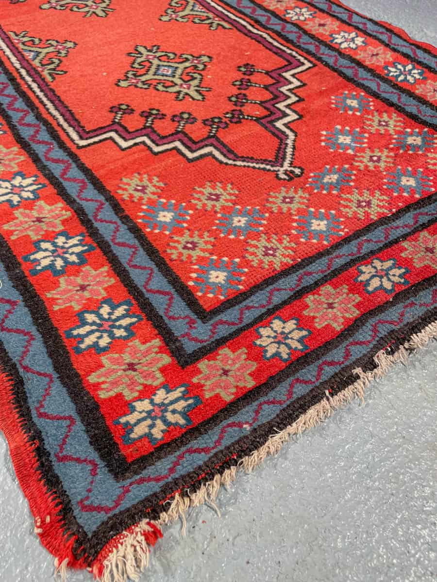 Pieni 1Hamadan geometrisella kuvioinnilla ja pirteillä väreillä. Käsinsolmittu villasta.