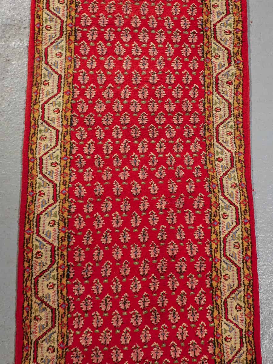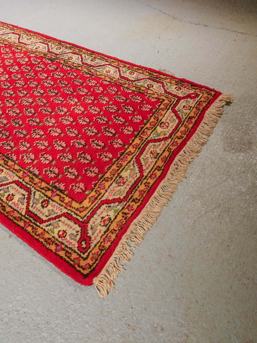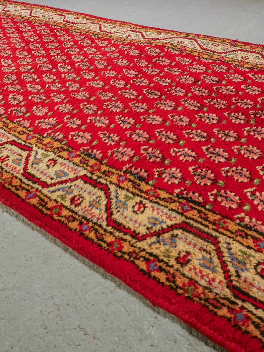 Upean punainen perinteiseen persialaiseen Sarouk Mir-tyyliin villasta käsinsolmittu käytävämatto.