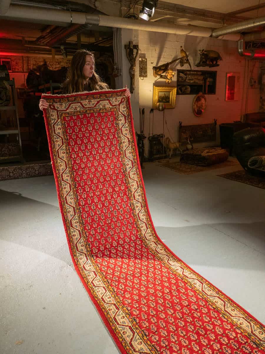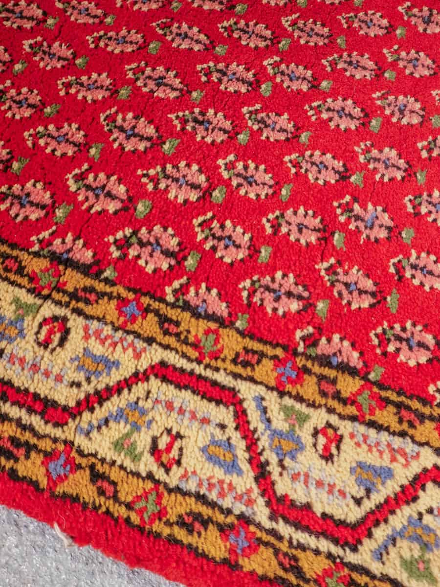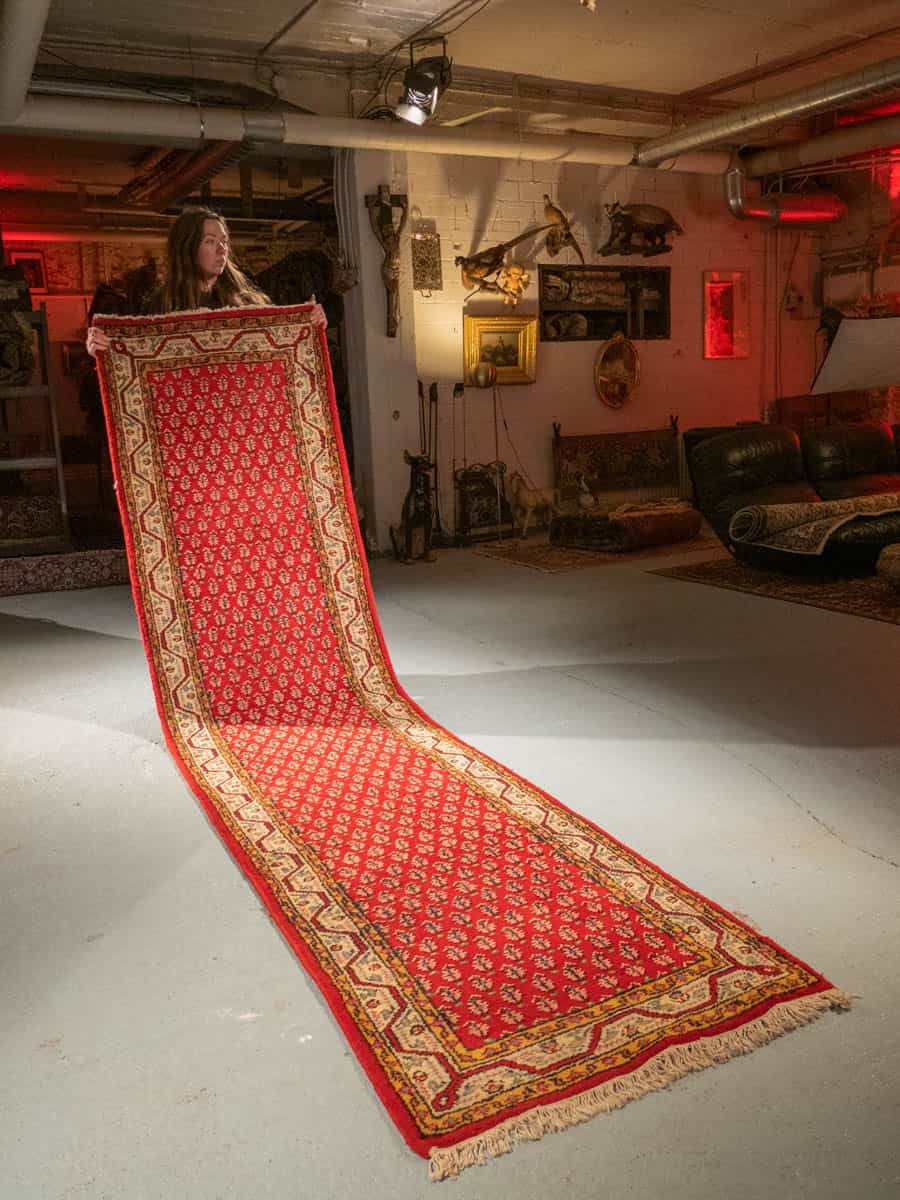 Upean punainen perinteiseen persialaiseen Sarouk Mir-tyyliin villasta käsinsolmittu käytävämatto.