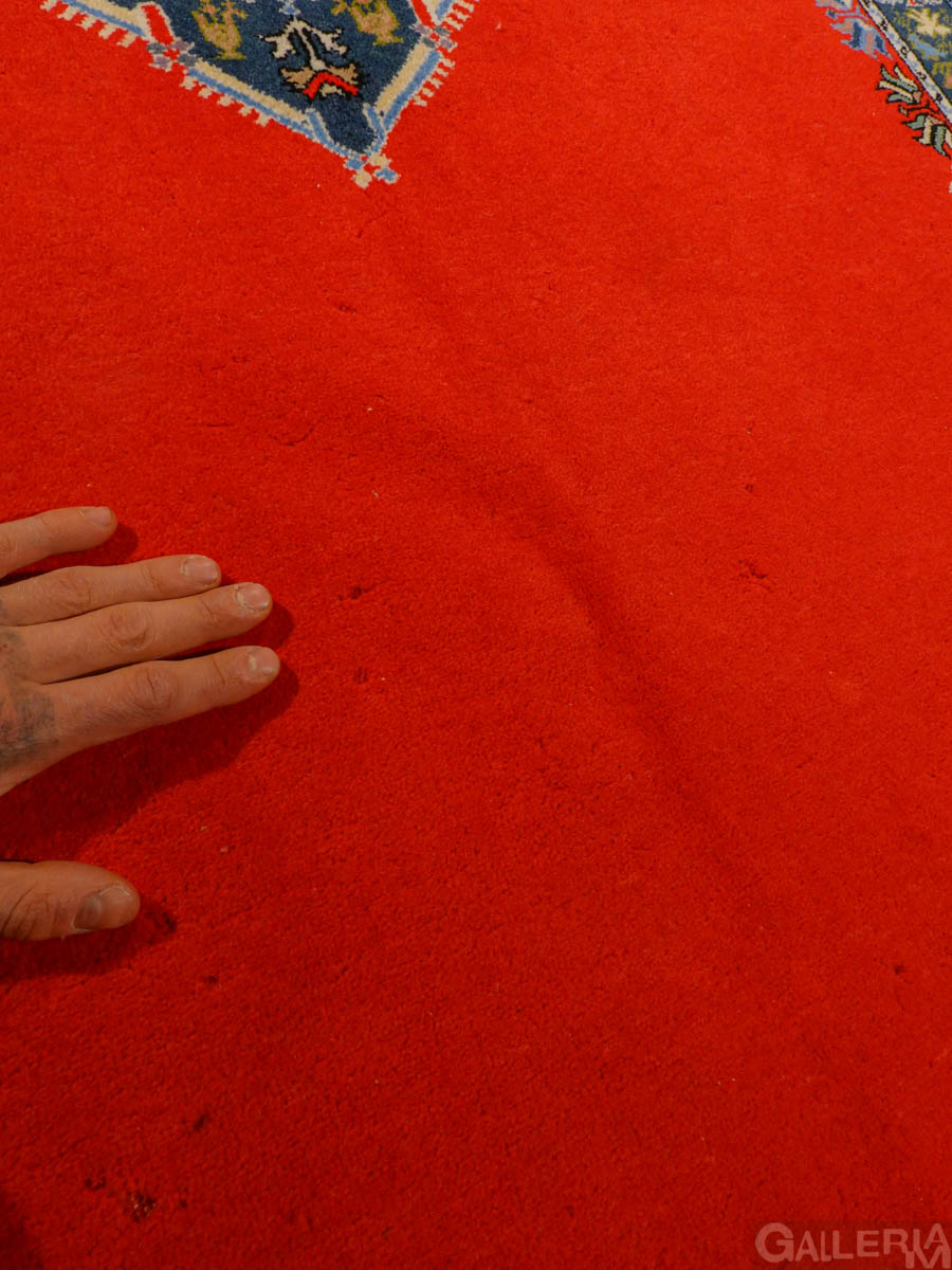 Minimalistinen Rabat hallitsevan punaisella keskikentällä ja hillityllä kuvioinnilla. Käsinsolmittu villasta.