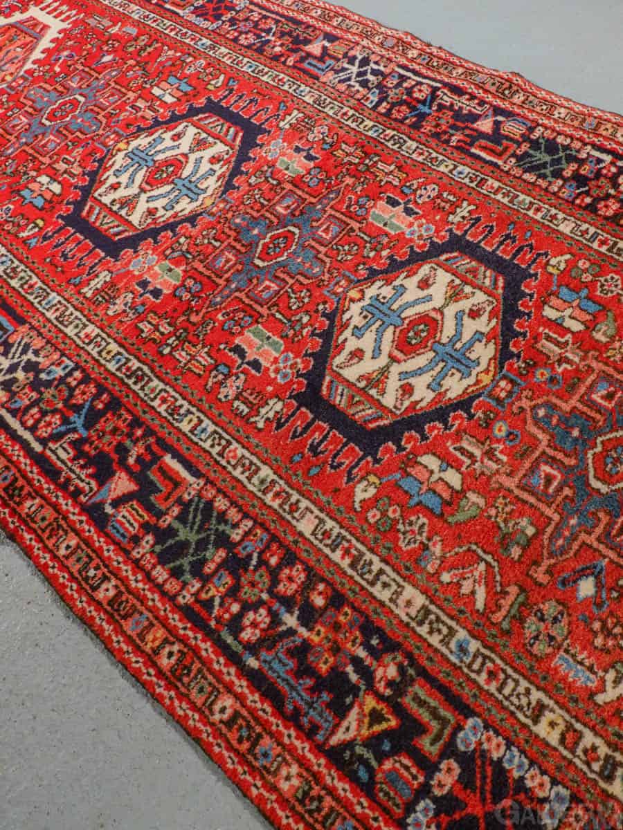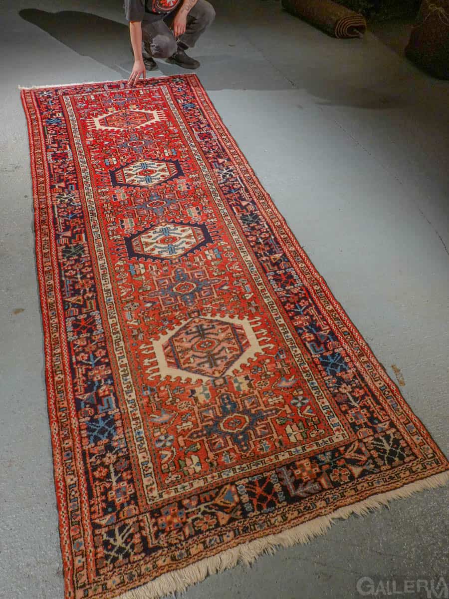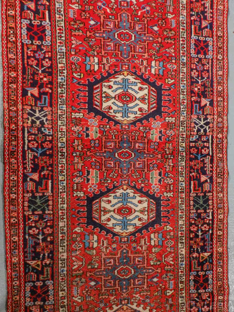 Aiutlaatuinen ja värimaailmaltaan kauniin rauhallinen Heriz-käytävämatto geometrisilla medaljonkikuvioinneilla.