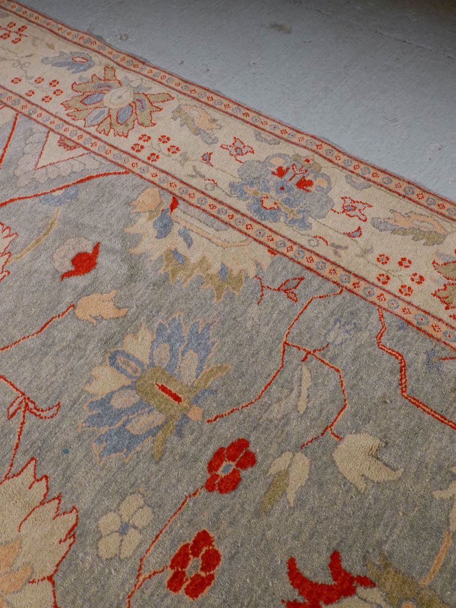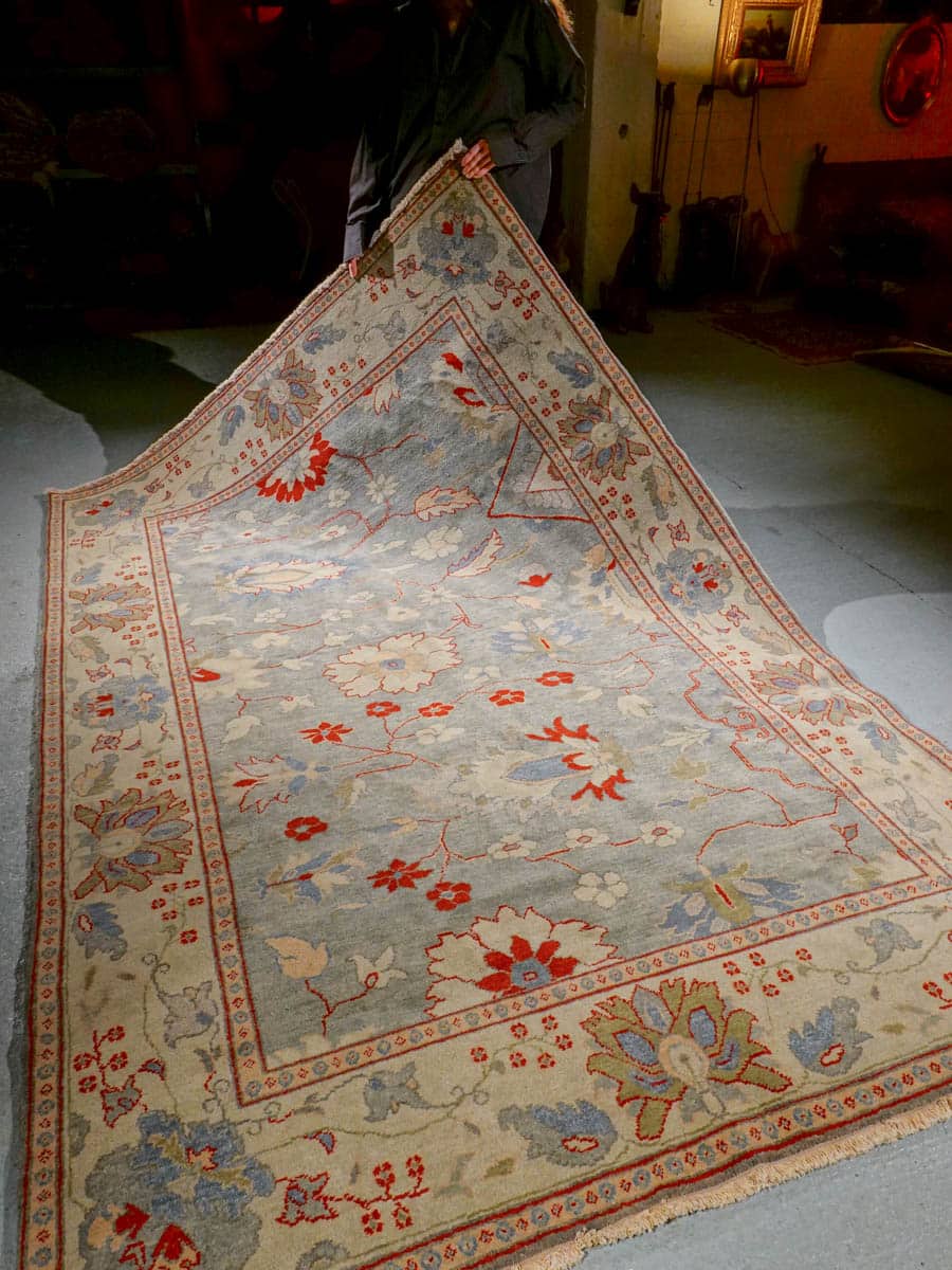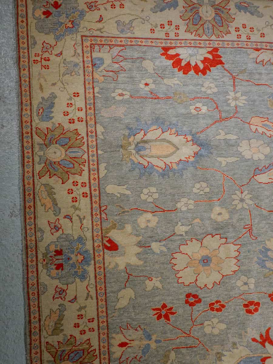 Kauniin pastellinen Ziegler perinteisellä kuvioinnilla. Pehmeän sininen värimaailma, jossa punaiset aksentit eivät anna mielenkiinnon kaikota.