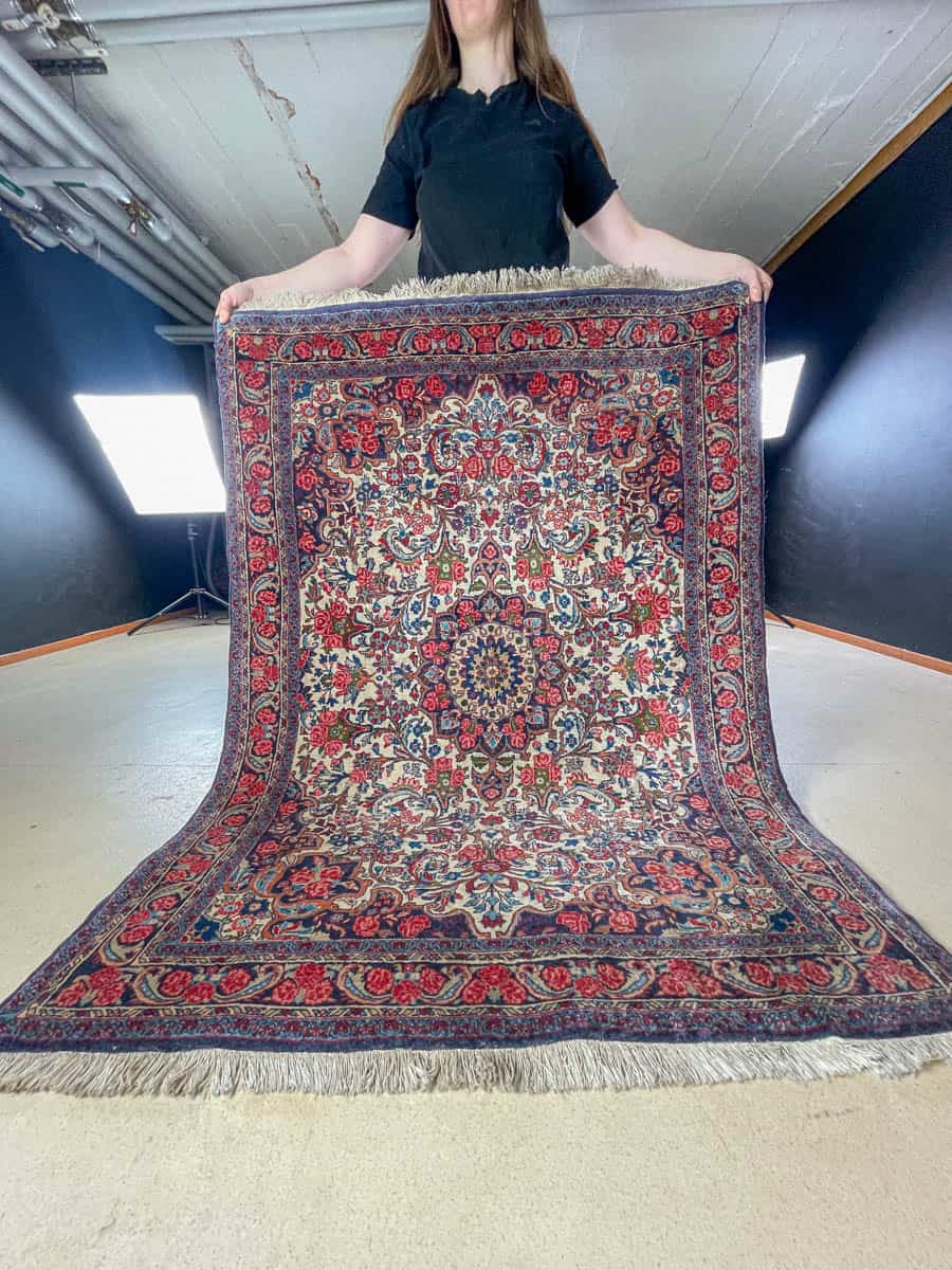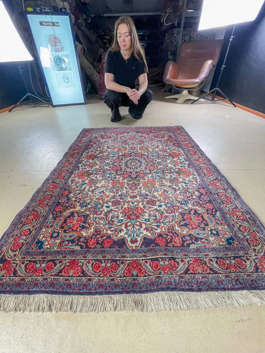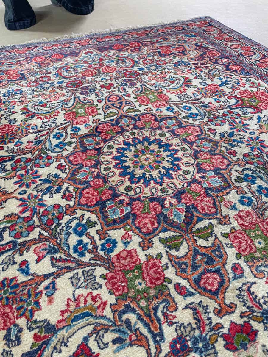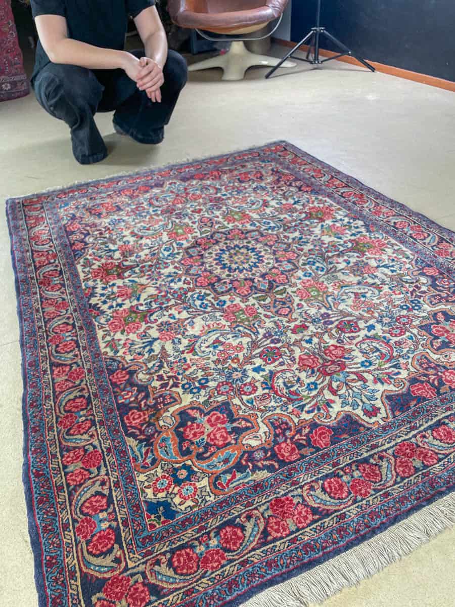 Tämä matto sijaitsee Töölön varastollamme – jos haluat tulla katsomaan sitä paikan päälle, sovithan näytön viestitse tai puhelimitse.