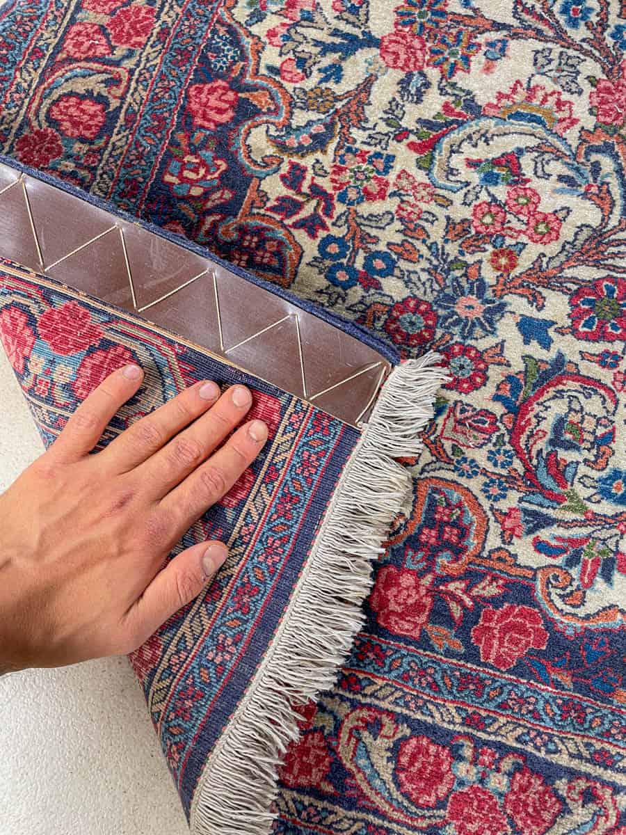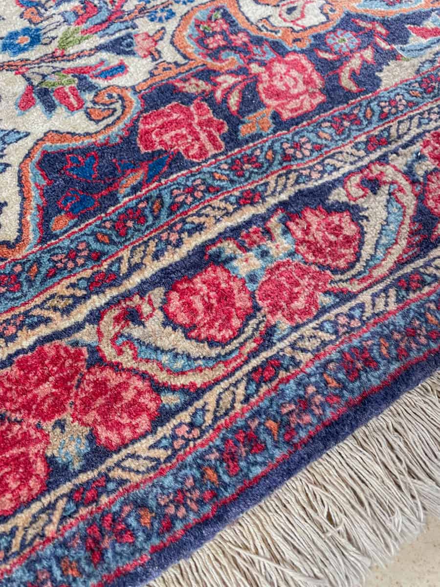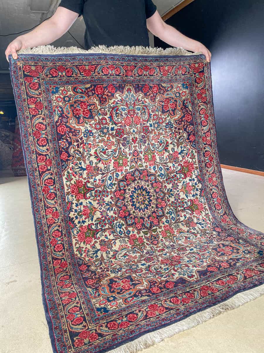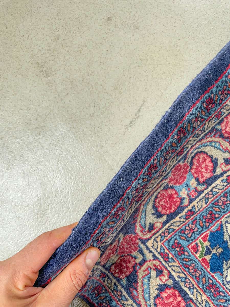 Tämä matto sijaitsee Töölön varastollamme – jos haluat tulla katsomaan sitä paikan päälle, sovithan näytön viestitse tai puhelimitse.