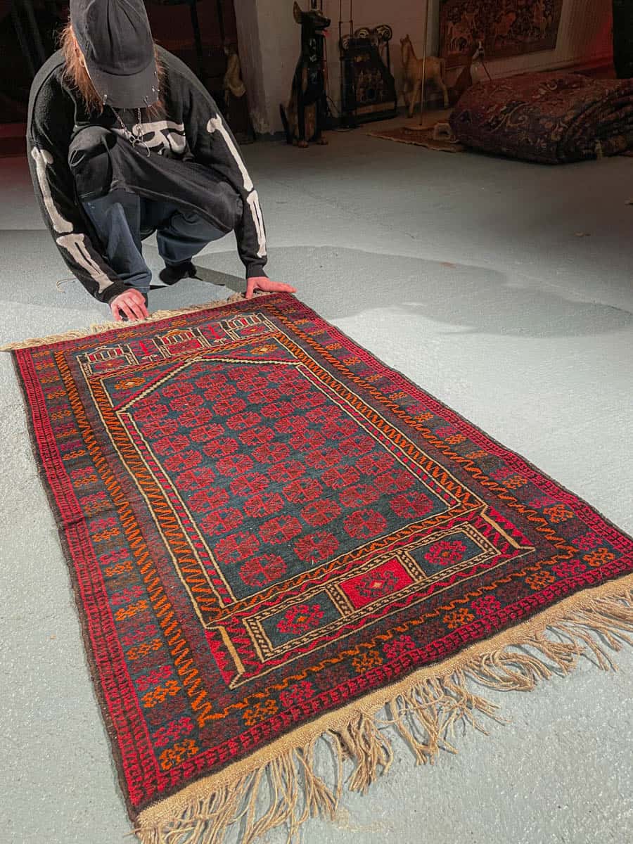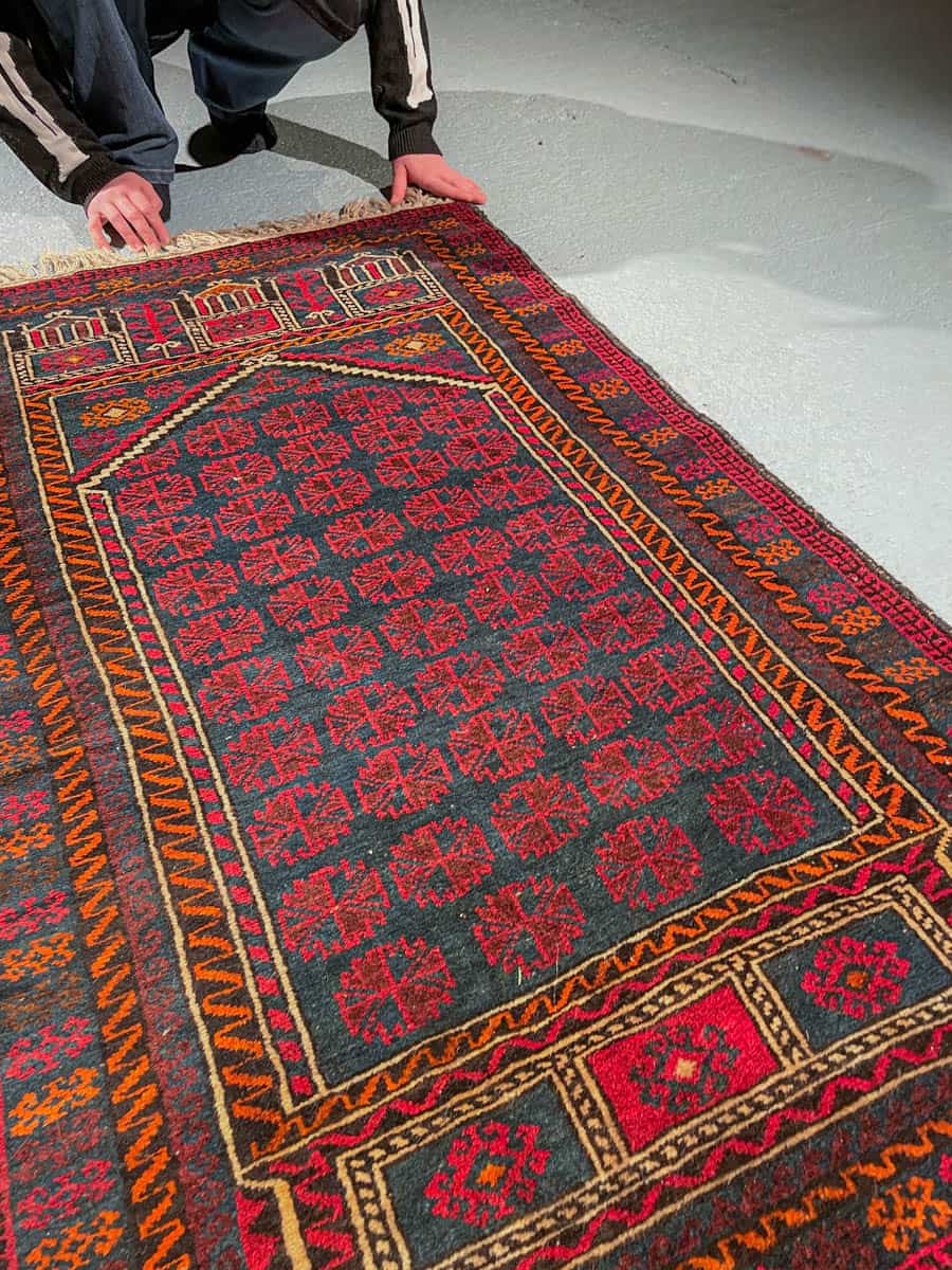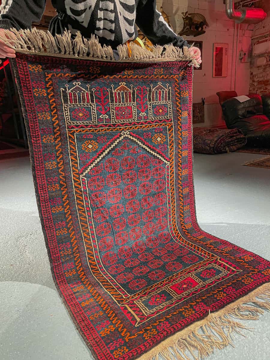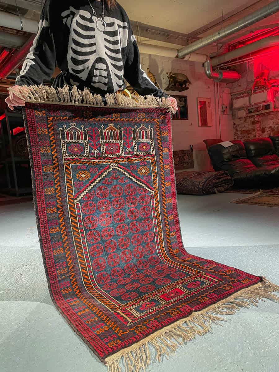 Käsinsolmittu villasta villaloimelle n. 1960-luvulla perinteiseen persialaiseen Balutsi-tyyliin. Tunnelmallinen väriteema.