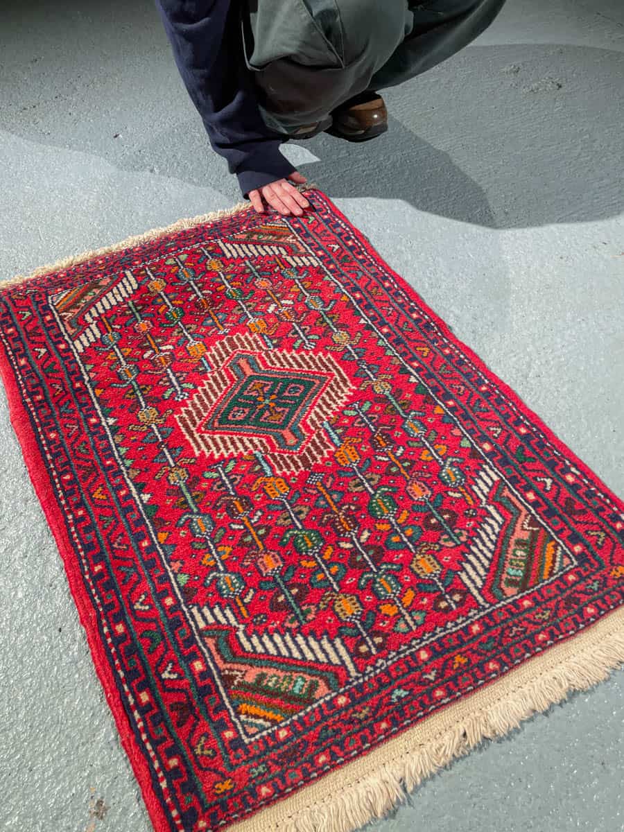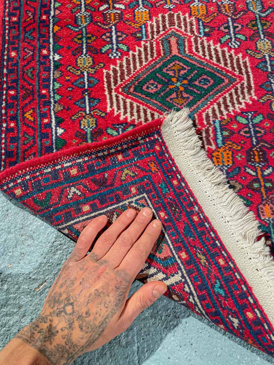 Geometrinen Hamadan kirkaalla punaisen sävyllä ja perinteisellä kuvioinnilla. Käsinsolmittu villasta.