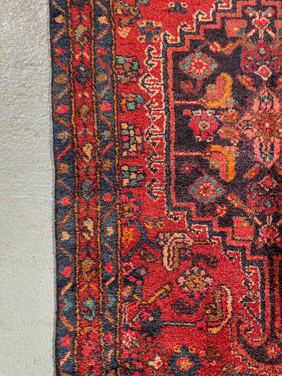Upean arvokas vintage-Hamadan yksityiskohtaisella geometrisella kuvioinnilla ja tunnelmallisella väriteemalla. Käsinsolmittu villasta n. 60 vuotta sitten.